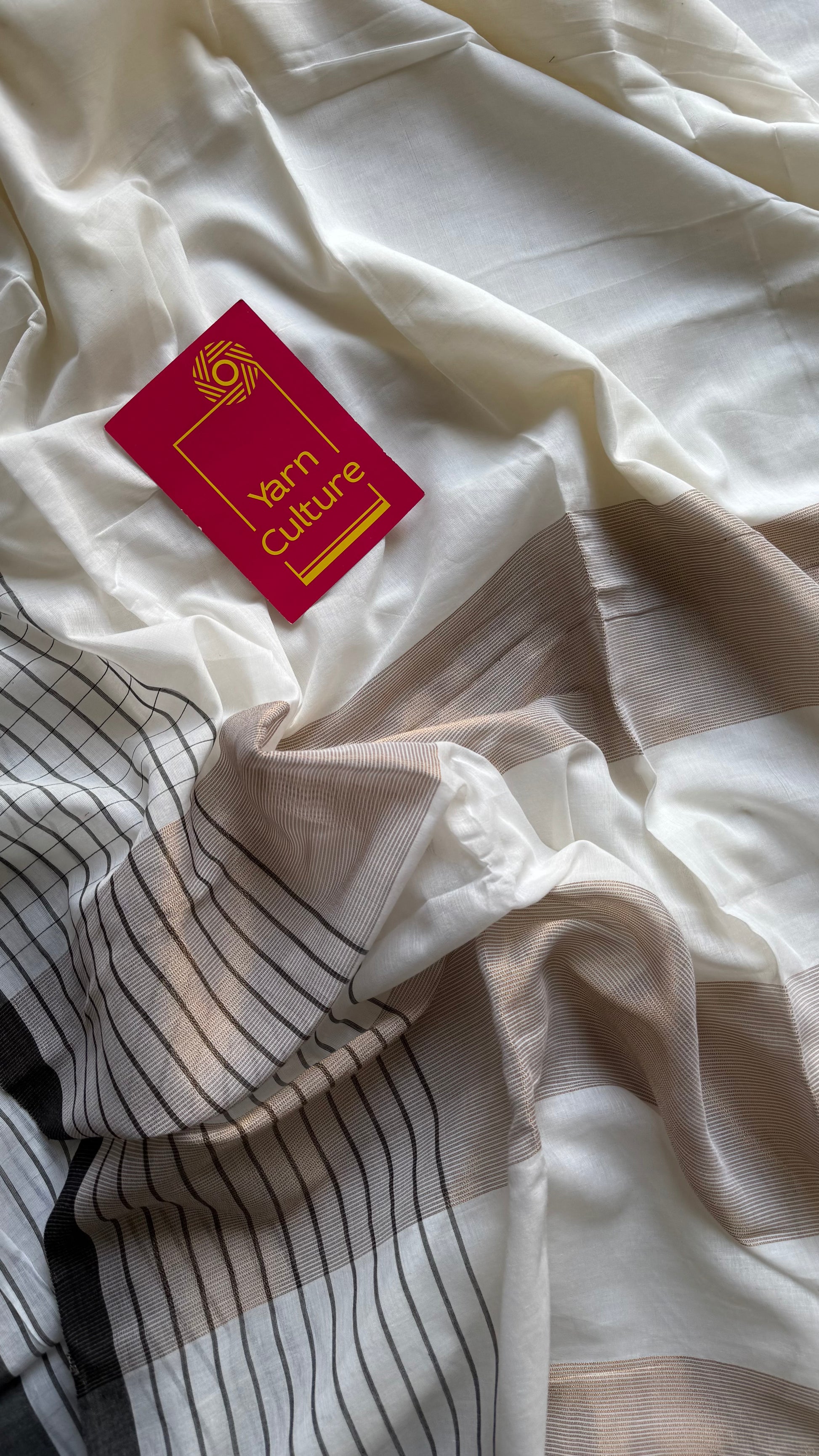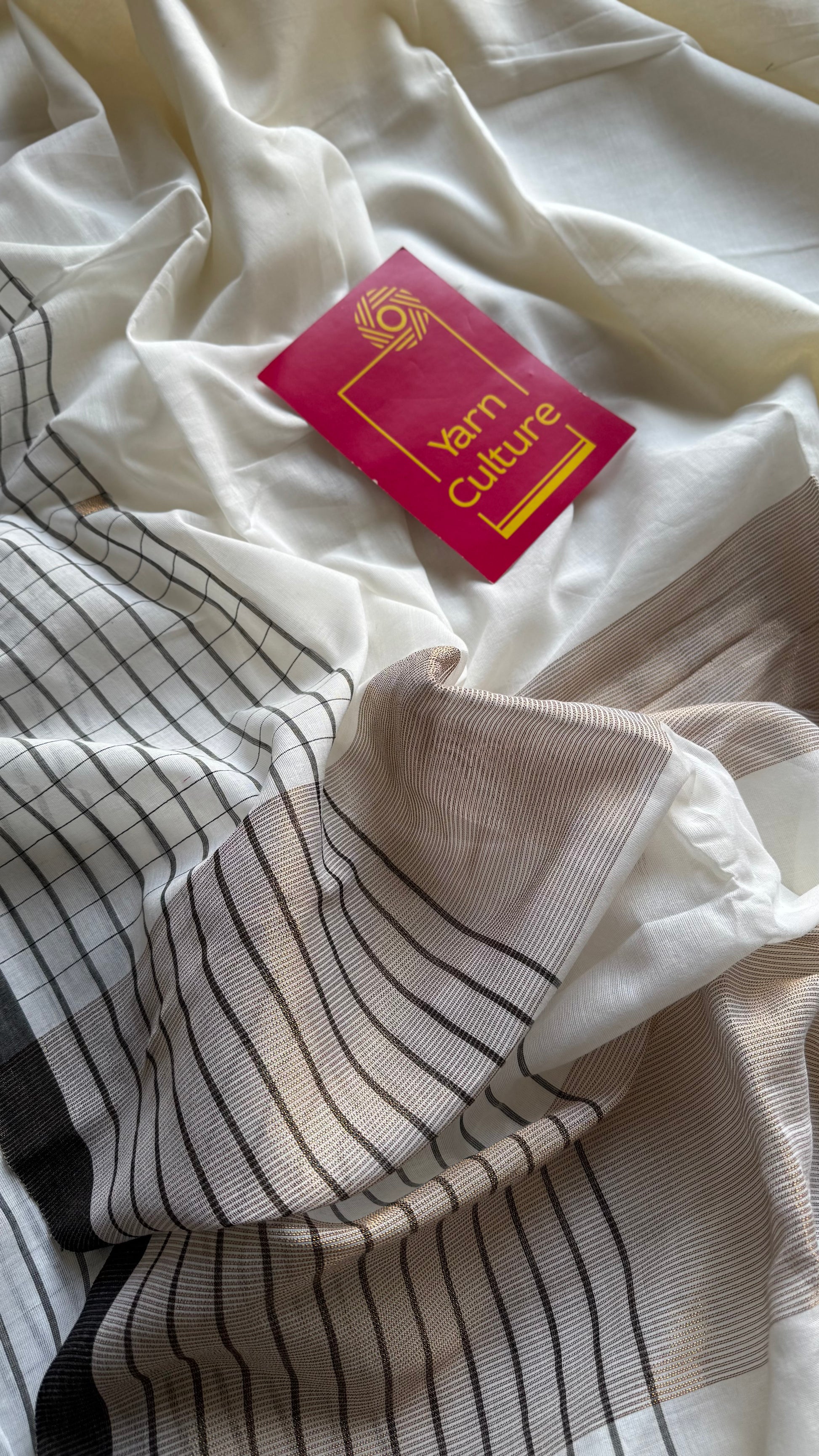 Ivory handloom mul saree with black checkered borders and antique gold buttas - YCBCMCFE170