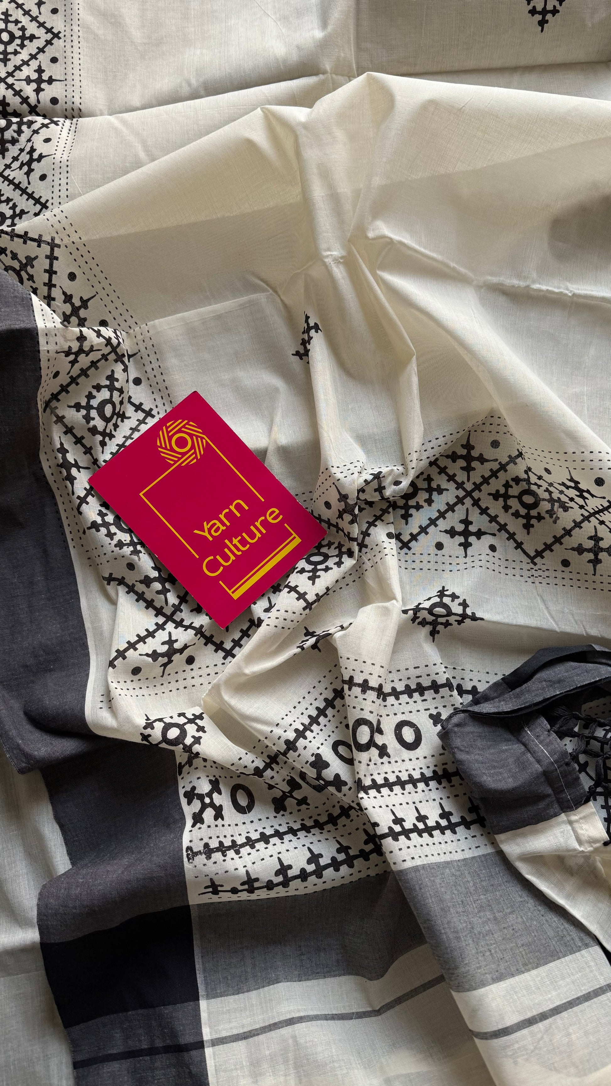 Ivory Kerala cotton saree with black Kutch-inspired printed borders and black centre pleats - YCIEKCFE312