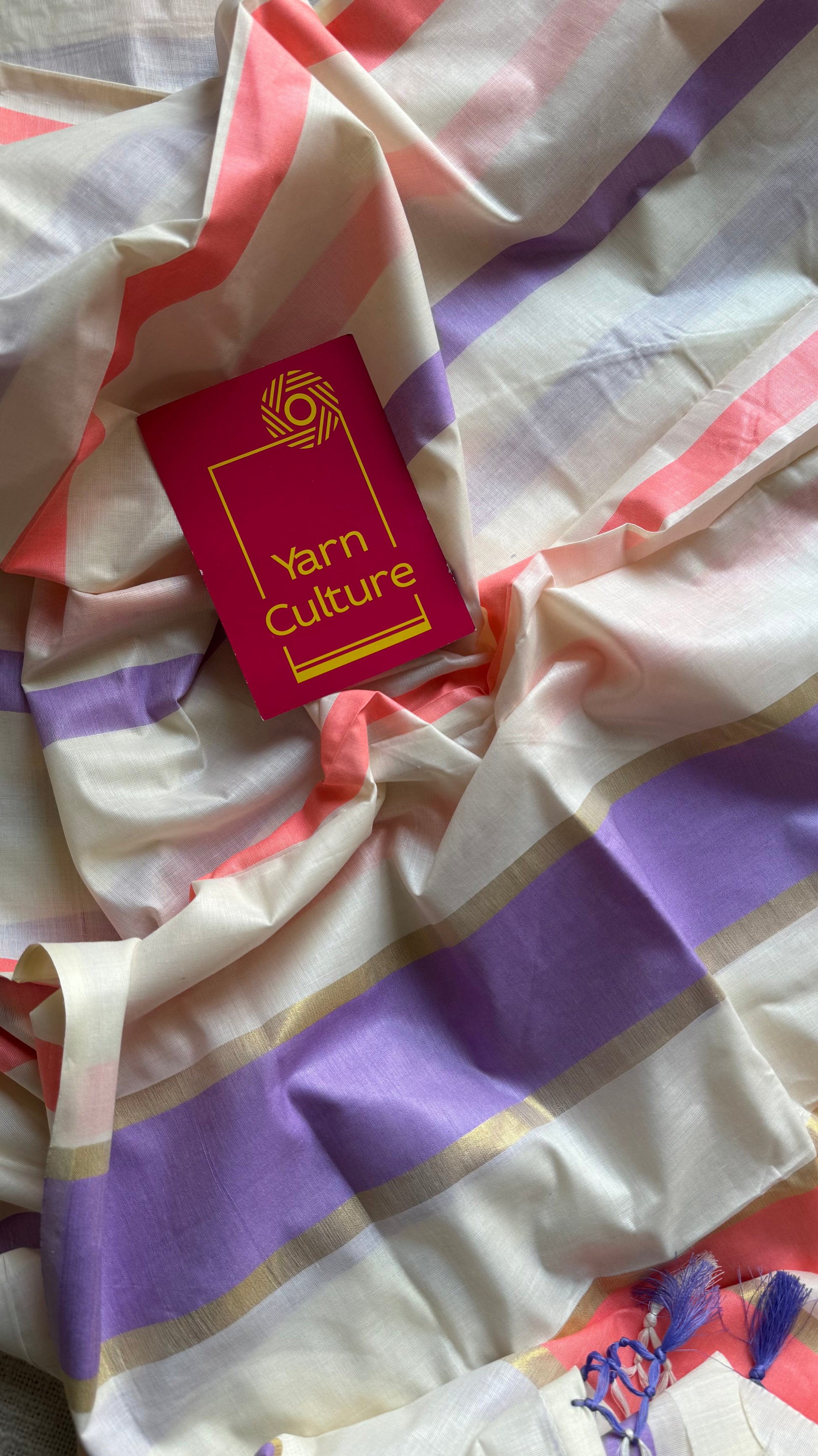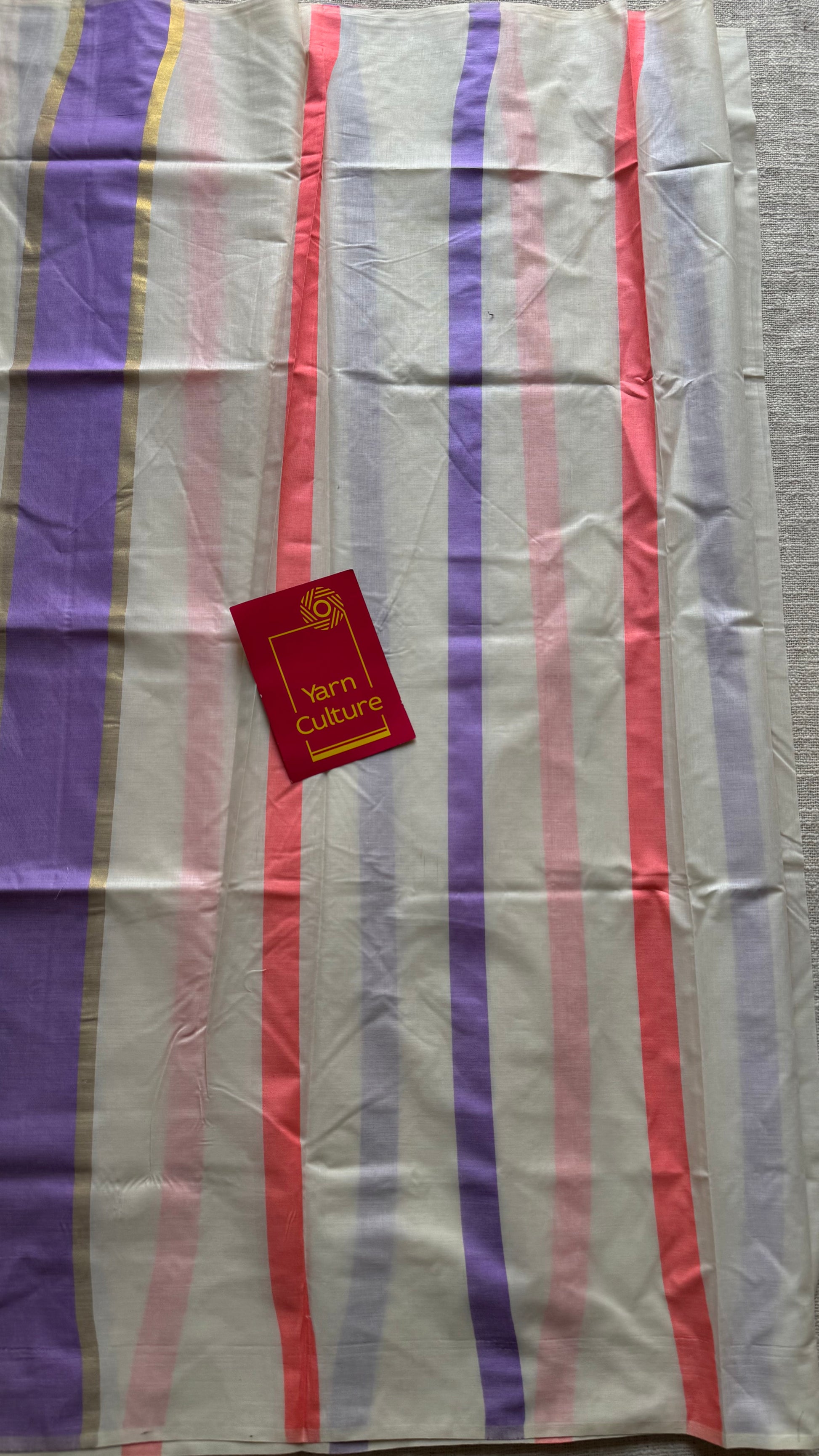 Ivory Kerala cotton saree featuring lilac and peach stripes running across the body. The pallu has broader stripes highlighted with subtle gold stripes, adding a classic Kerala touch. Body and running blouse has narrower stripes.Ā