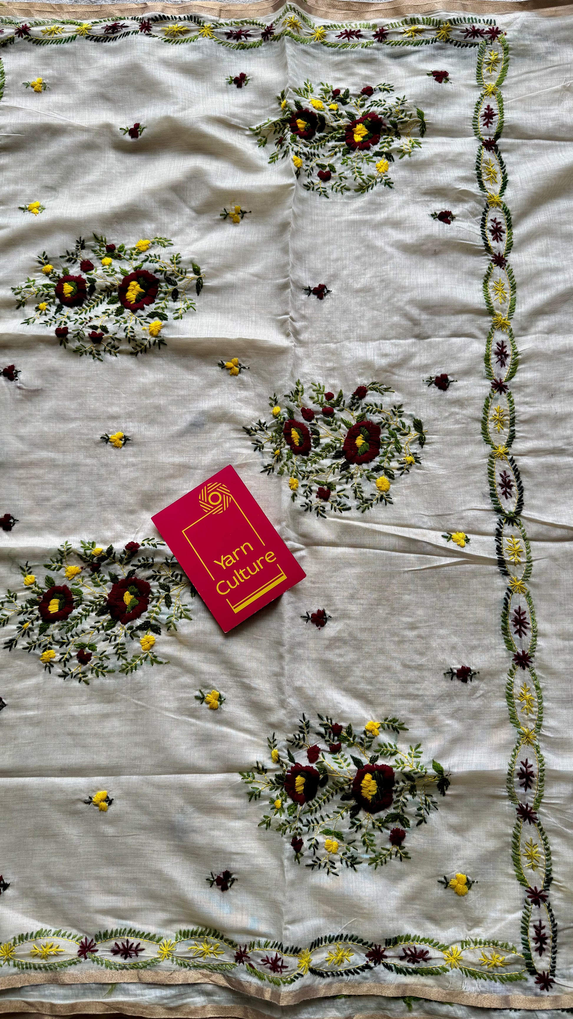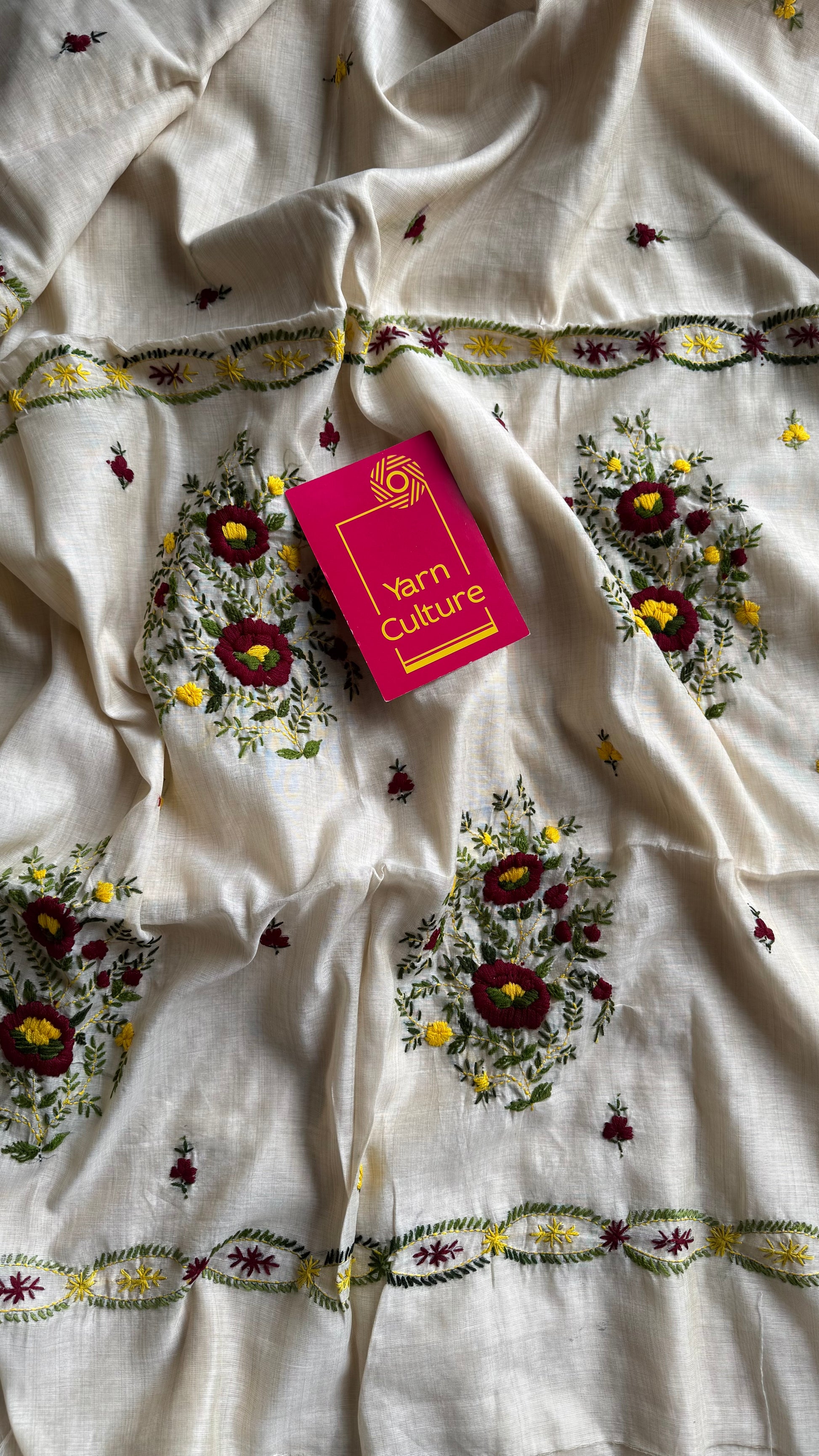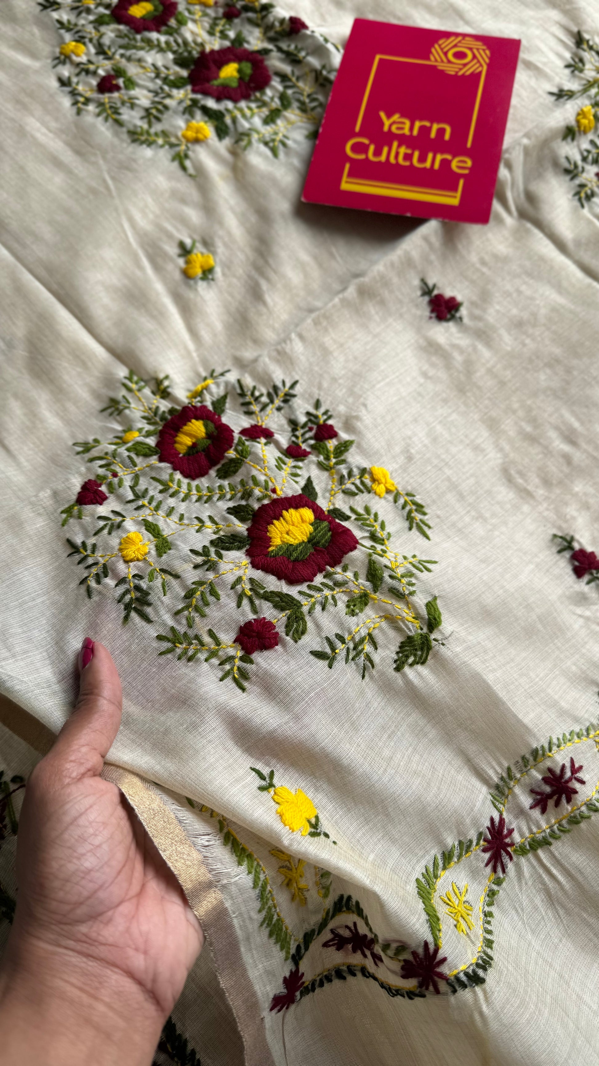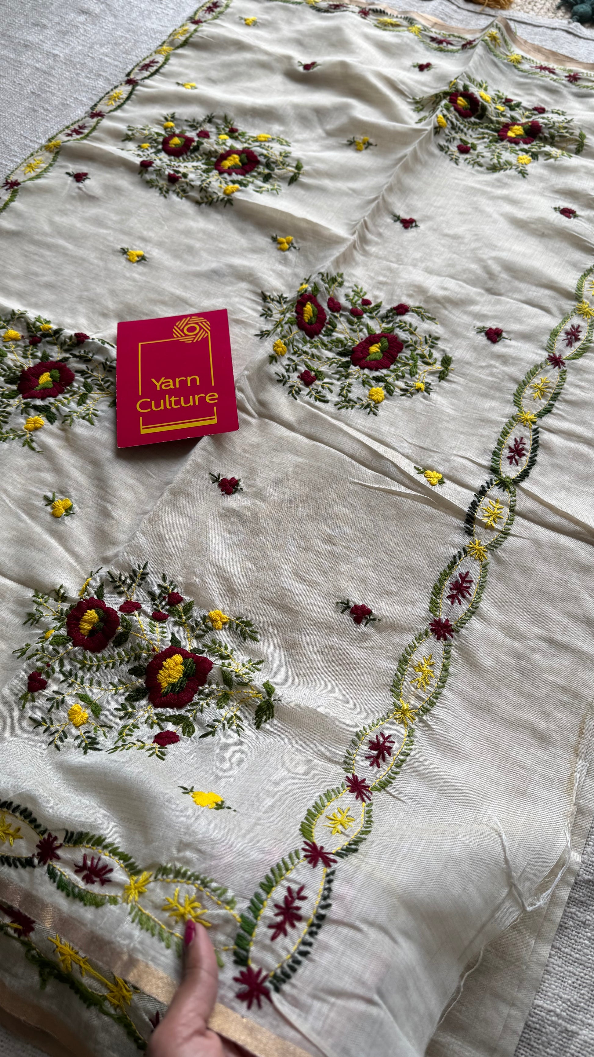 Ivory maheshwari cotton silk blend with maroon and dark yellow floral kantha threadwork and thin gold border, soft and easy to drape. Heavy work is on the pallu, followed by minimal thread motifs throughout the body.