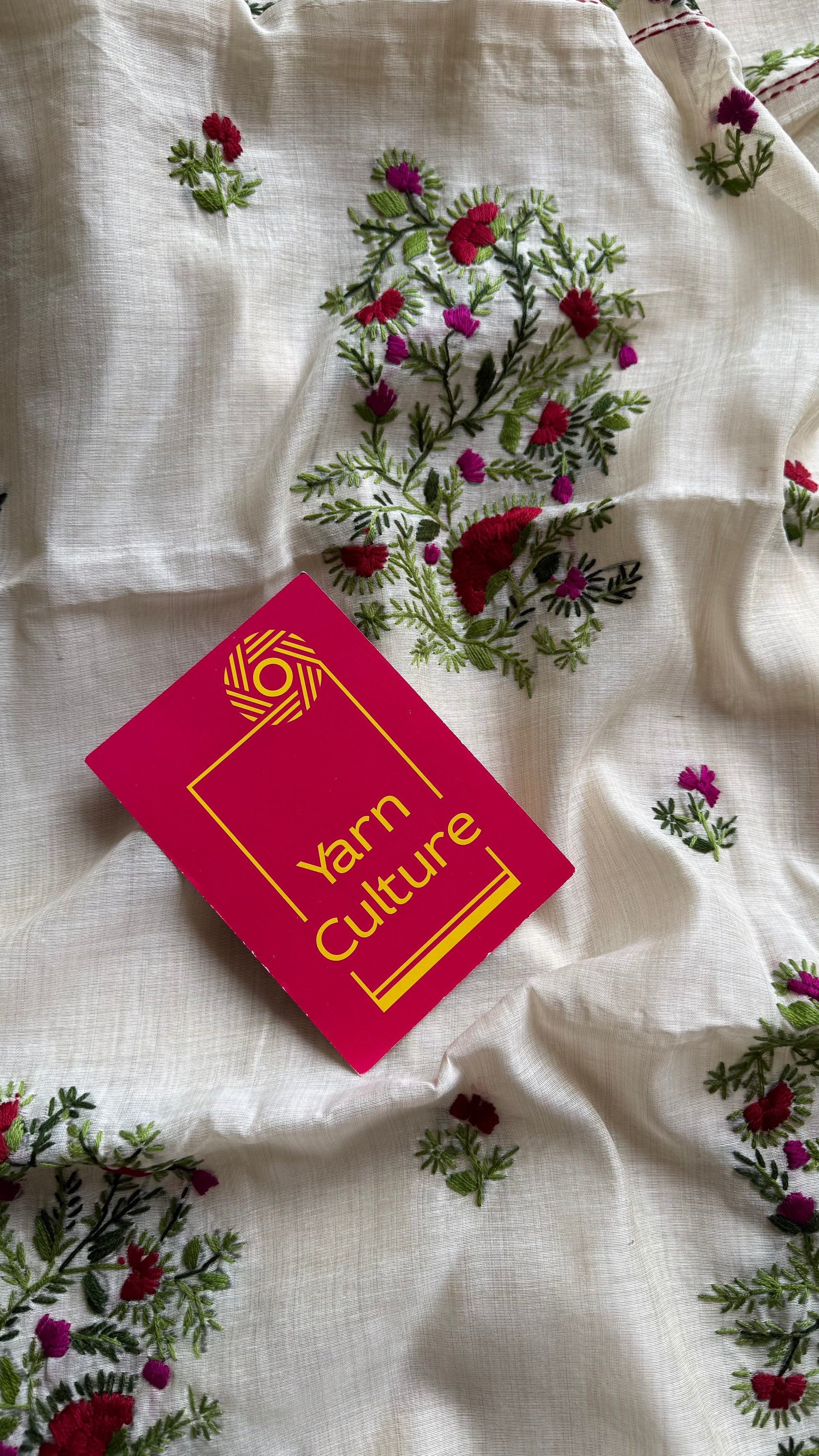 Ivory maheshwari cotton silk blend with red and magenta floral kantha threadwork - YCBLJULMK02