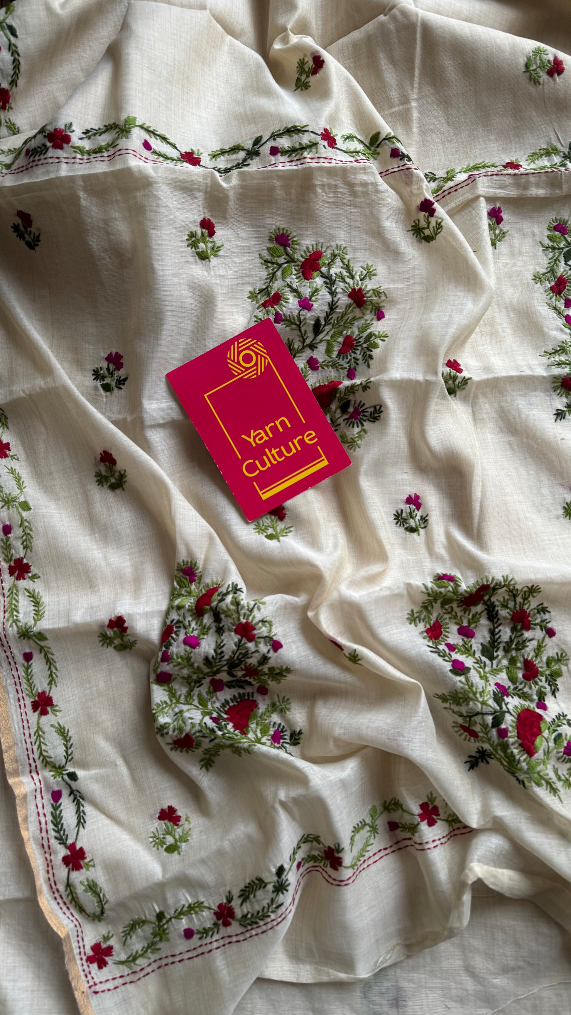 Ivory maheshwari cotton silk blend with red and magenta floral kantha threadwork and thin gold border, soft and easy to drape. Heavy work is on the pallu, followed by minimal thread motifs throughout the body.