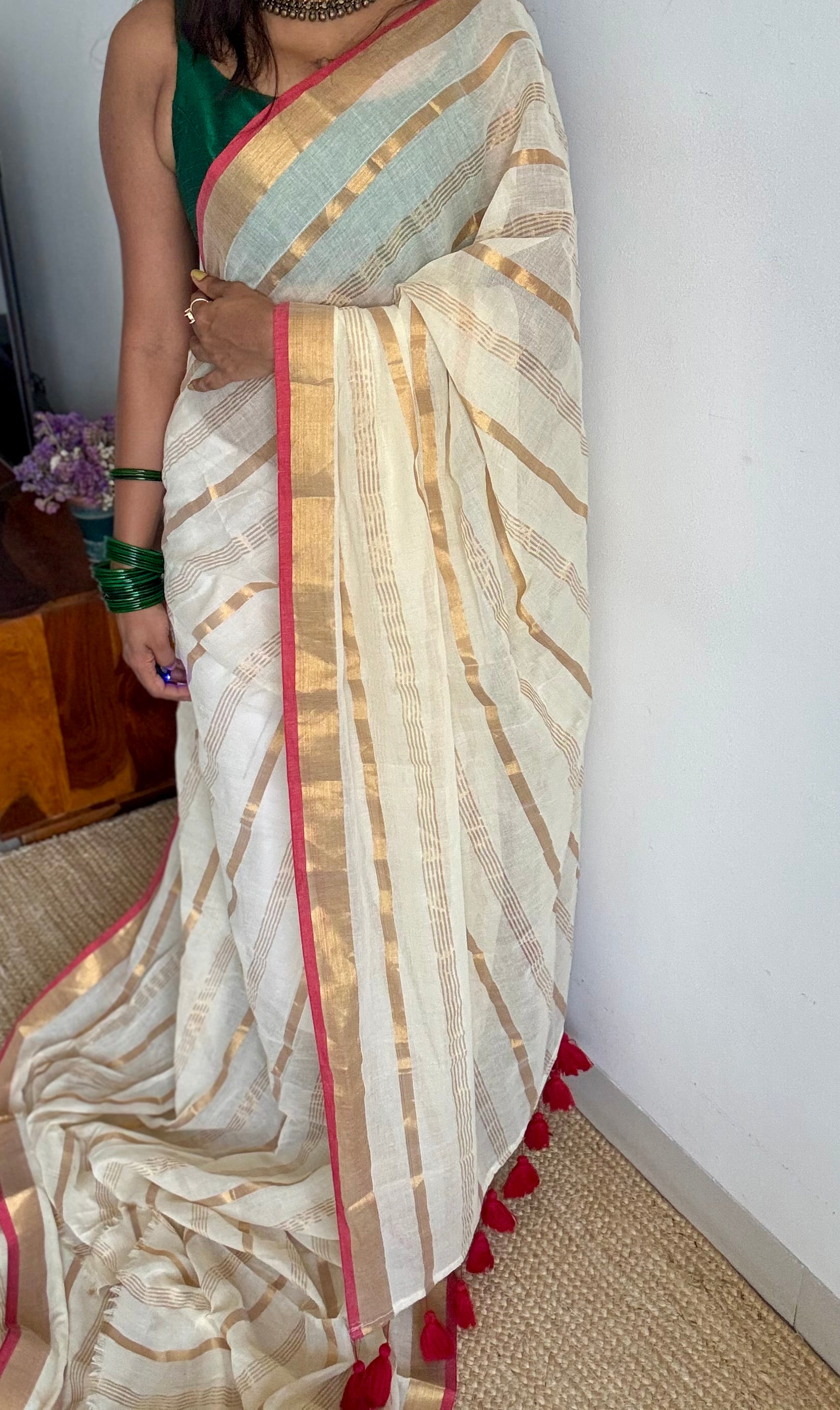 Ivory mul saree with gold stripes and red border, simple, lightweight, soft, easy to drape.Ā