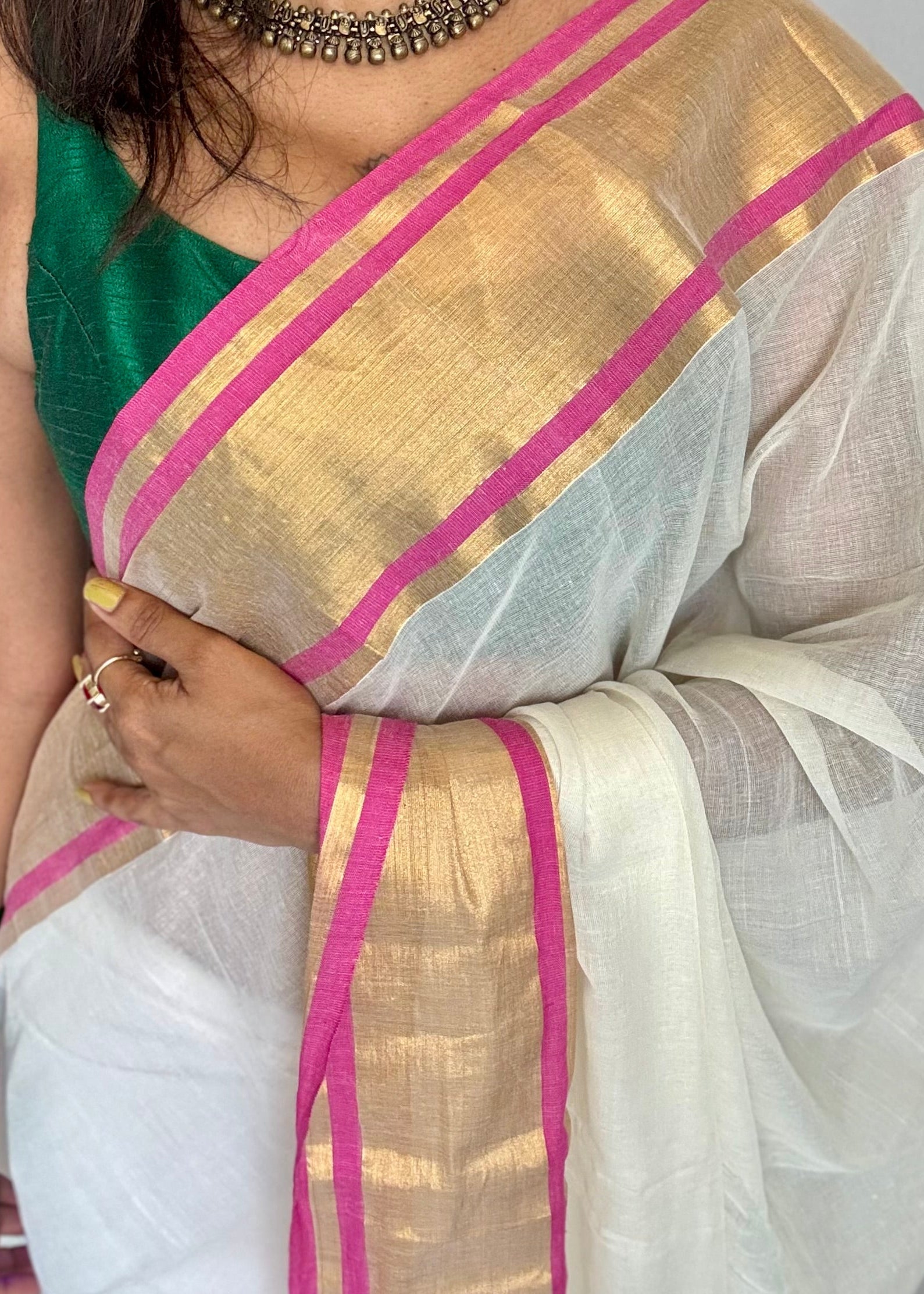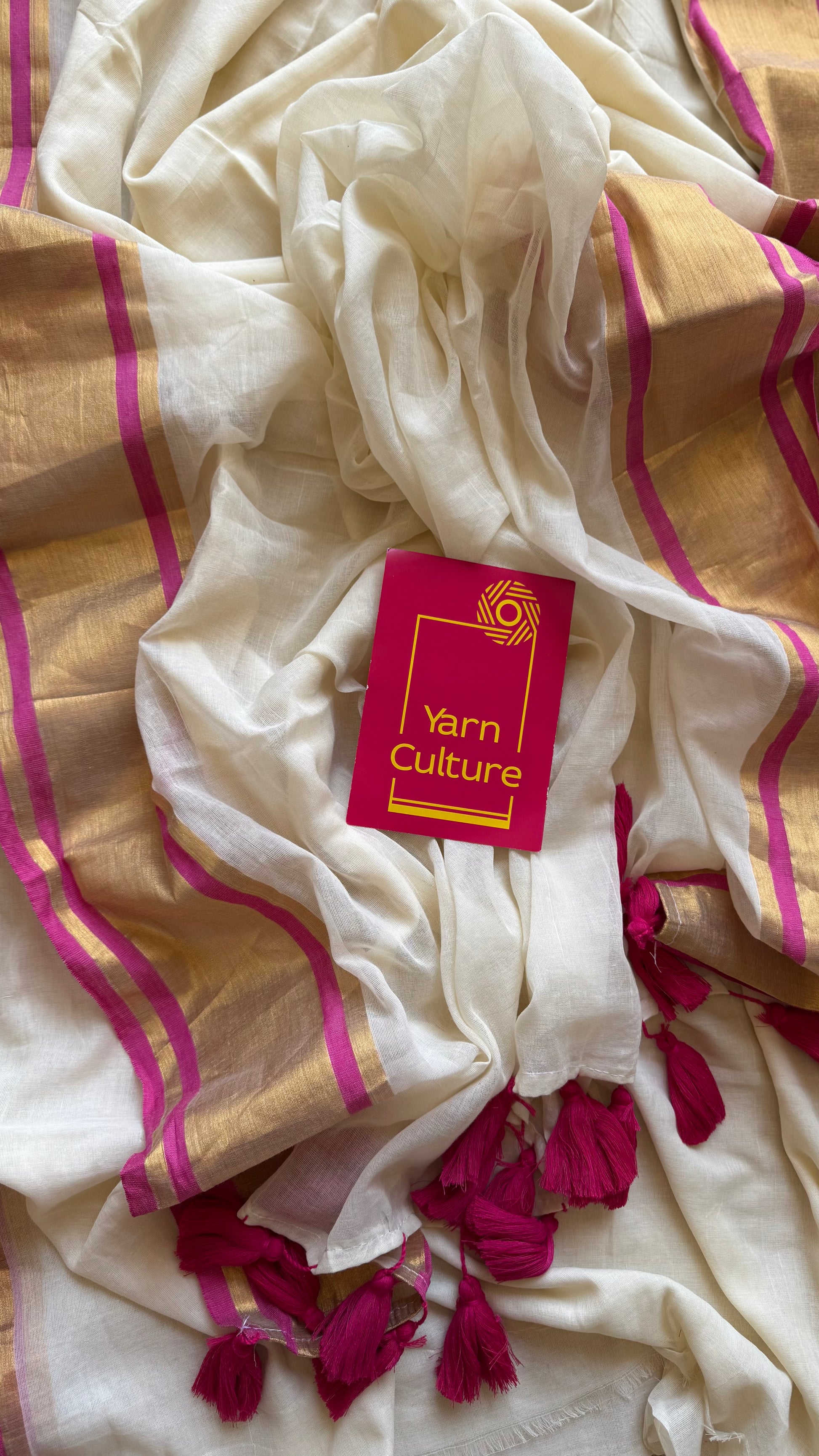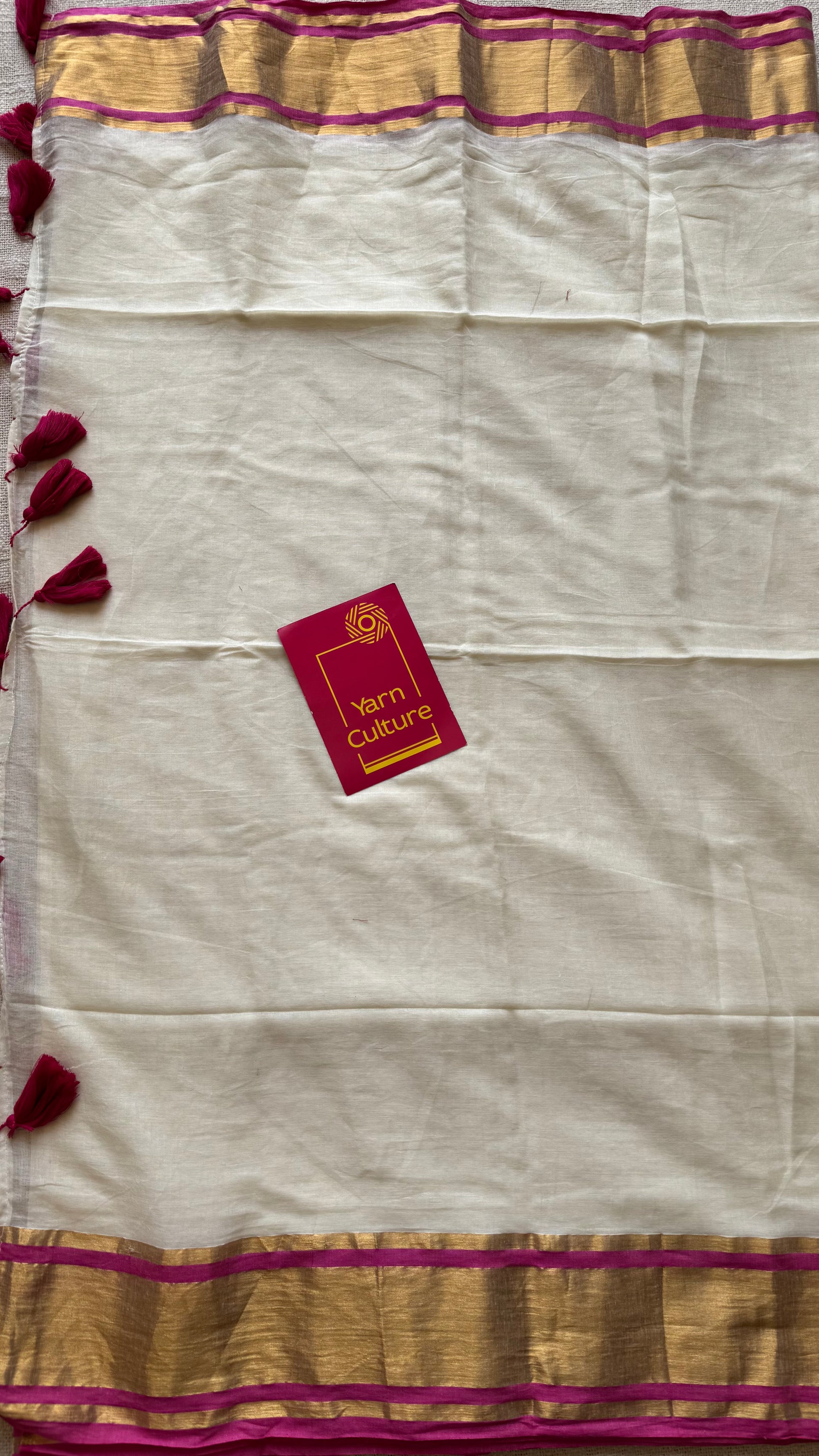 Ivory mul saree with gold zari border with hot pink highlights, simple, lightweight, soft, easy to drape.Ā