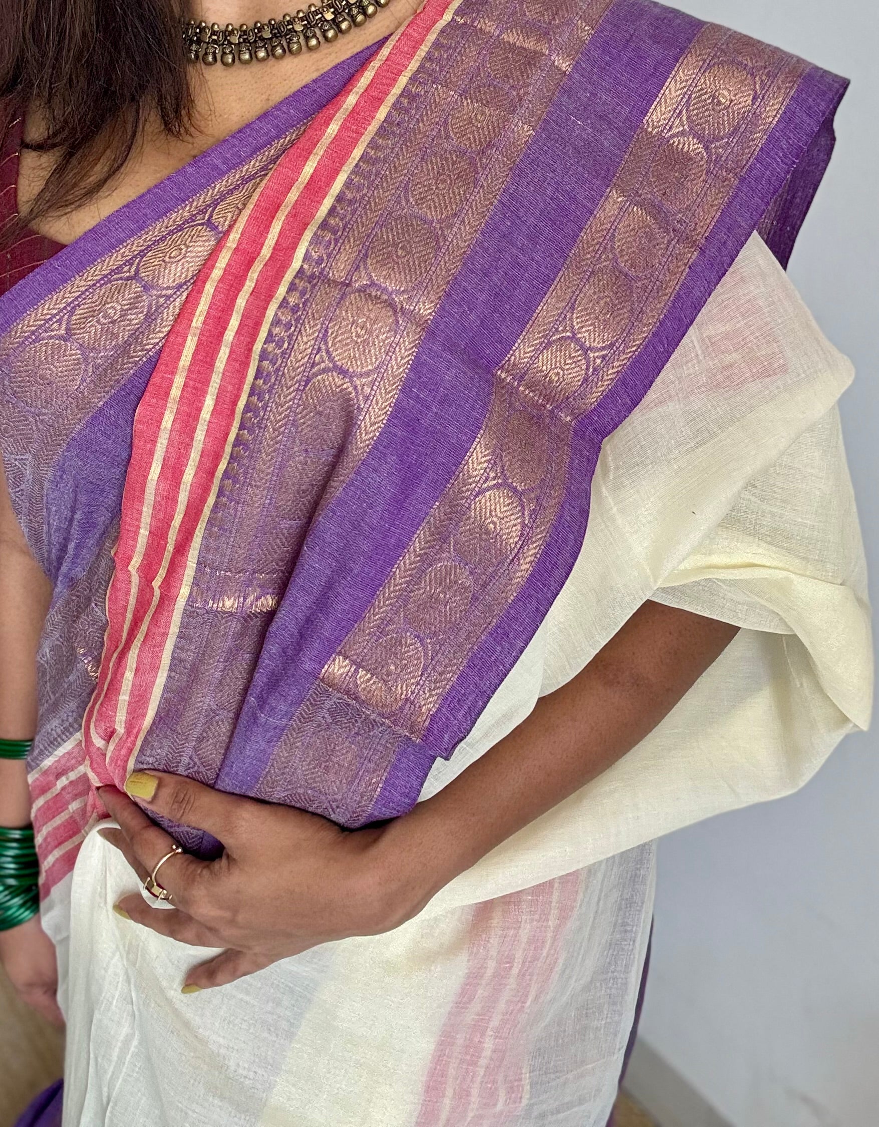 Ivory mul cotton saree featuring a beautiful Kanchi-inspired border woven in antique gold zari in red and purple.