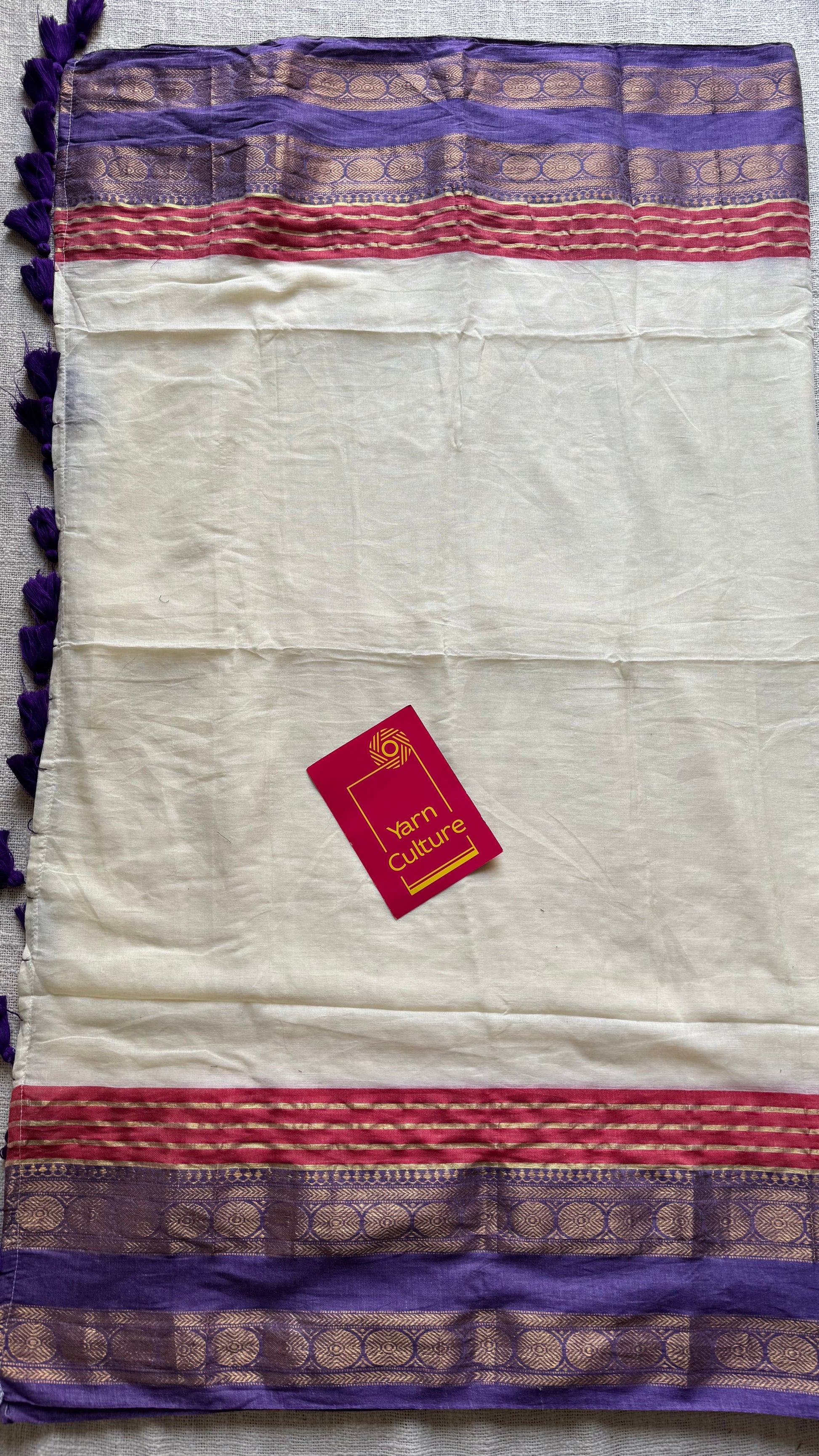 Ivory mul saree with purple and red motif zari border - YCBCMCFE299