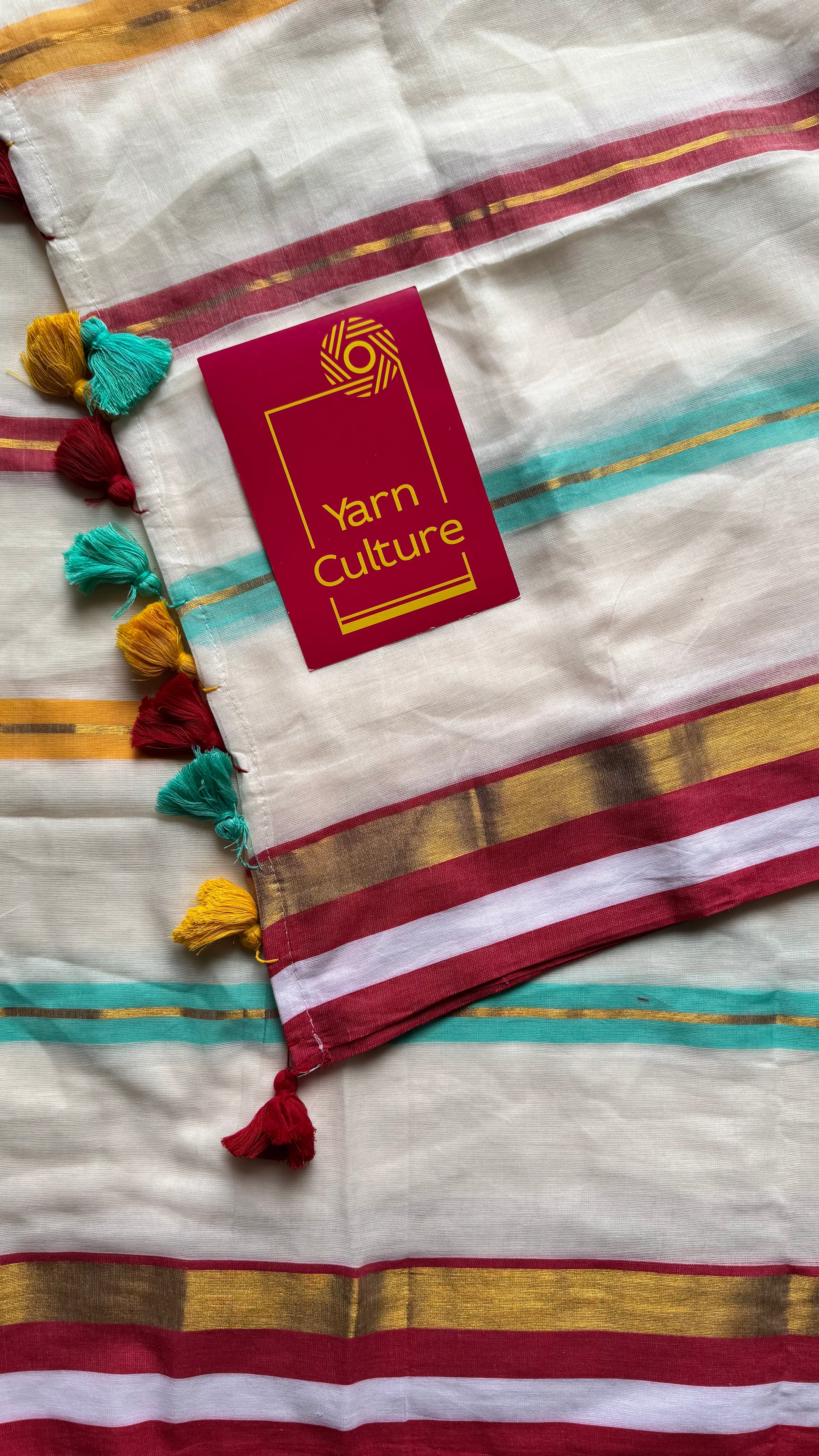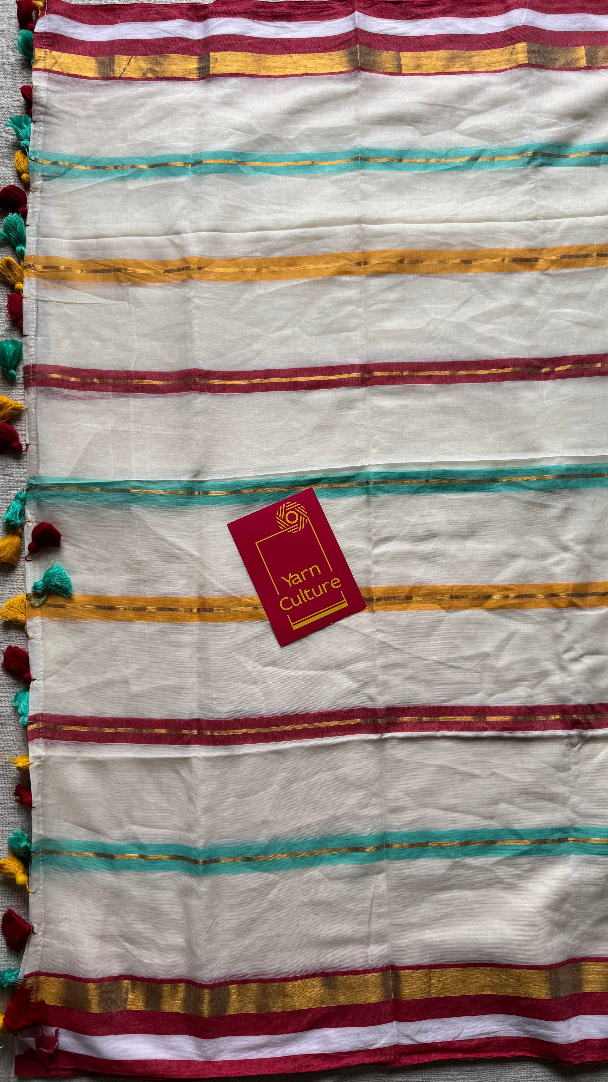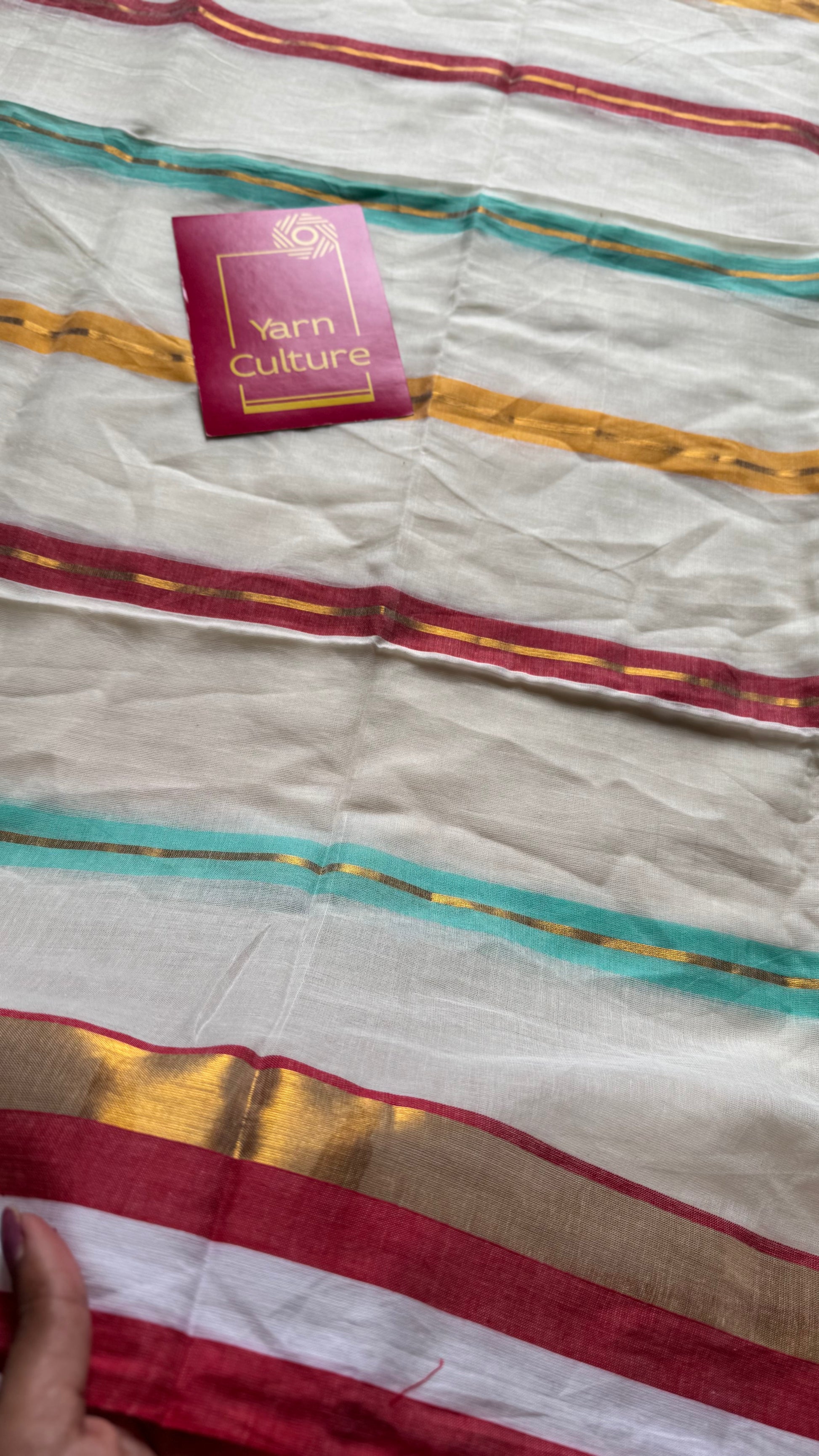 Ivory with blue, red and gold striped body & border, mul cotton - YCON25BCM38
