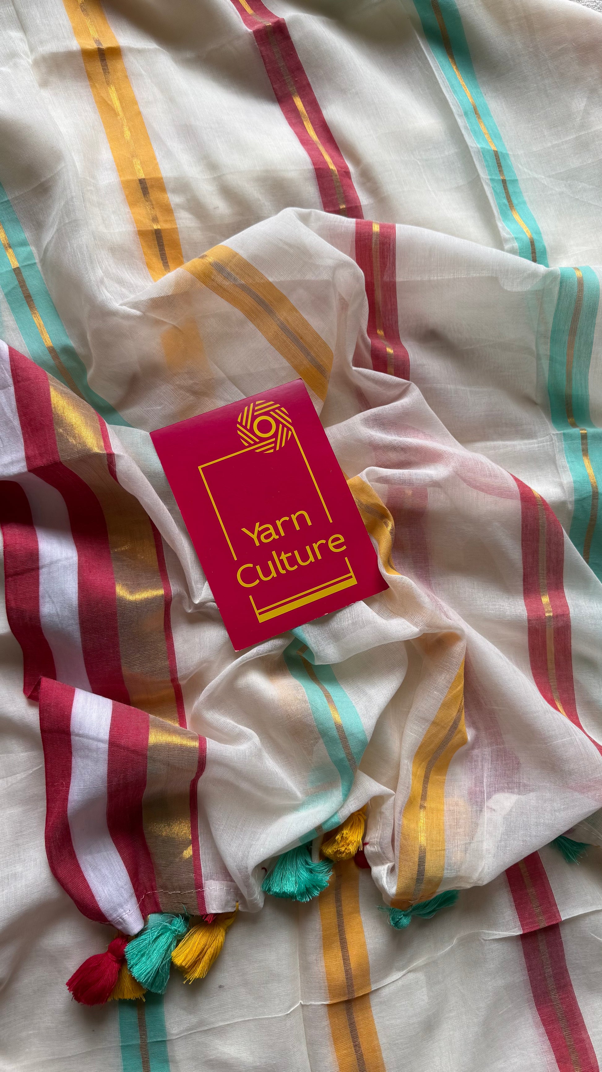 Everybody's favourite mul cotton in a gold striped zari border, ivory body, soft & easy to drape.