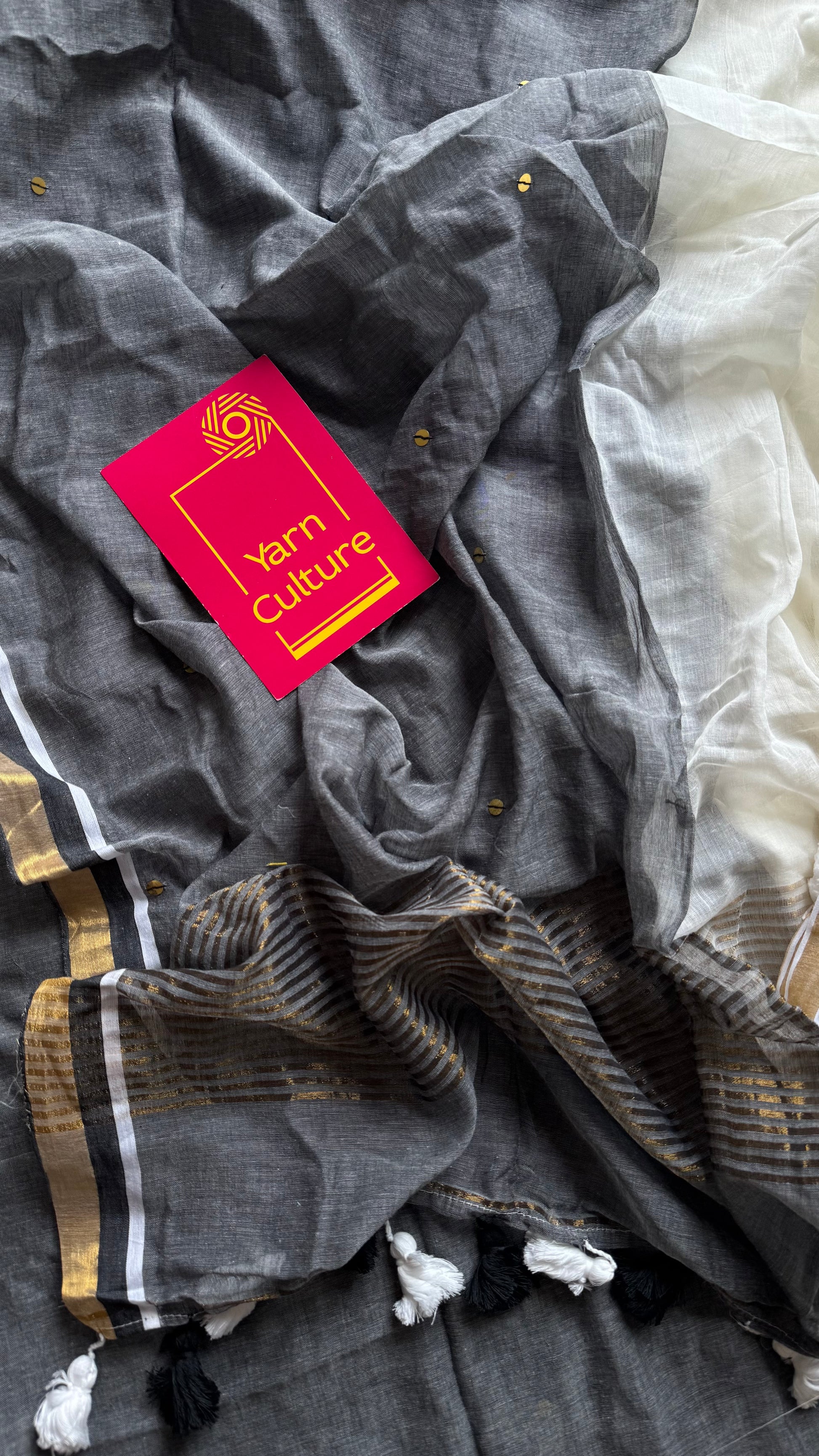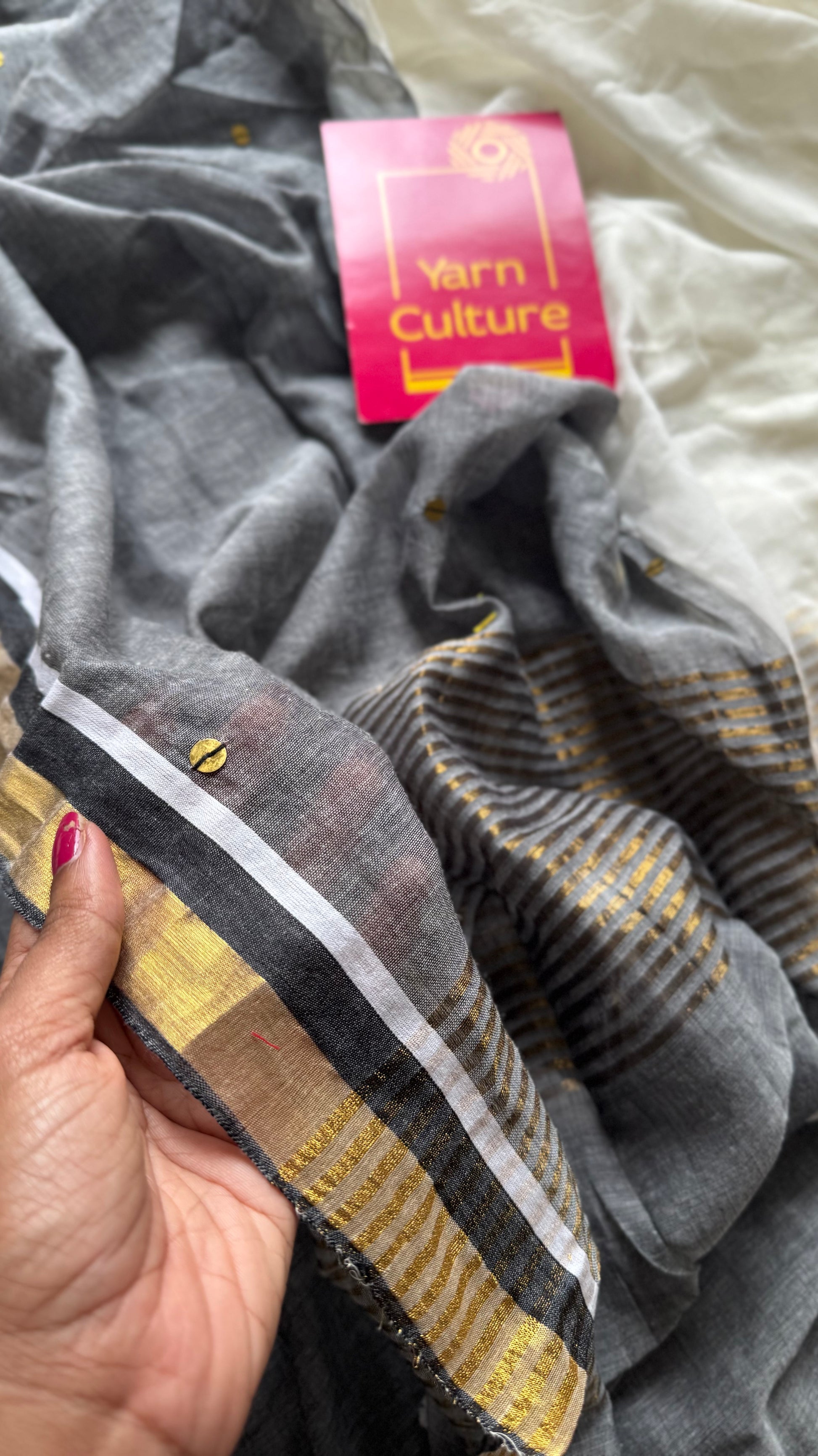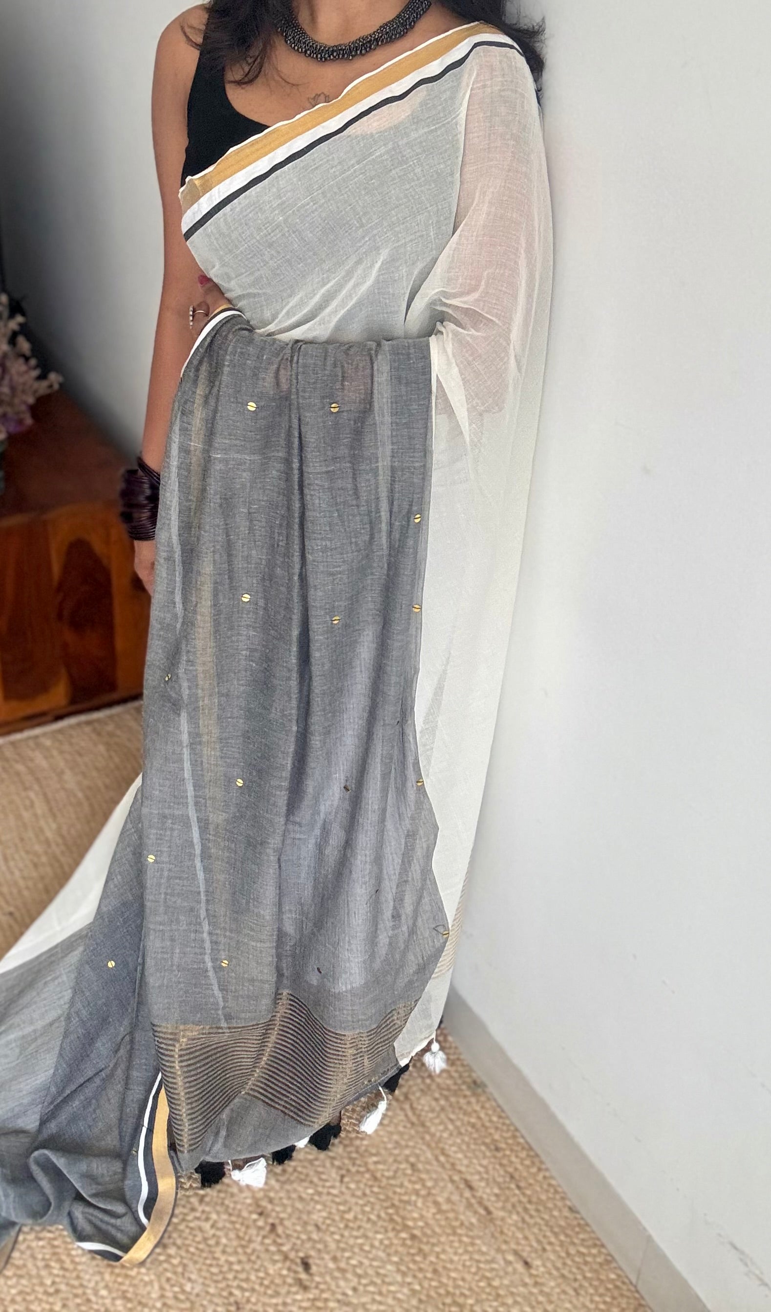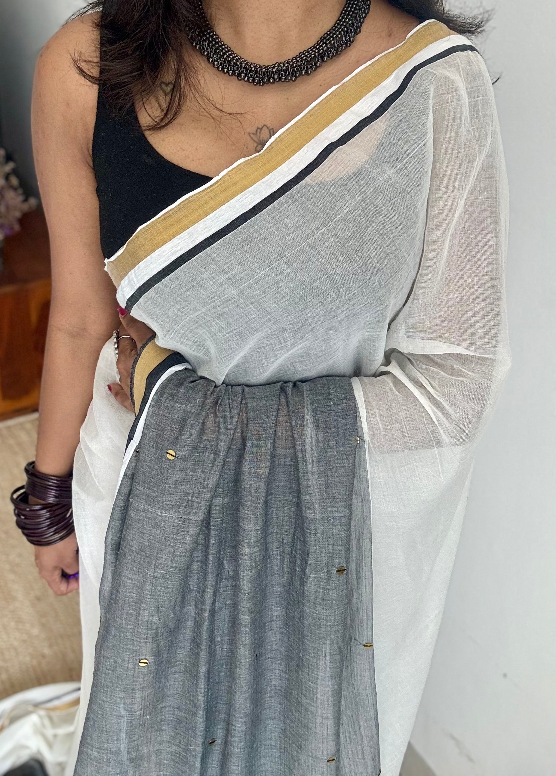 Everybody's favourite mul cotton in a dark grey and antique gold zari border, and sequins work, ivory body, soft & easy to drape.