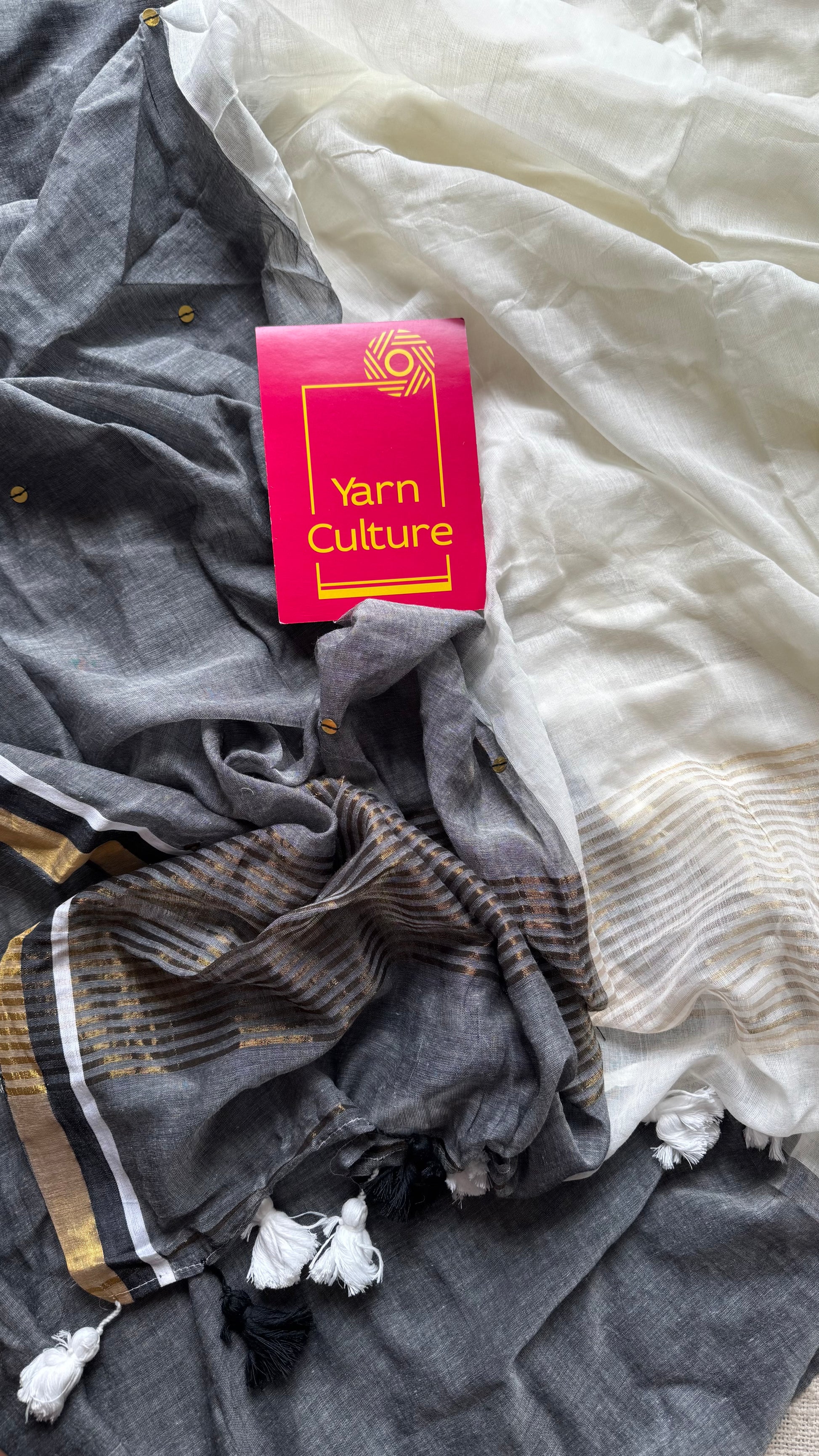 Ivory with dark grey with sequins and antique gold zari border, mul cotton - YCONBCM240