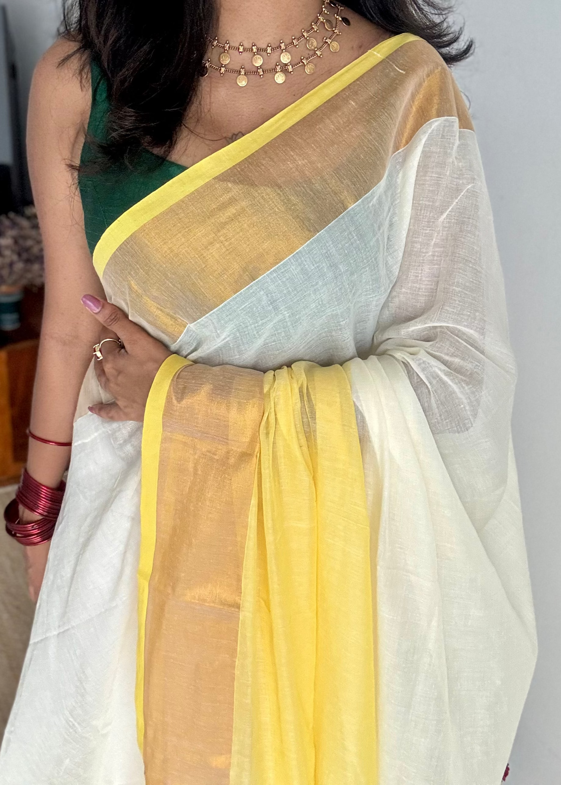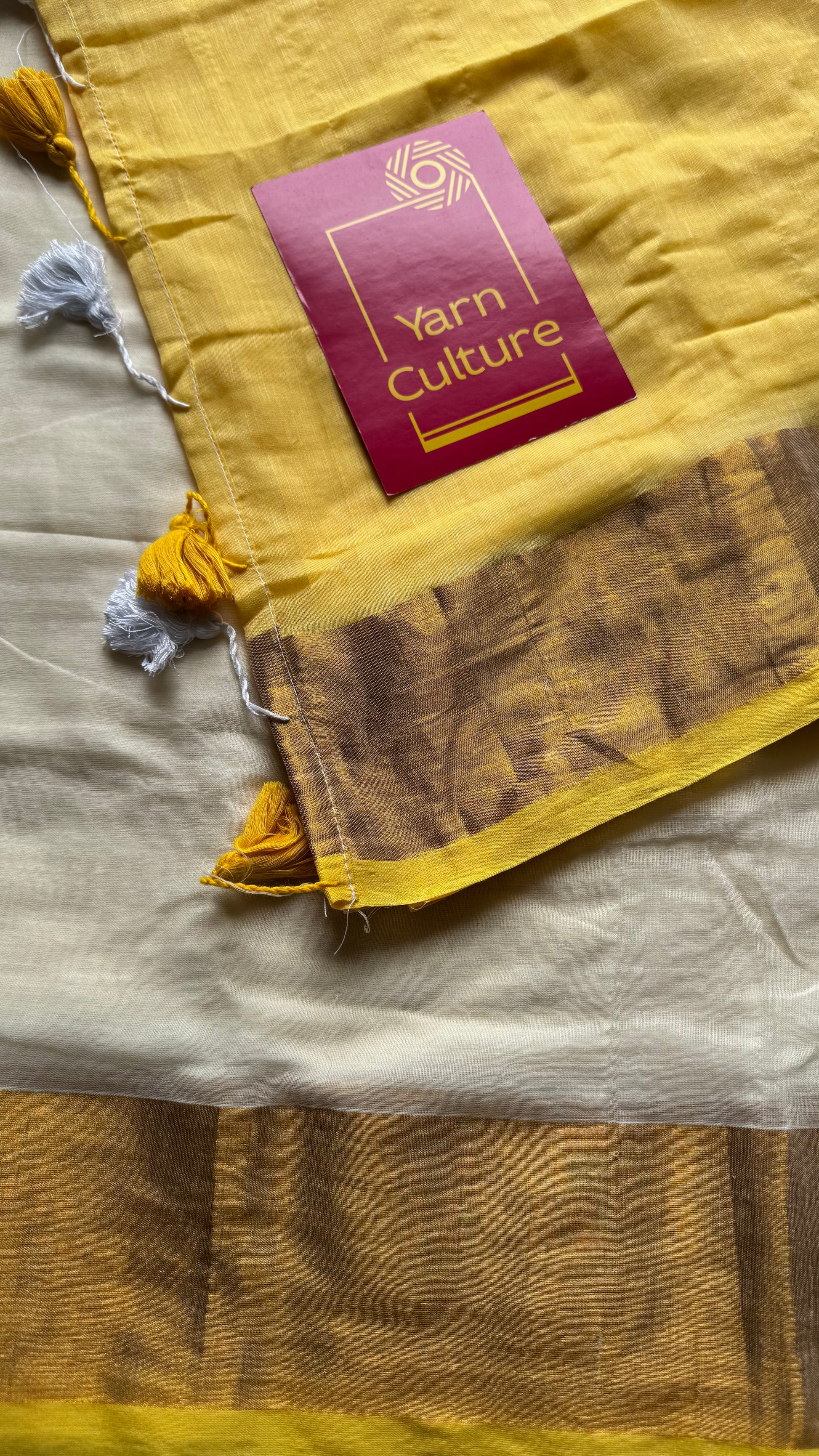 Everybody's favourite mul cotton in a dyed border of yellow with antique gold zari border, ivory body, soft & easy to drape.