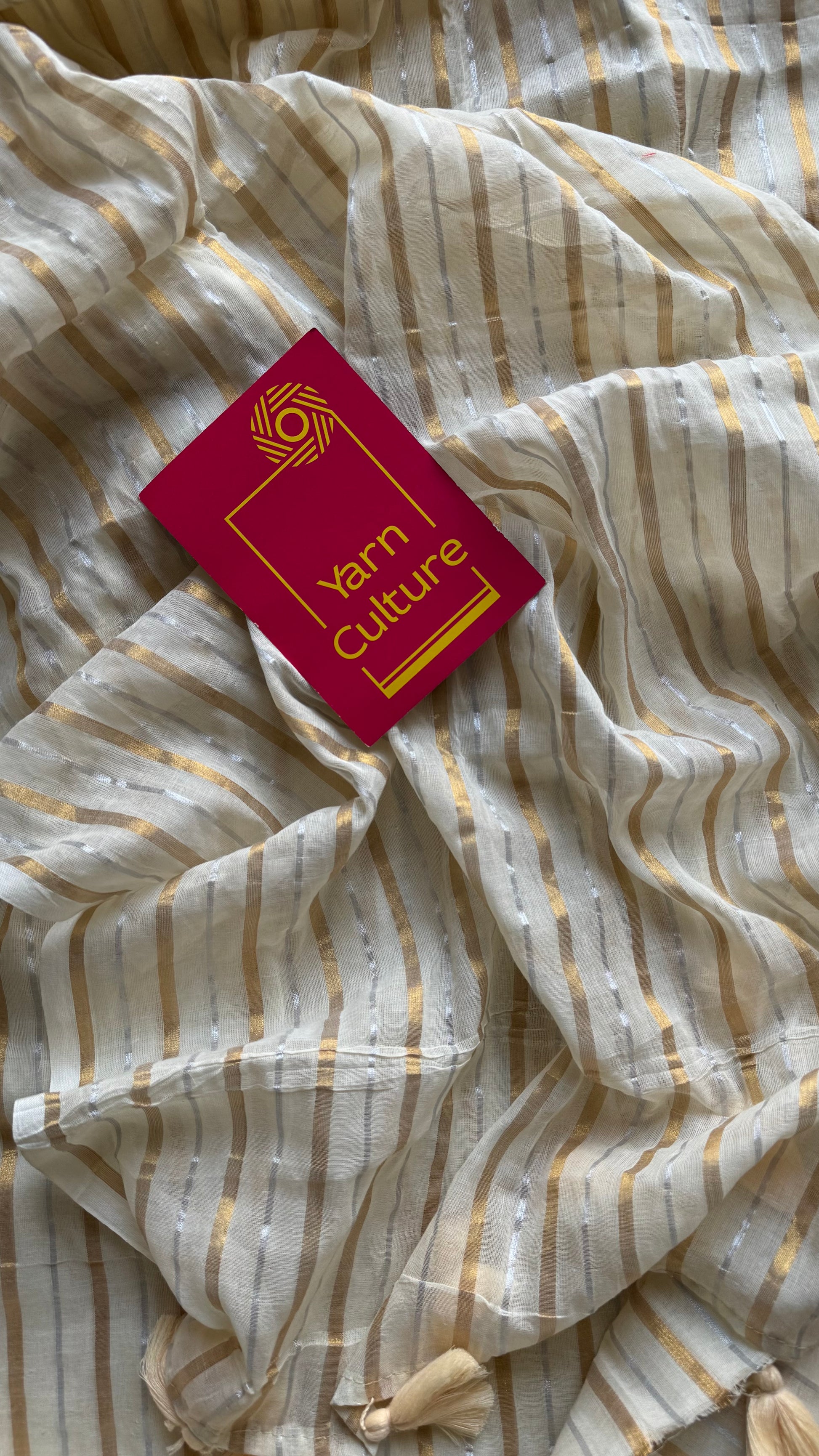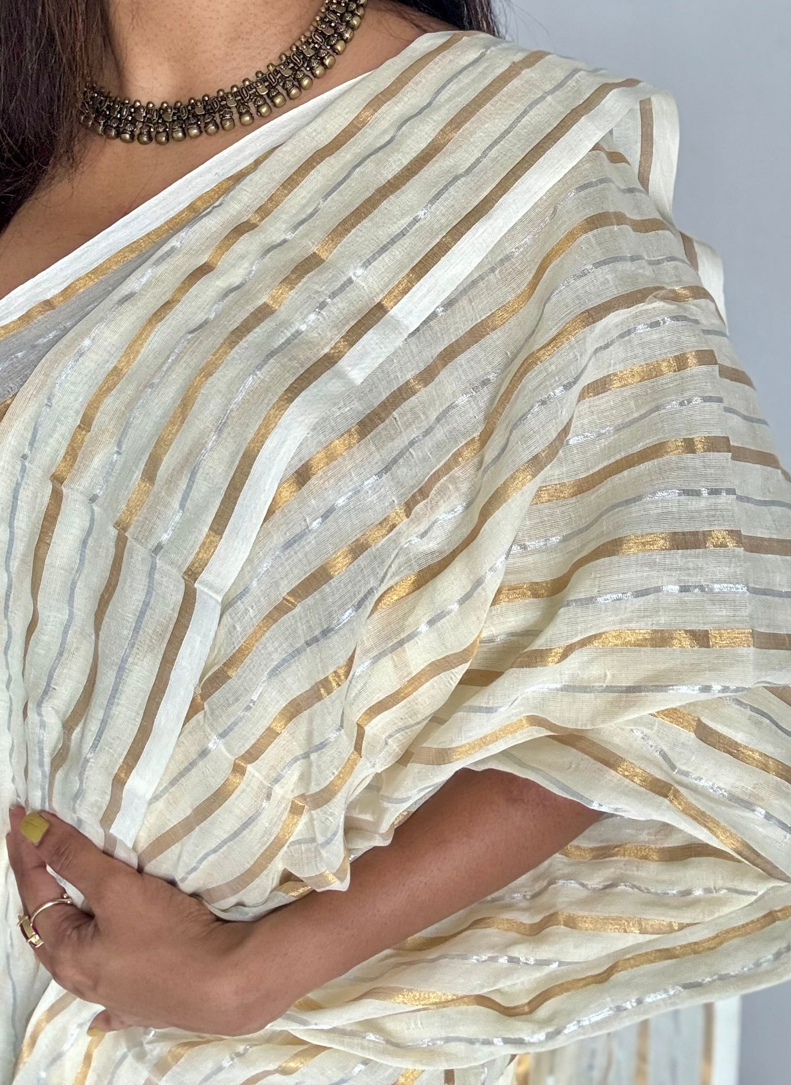 Ivory mul cotton saree featuring delicate gold and silver stripes woven across the body. Lightweight and breathable, easy to drape.