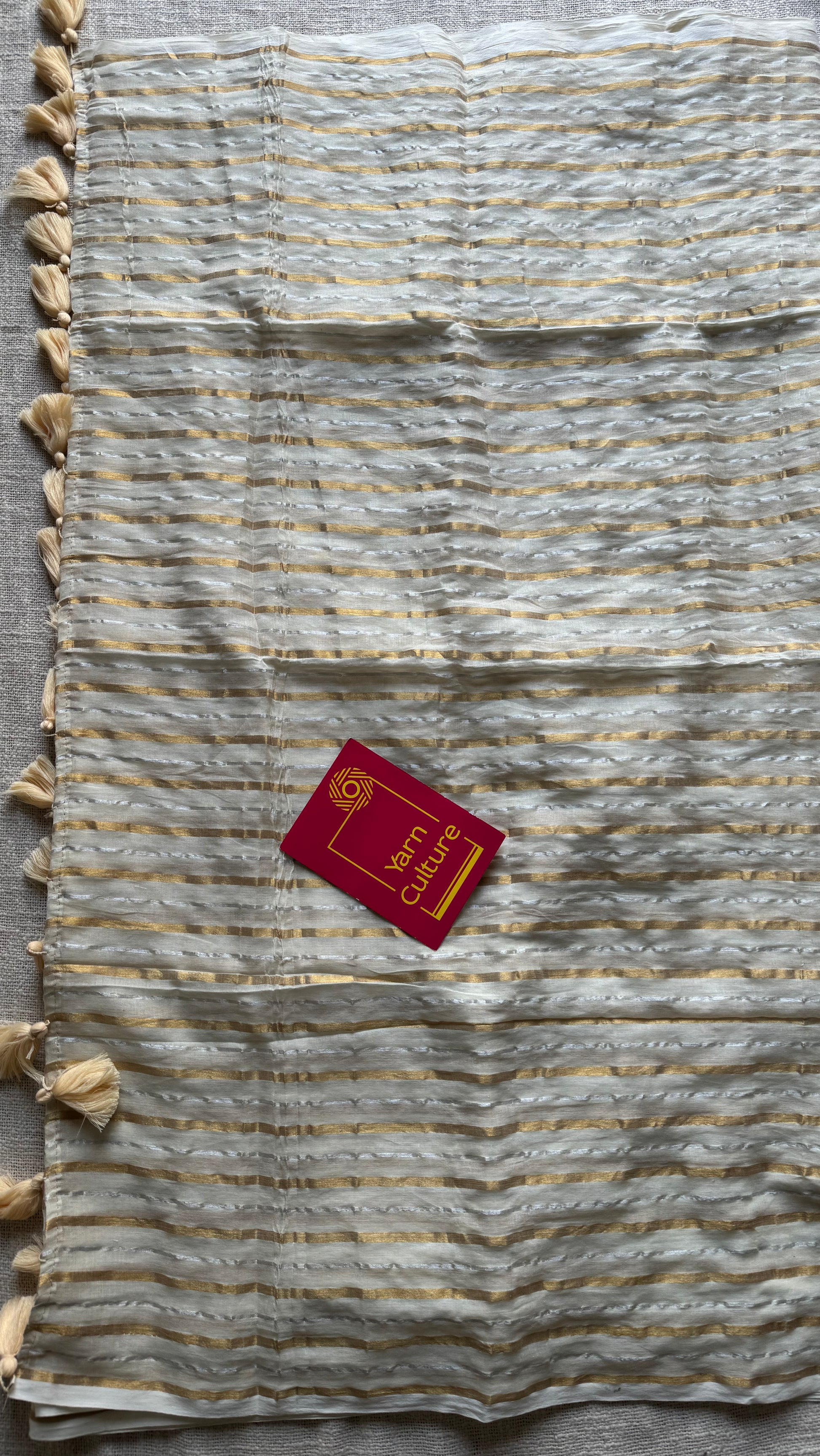 Ivory mul saree with gold and silver stripes - YCBCMCFE298