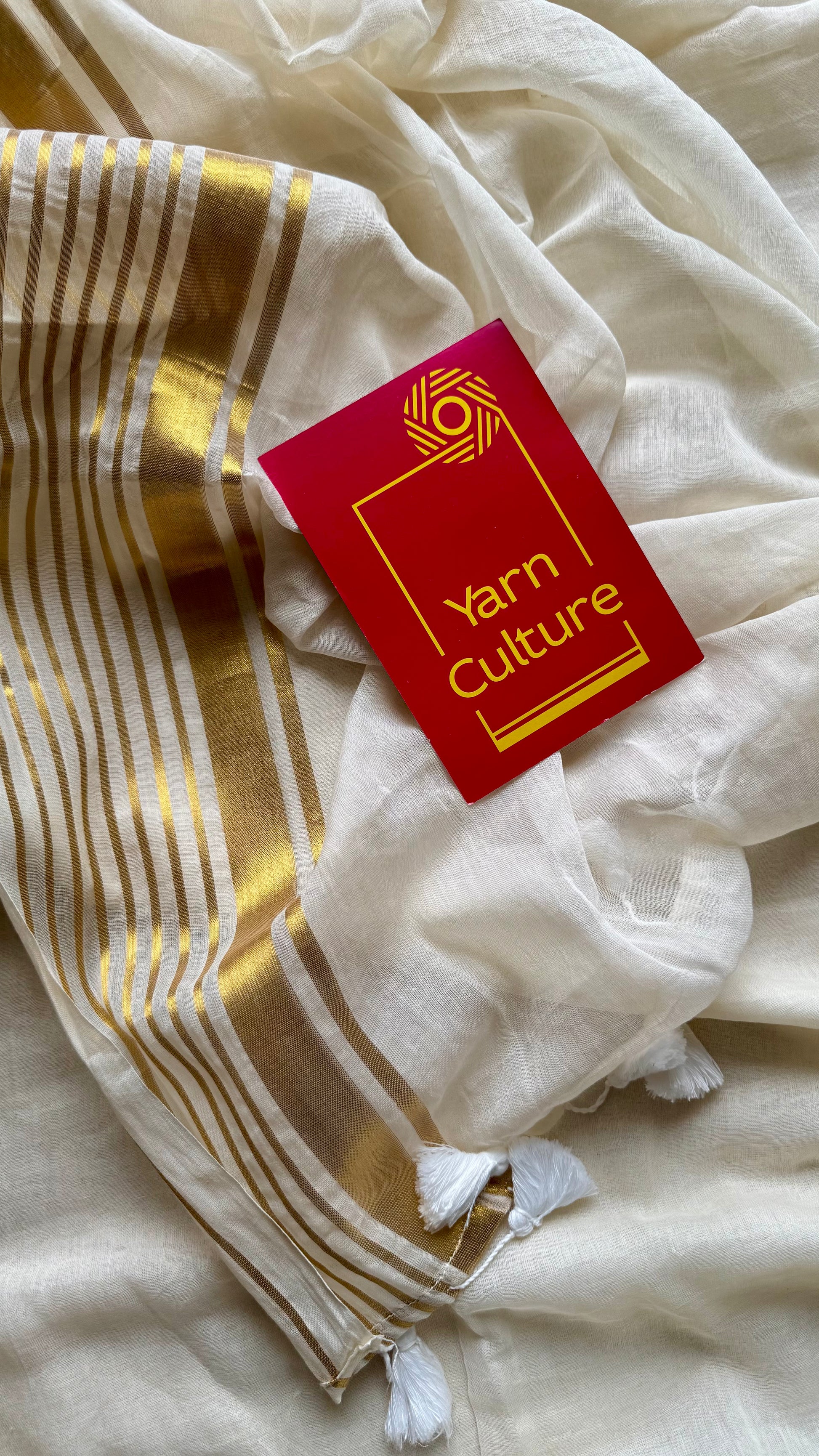 Ivory with gold striped border, mul cotton - YCON25BCM34