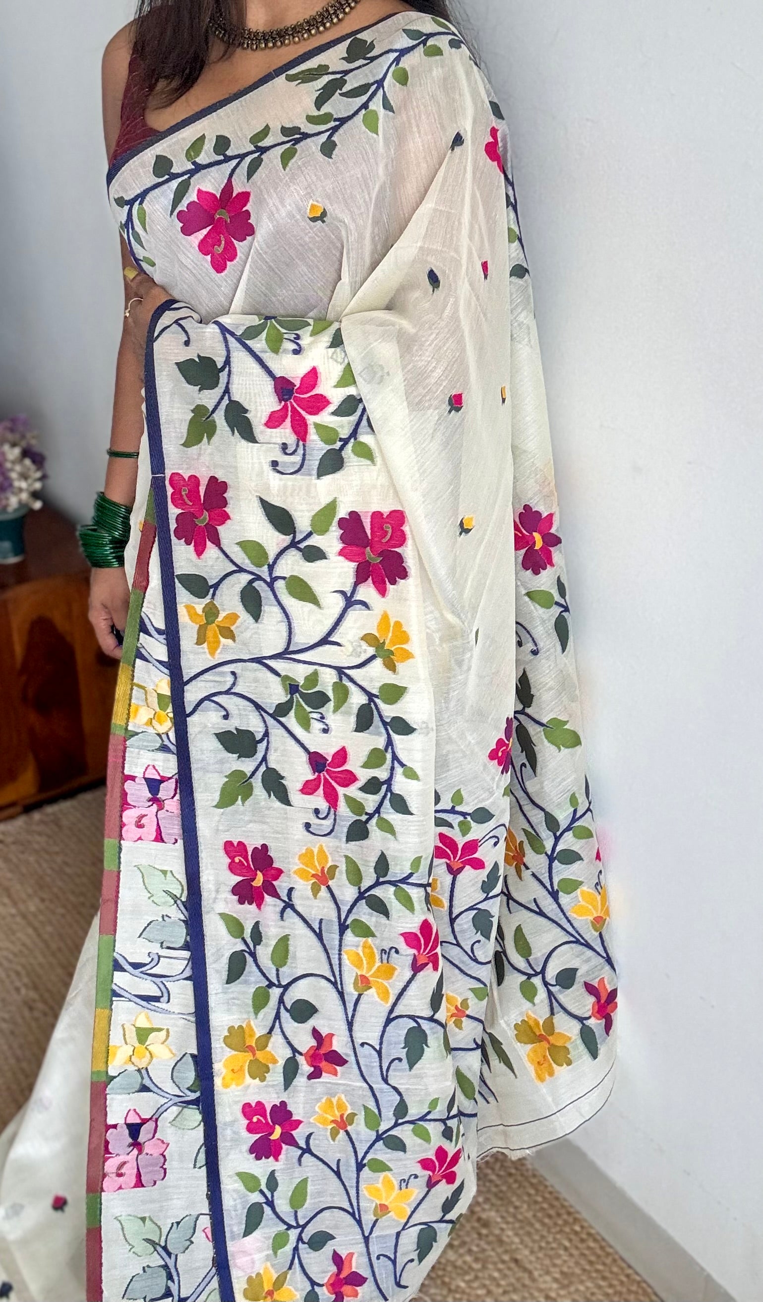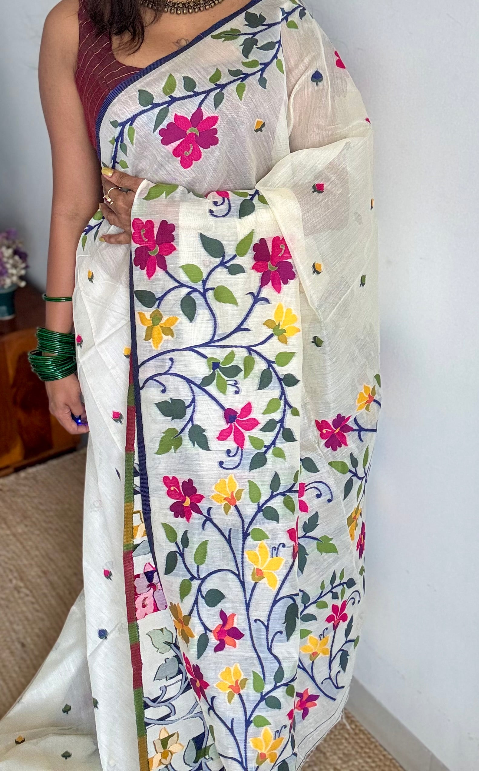 Ivory cotton mix saree featuring a thin navy blue border and multicolour floral work across the body.