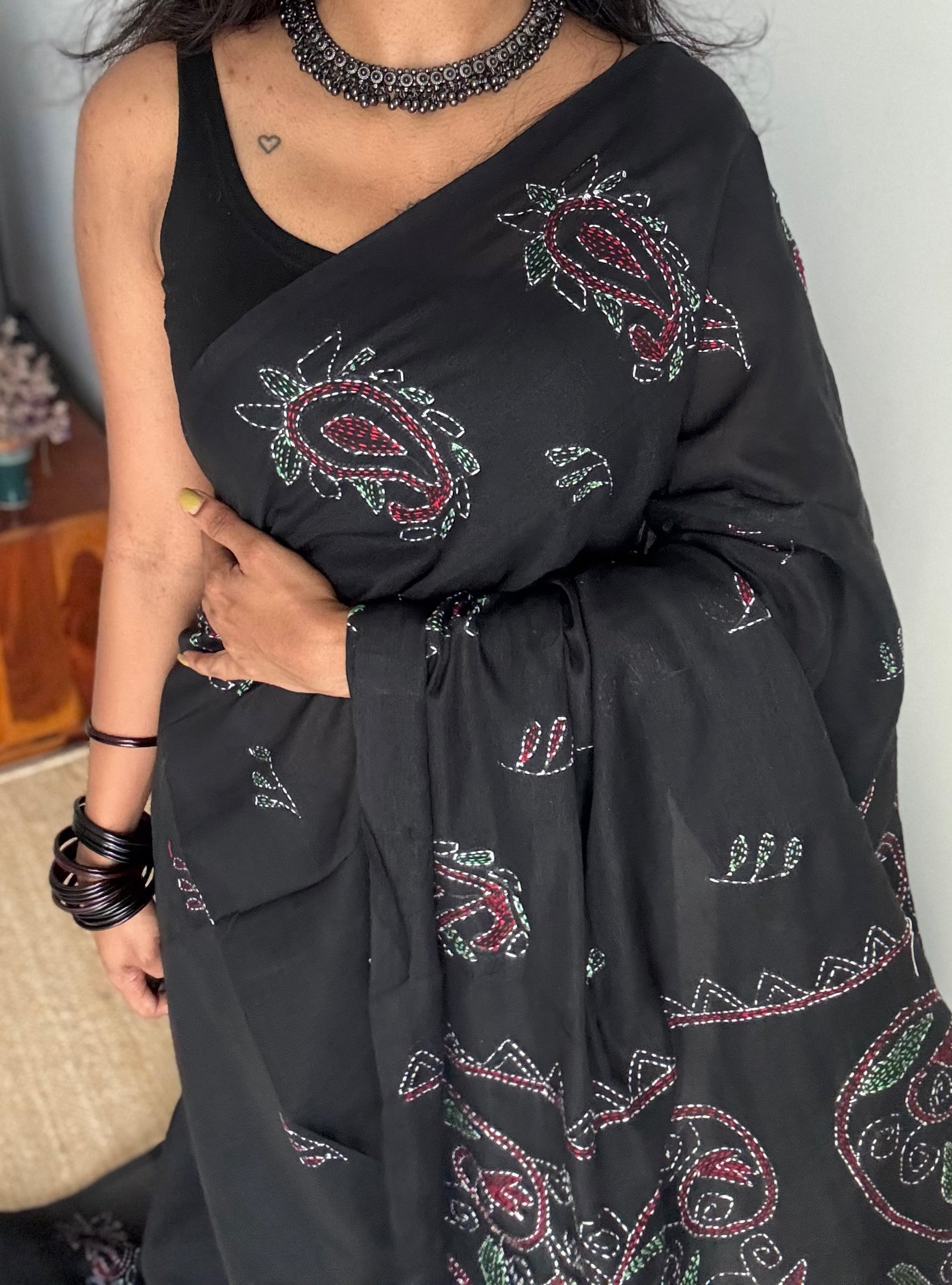 Bold in its stillness, detailed in its weave - this black Kantha saree is elegance etched in thread.
