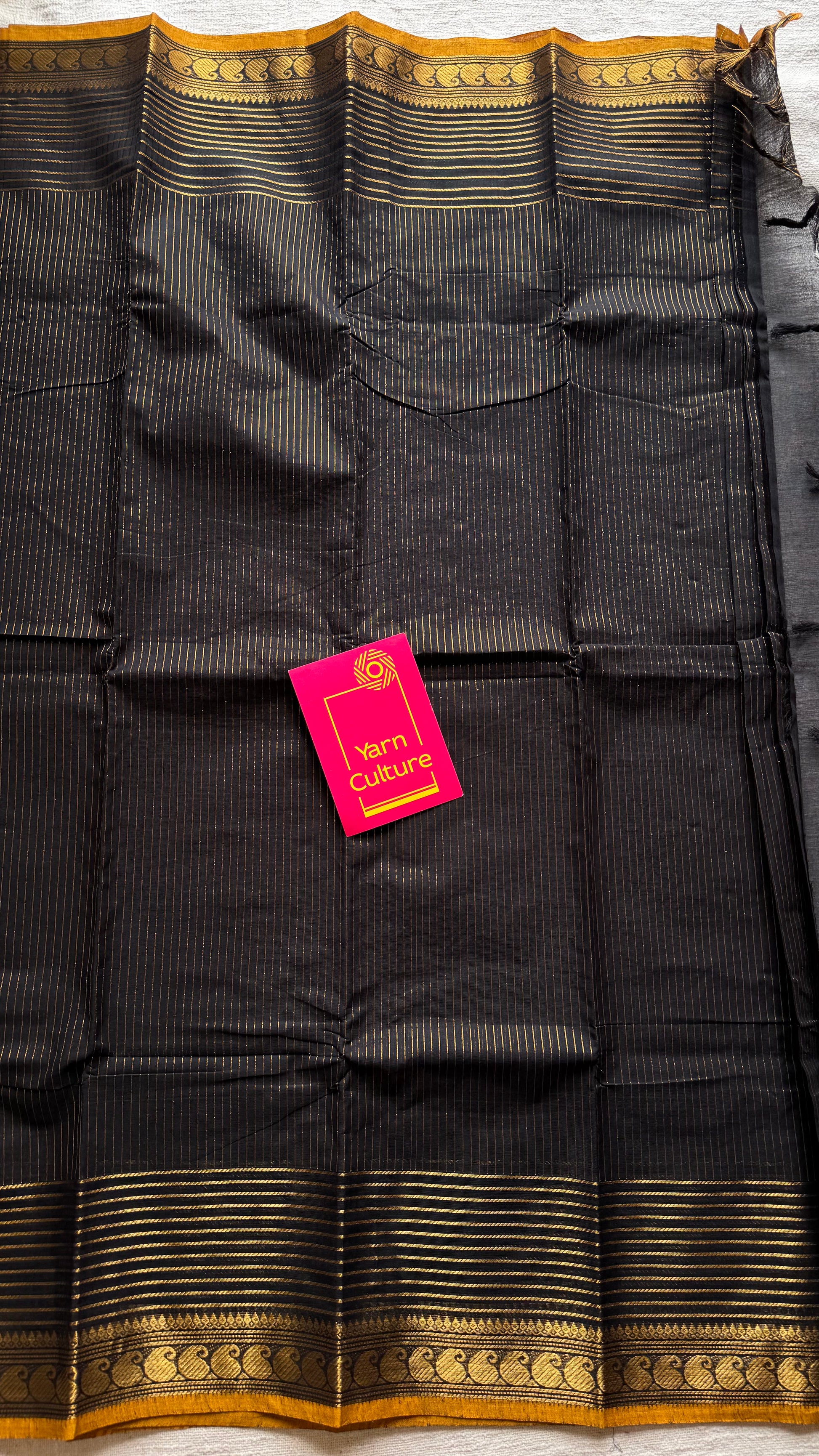A beautiful Kanchi cotton saree in black with gold stripes, paisley motif border highlighted by yellow. Lightweight, breathable, and soft, it is ideal for summer wear, everyday use, and comfortable draping. Comes with running blouse.