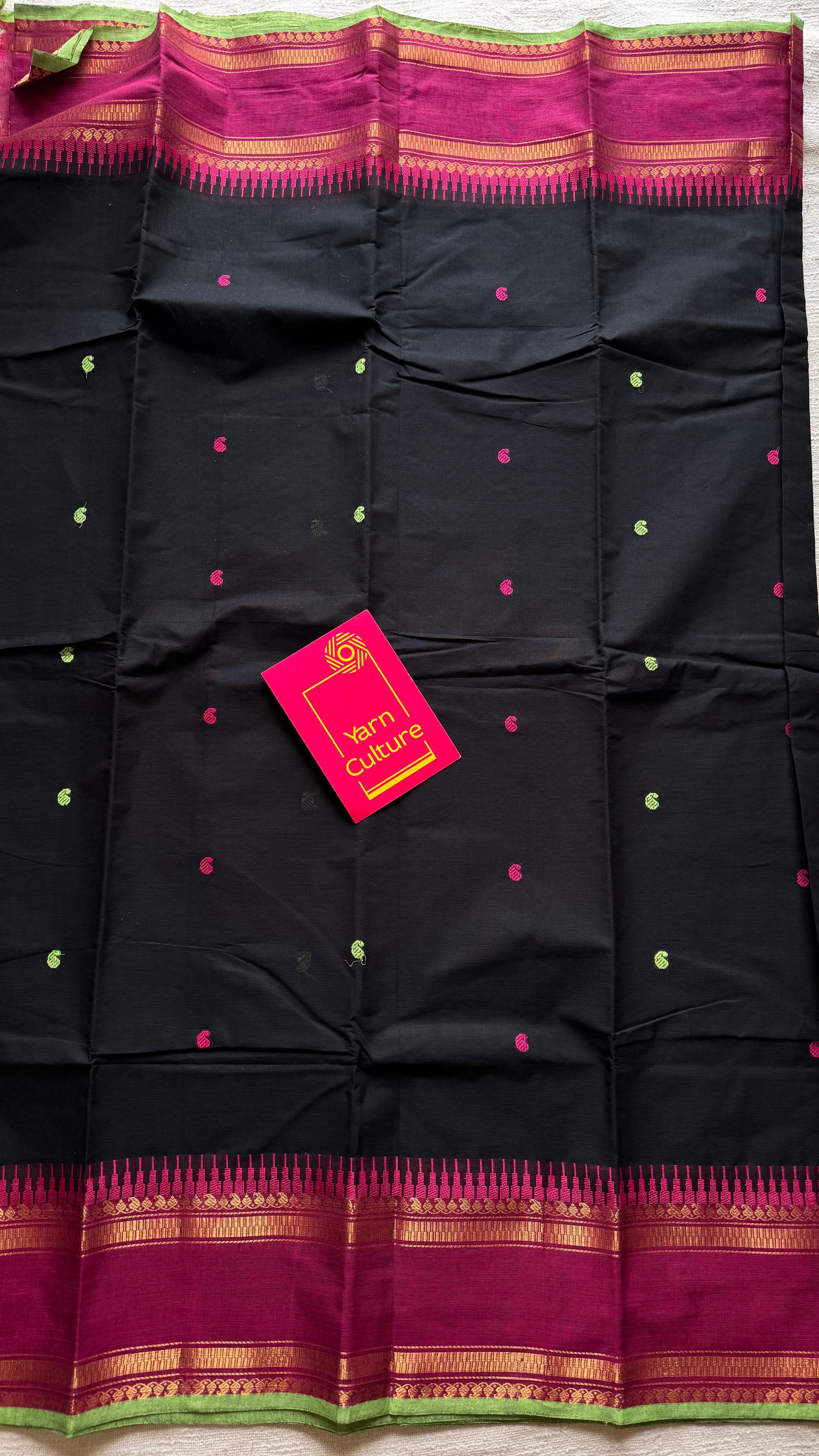 A beautiful Kanchi cotton saree in black with magenta border highlighted by pista green. Lightweight, breathable, and soft, it is ideal for summer wear, everyday use, and comfortable draping. Comes with a gap border, green and pink paisley buttas all over the body and comes with running blouse.