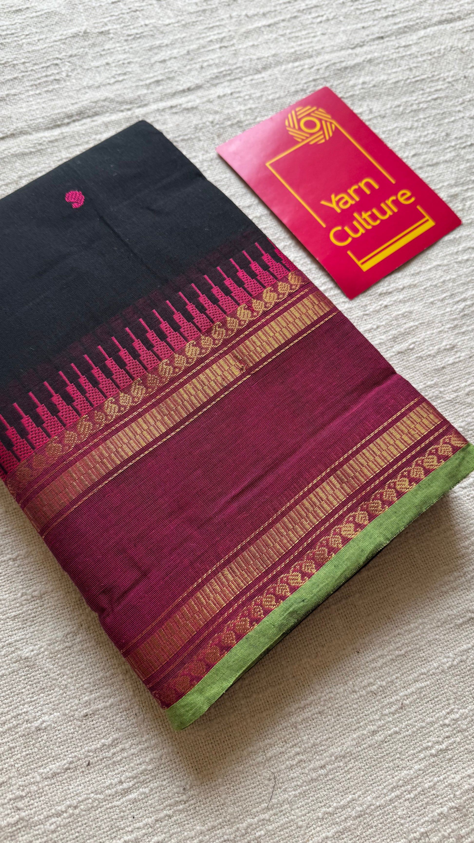 Kanchi cotton saree, black with magenta and pista green border - YCCOTNAP84