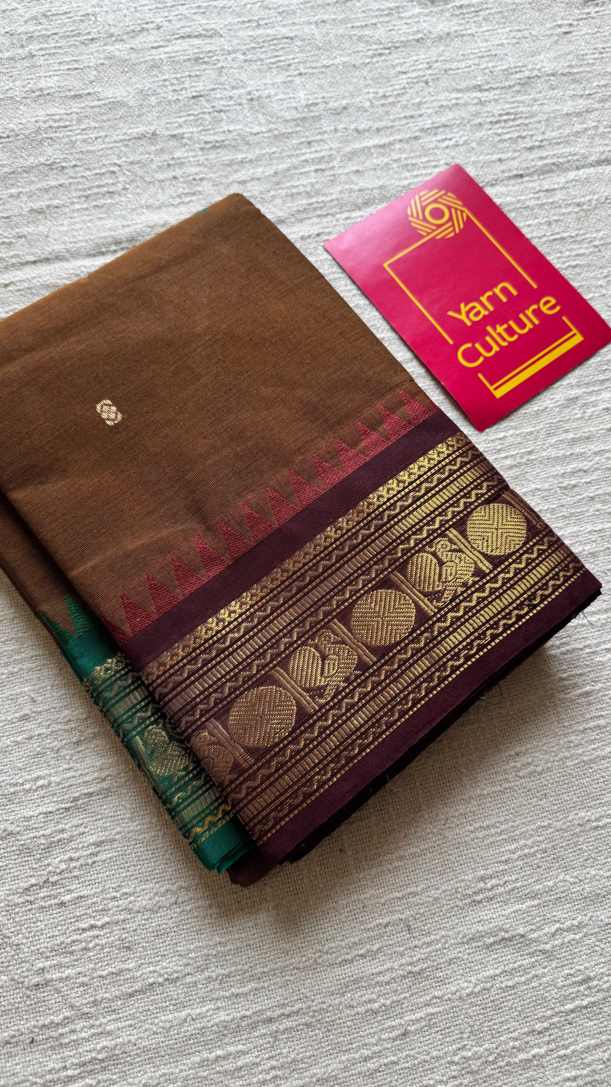 Kanchi cotton saree, brown with dark brown and green dual border - YCCOTNAP94