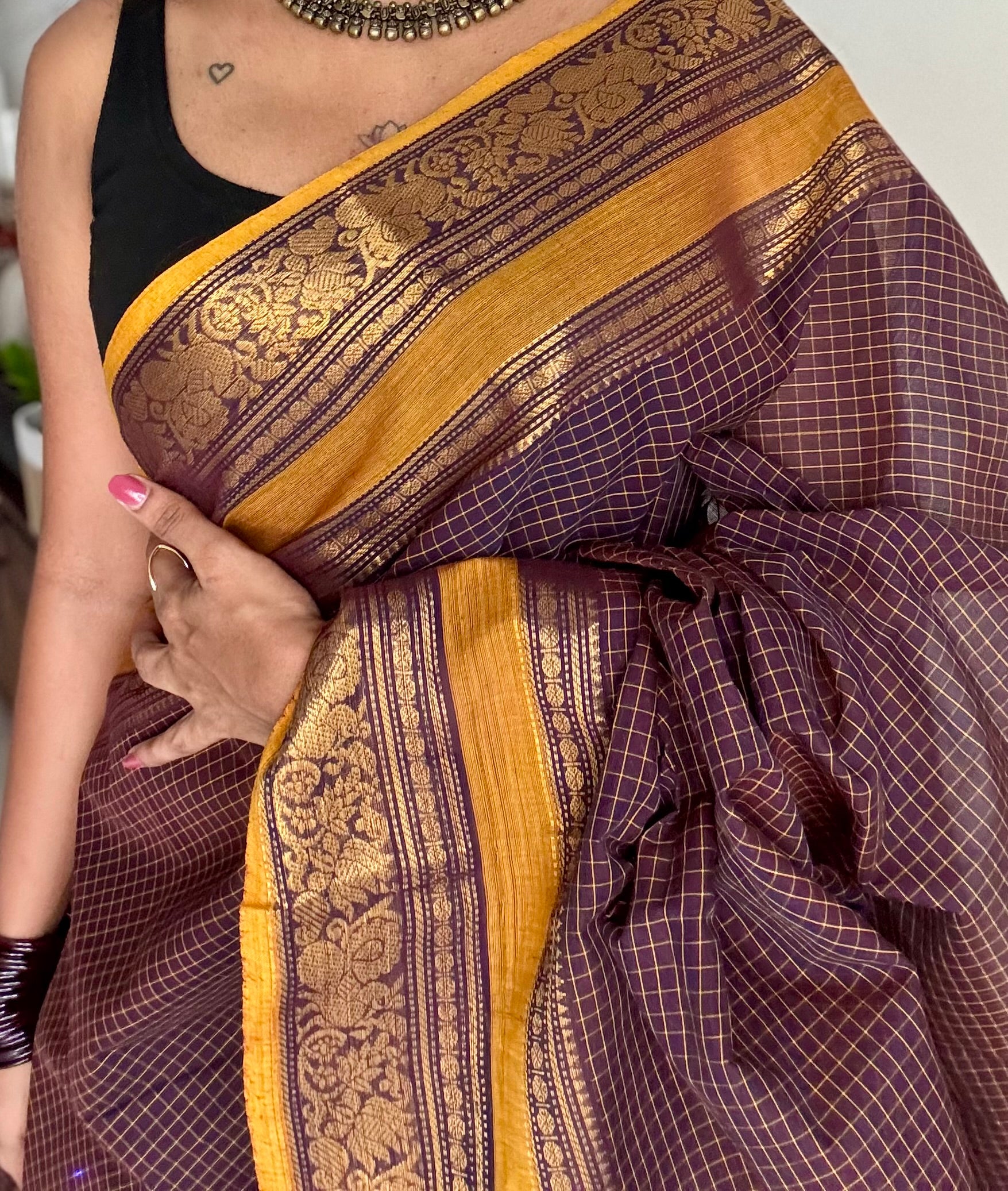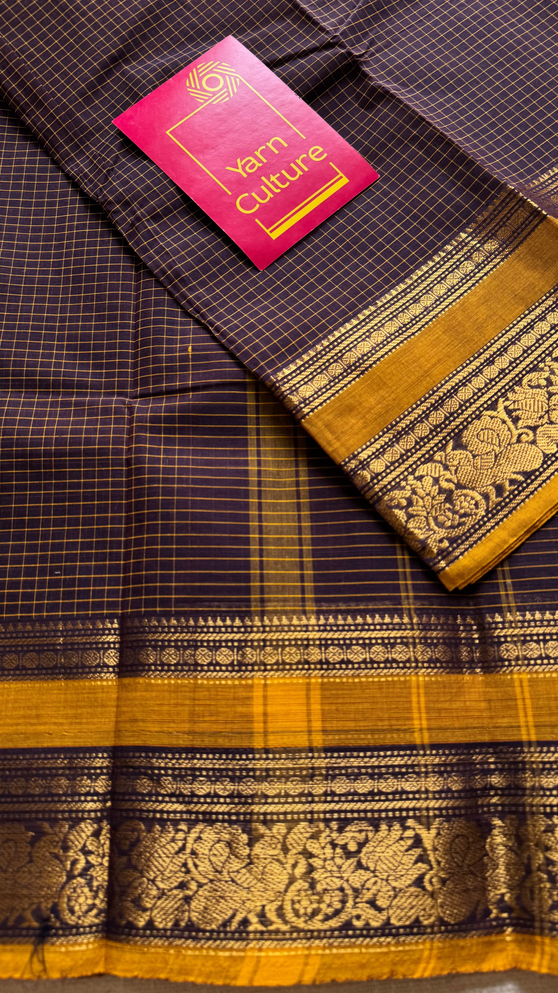 An elegant Kanchi cotton saree with traditional muthukattam (micro) checks in dark brown and yellow. Lightweight, breathable, and soft, it is ideal for summer wear, everyday use, and comfortable draping. Comes with an intricate korvai border and running blouse.