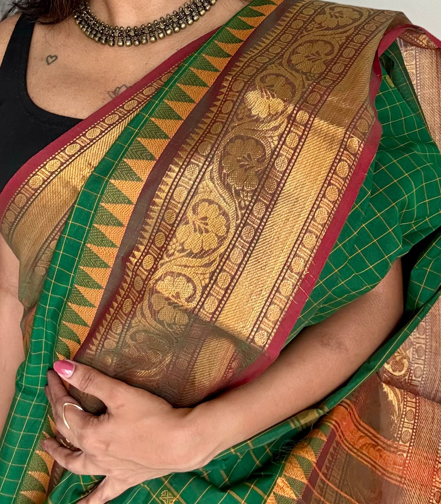 A beautiful Kanchi cotton saree with traditional checks in green with a maroon wide border on one side and thin border on the other side. Lightweight, breathable, and soft, it is ideal for summer wear, everyday use, and comfortable draping. Comes with an intricate temple border and running blouse.