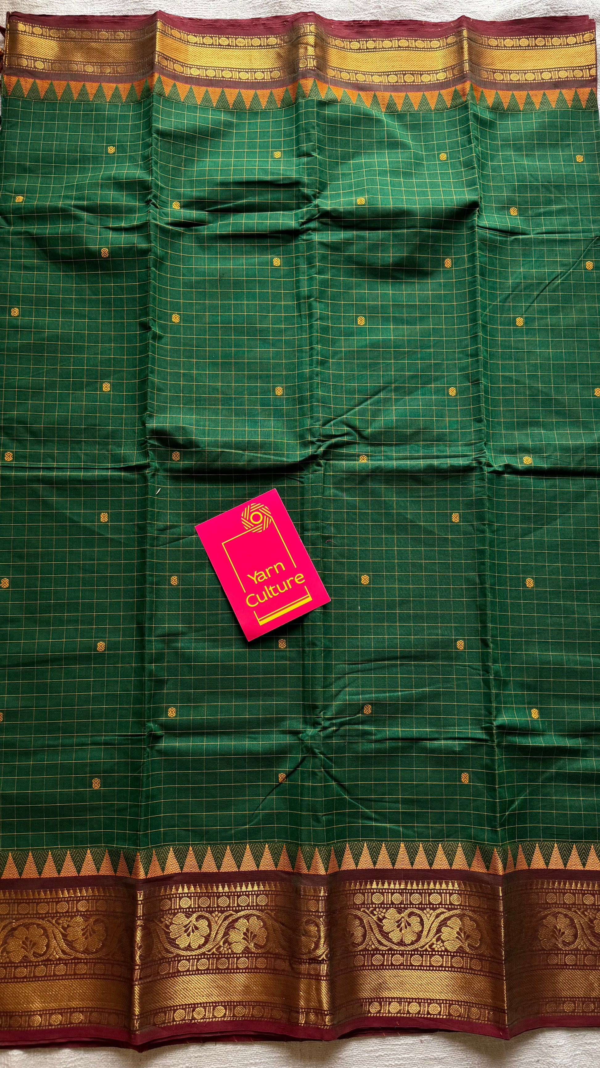 Kanchi cotton saree, green checks with maroon temple motif border - YCCOTNAP78