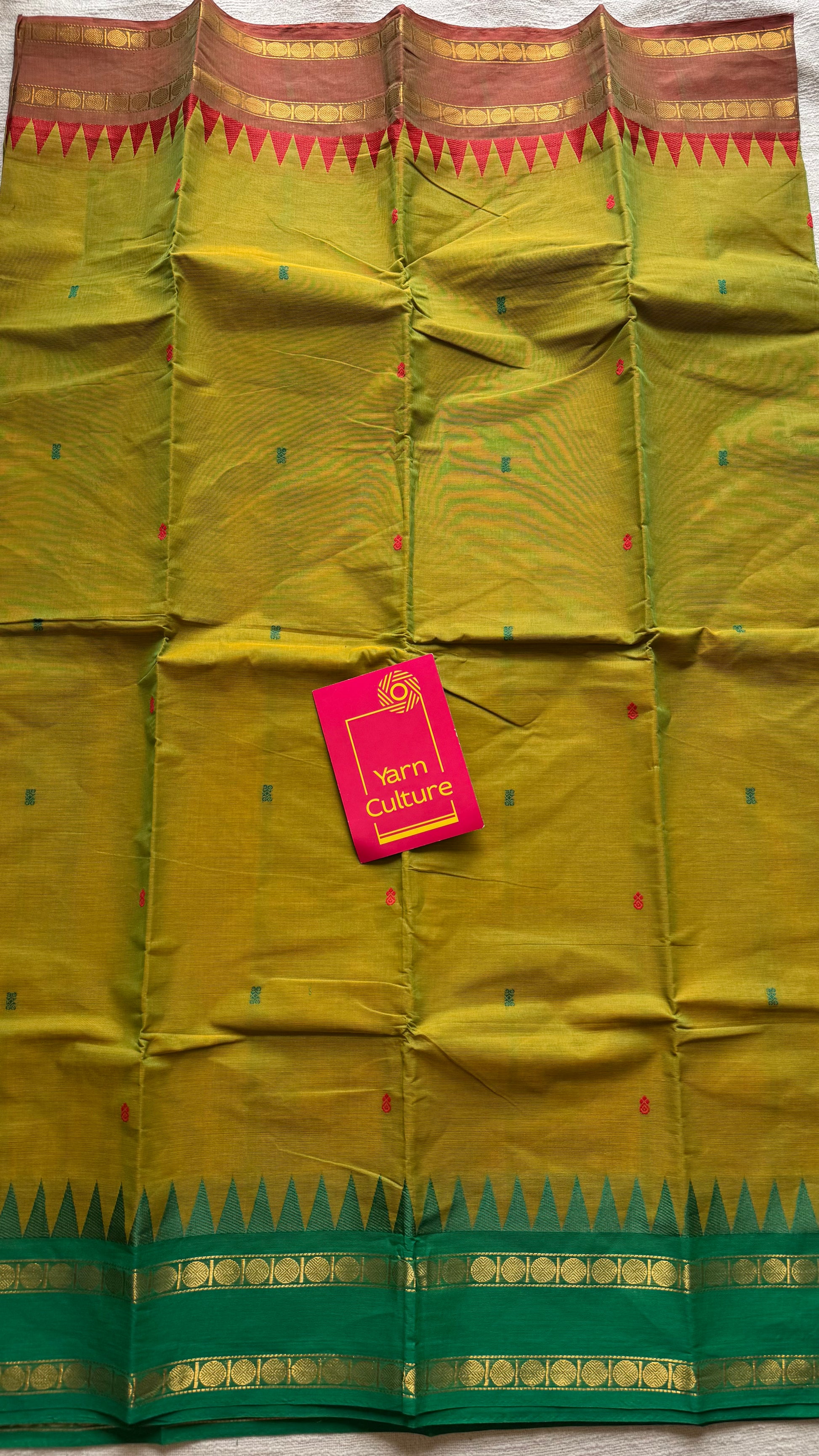 All sarees are handcrafted & though efforts have been made to avoid any defects, there might be slight imperfections in the weave or pattern or colours. Few thread pulls are common in handcrafted sarees.