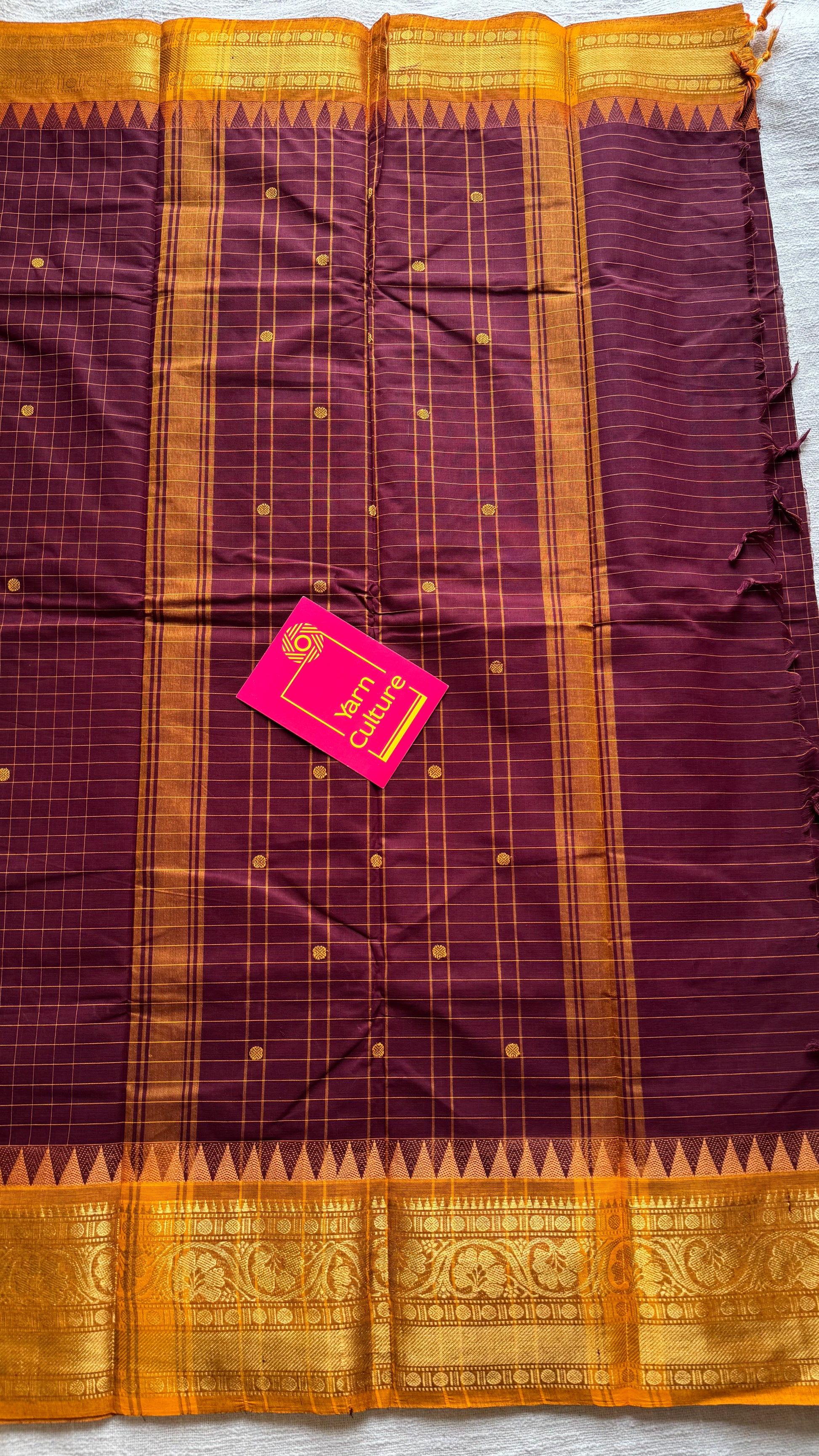 A beautiful Kanchi cotton saree with traditional checks in maroon with a turmeric yellow wide border on one side and thin border on the other side. Lightweight, breathable, and soft, it is ideal for summer wear, everyday use, and comfortable draping. Comes with an intricate temple border and running blouse.