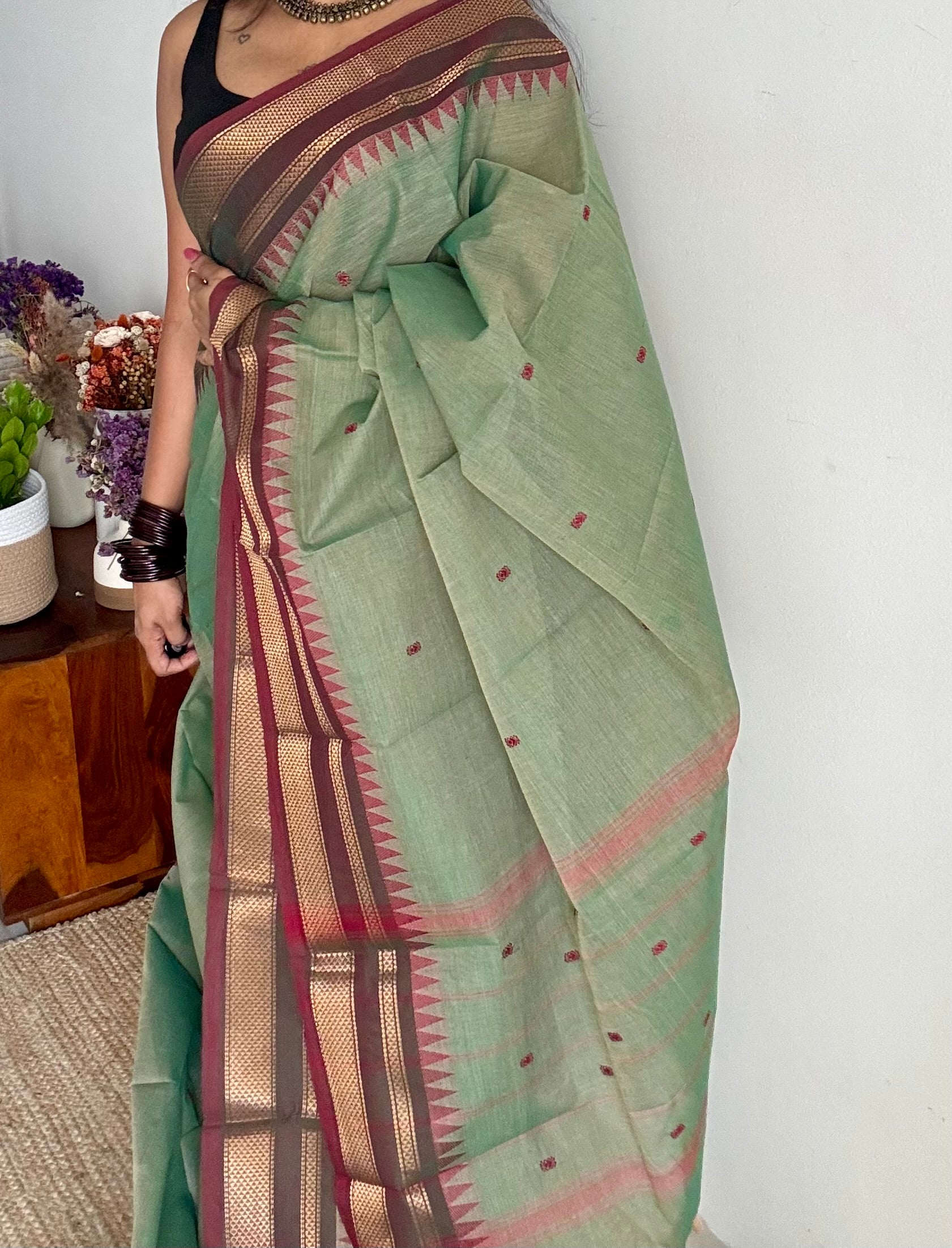 A beautiful Kanchi cotton saree with in mint green with brown antique gold khun weave inspired zari border. Lightweight, breathable, and soft, it is ideal for summer wear, everyday use, and comfortable draping. Comes with an intricate border and running blouse.