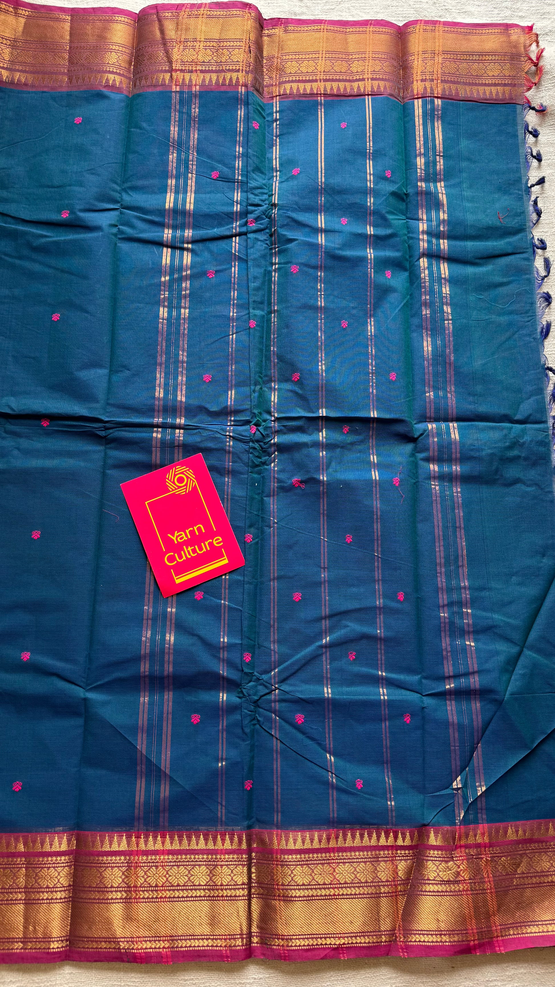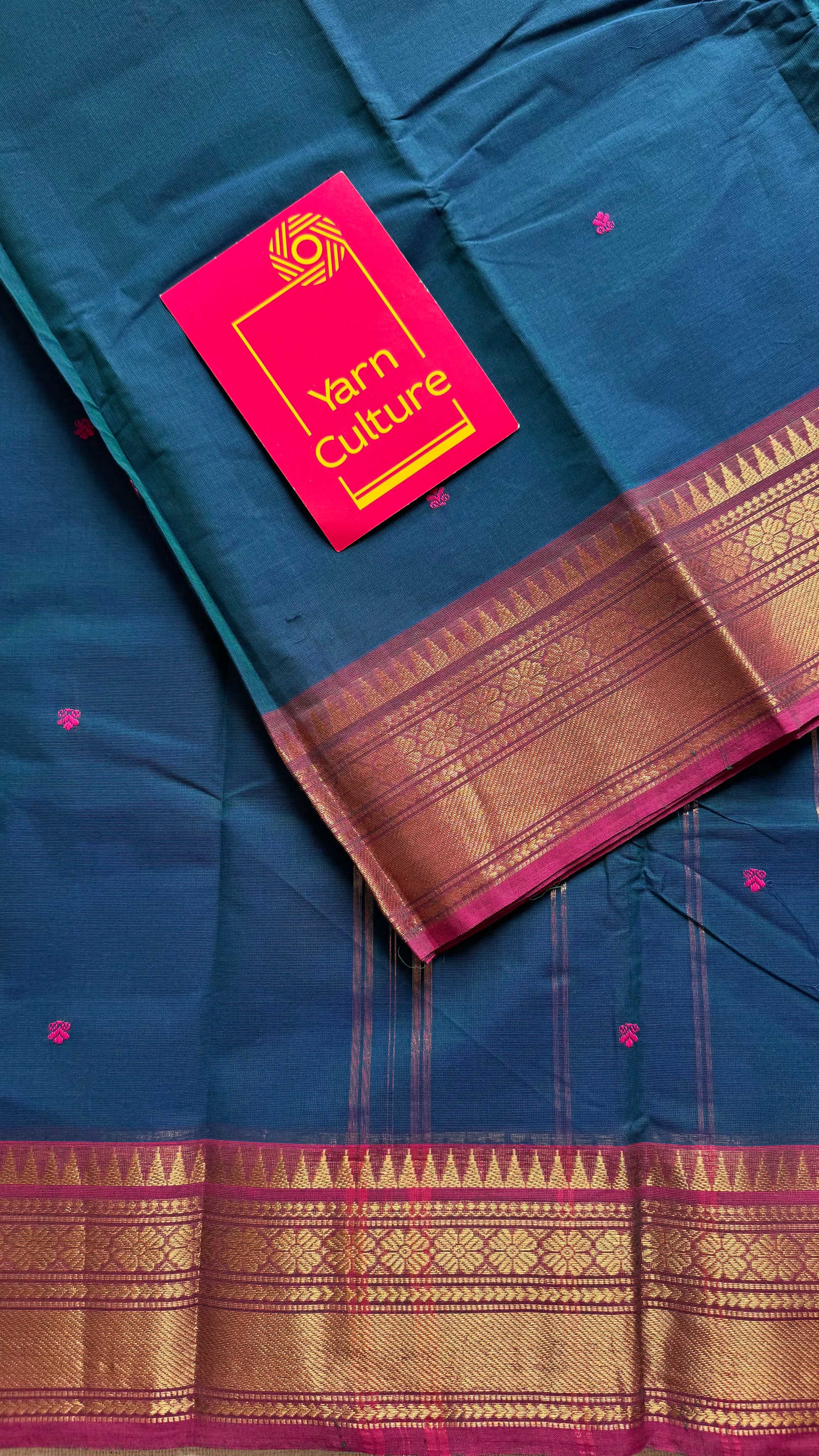 A beautiful Kanchi cotton saree in peacock blue with a dark pink border. Lightweight, breathable, and soft, it is ideal for summer wear, everyday use, and comfortable draping. Comes with an intricate border, pink buttas all over the body and with running blouse.
