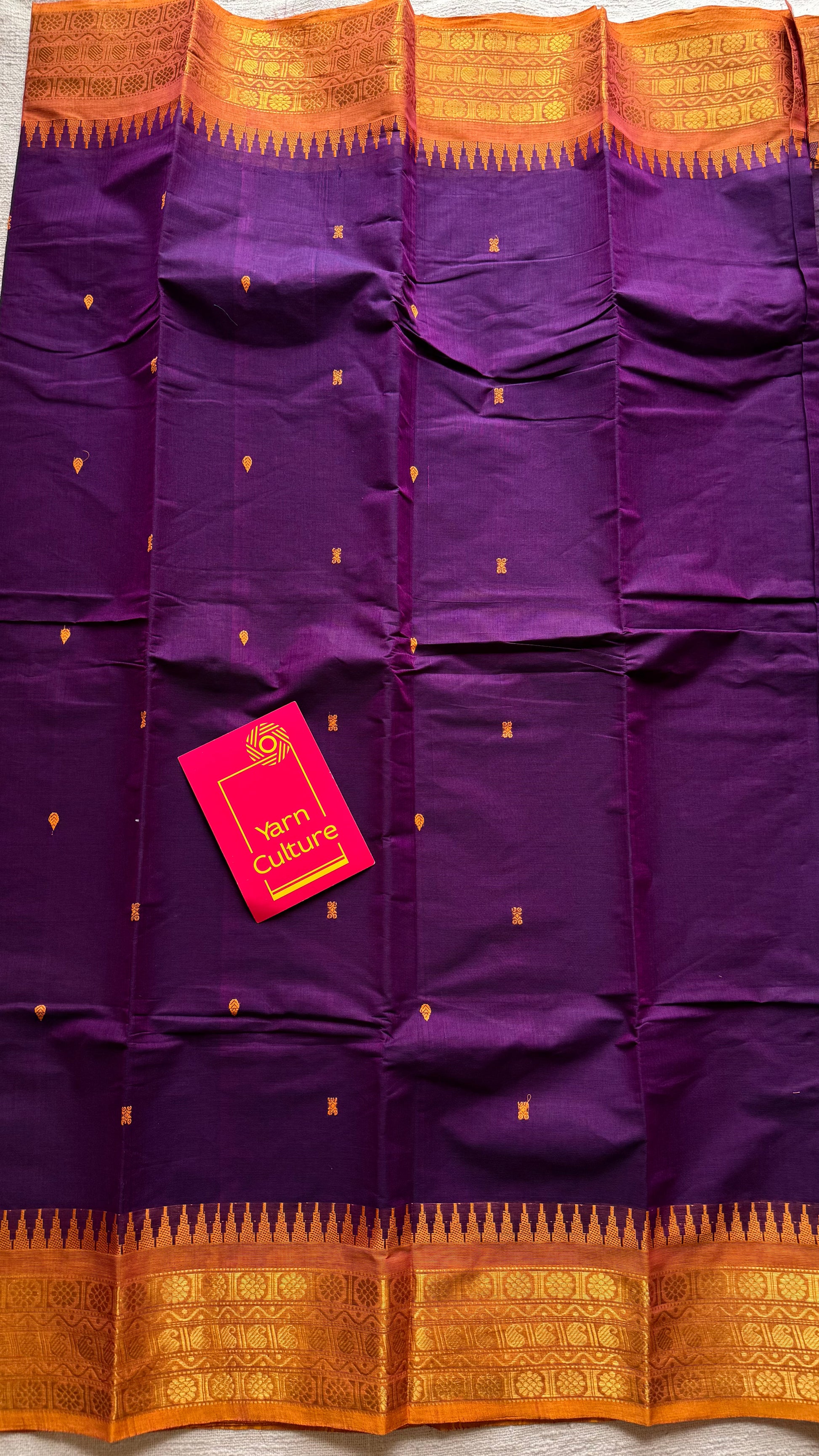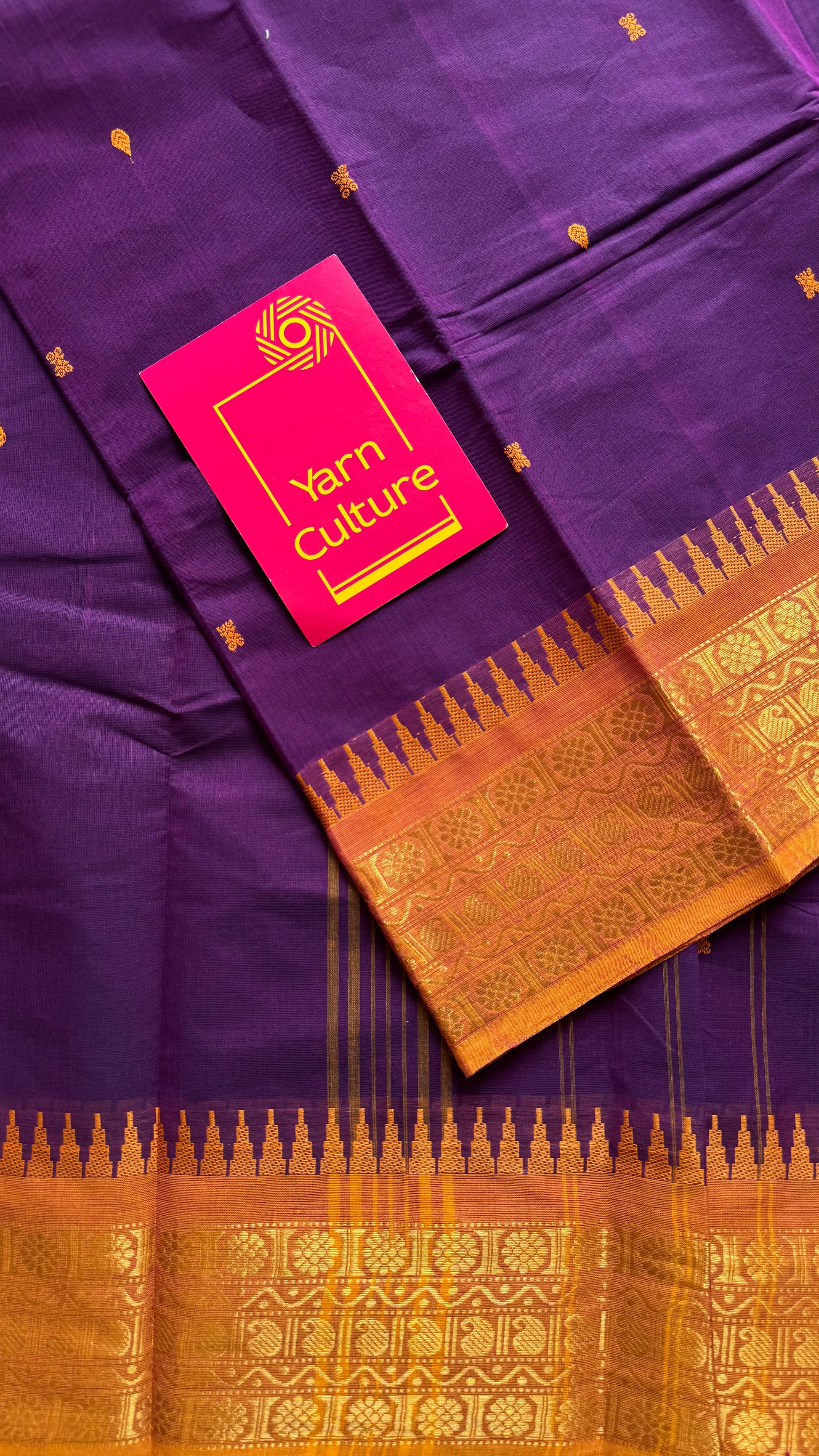 A beautiful Kanchi cotton saree in purple with a dark yellow border. Lightweight, breathable, and soft, it is ideal for summer wear, everyday use, and comfortable draping. Comes with an intricate border, yellow buttas all over the body and with running blouse.