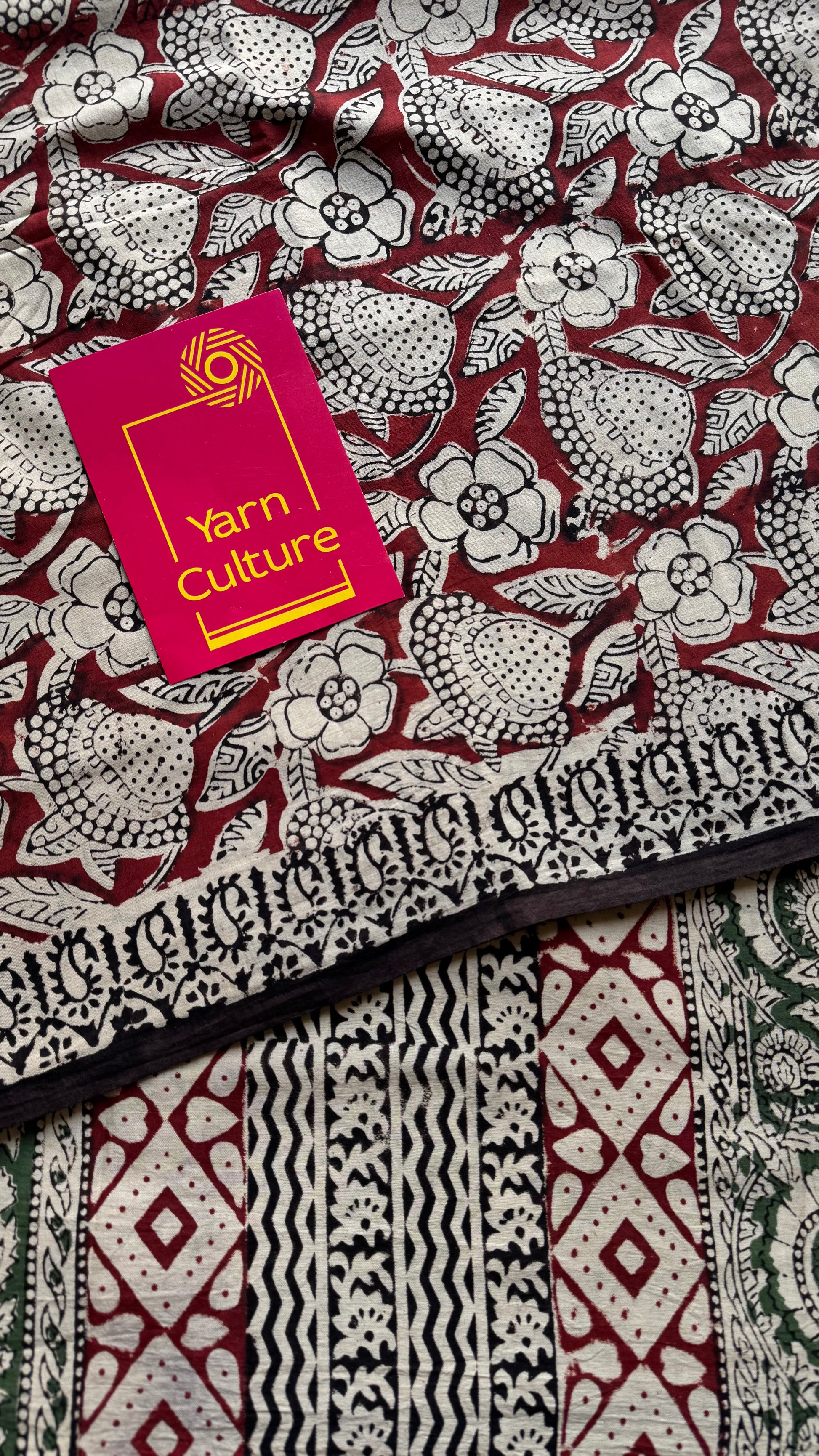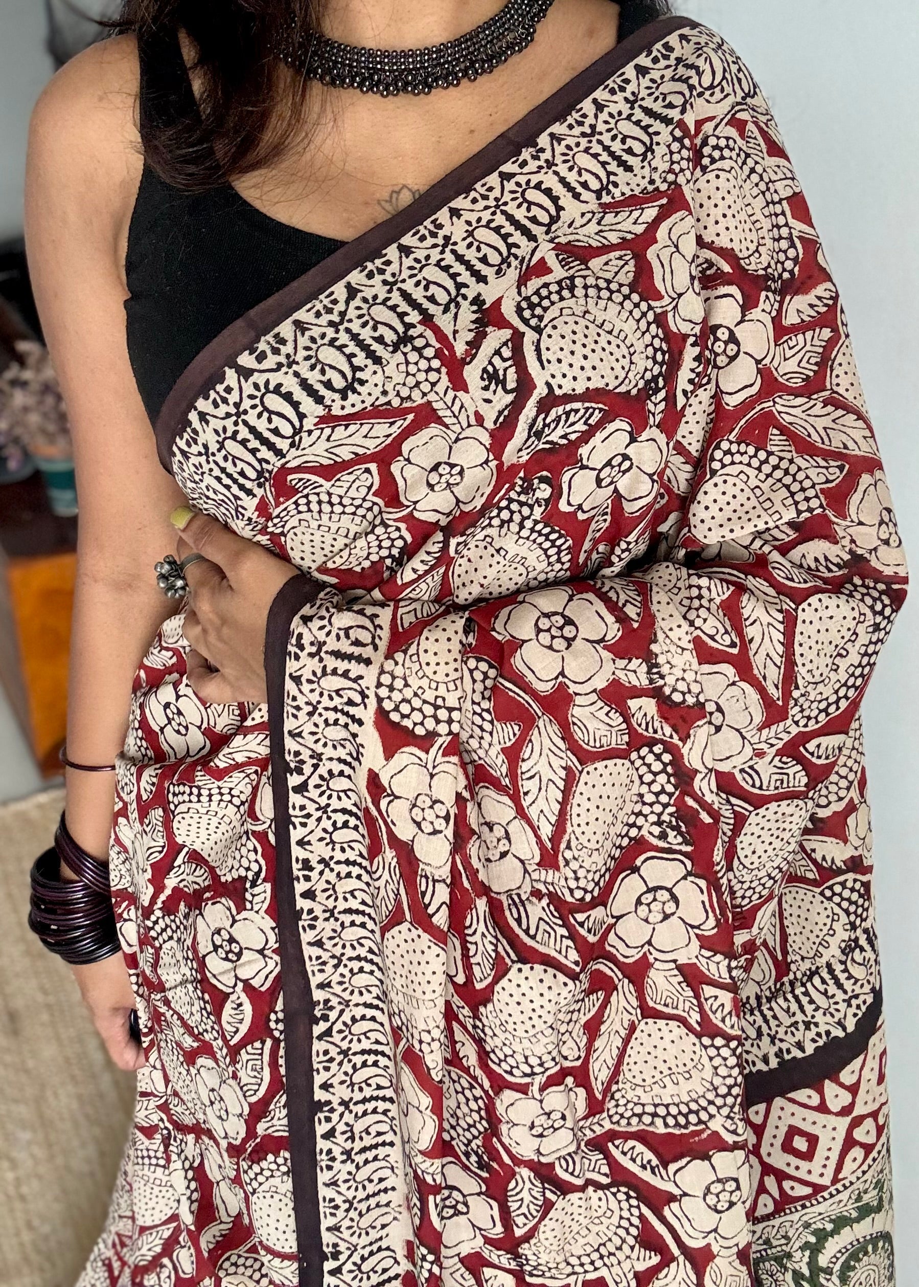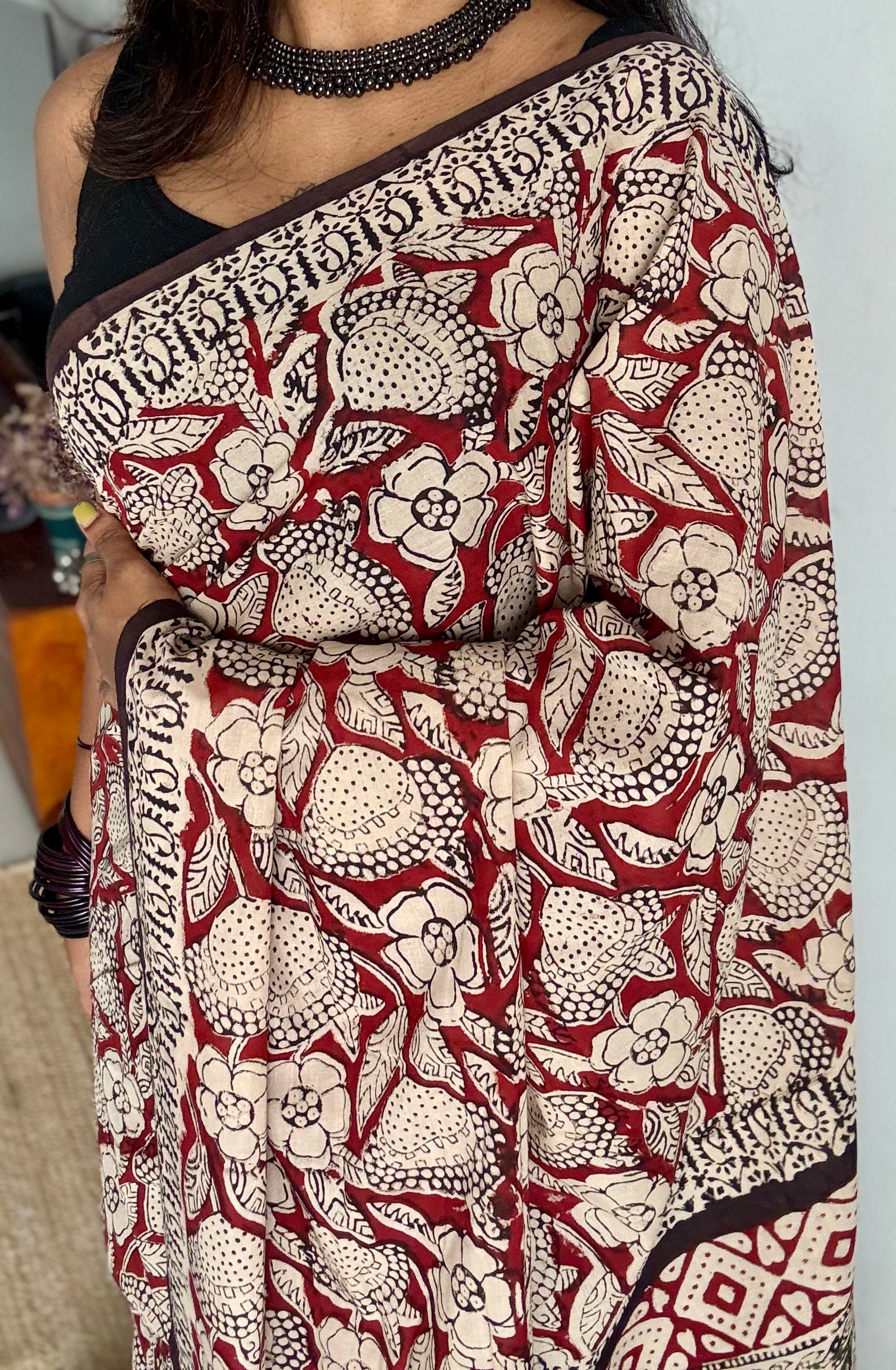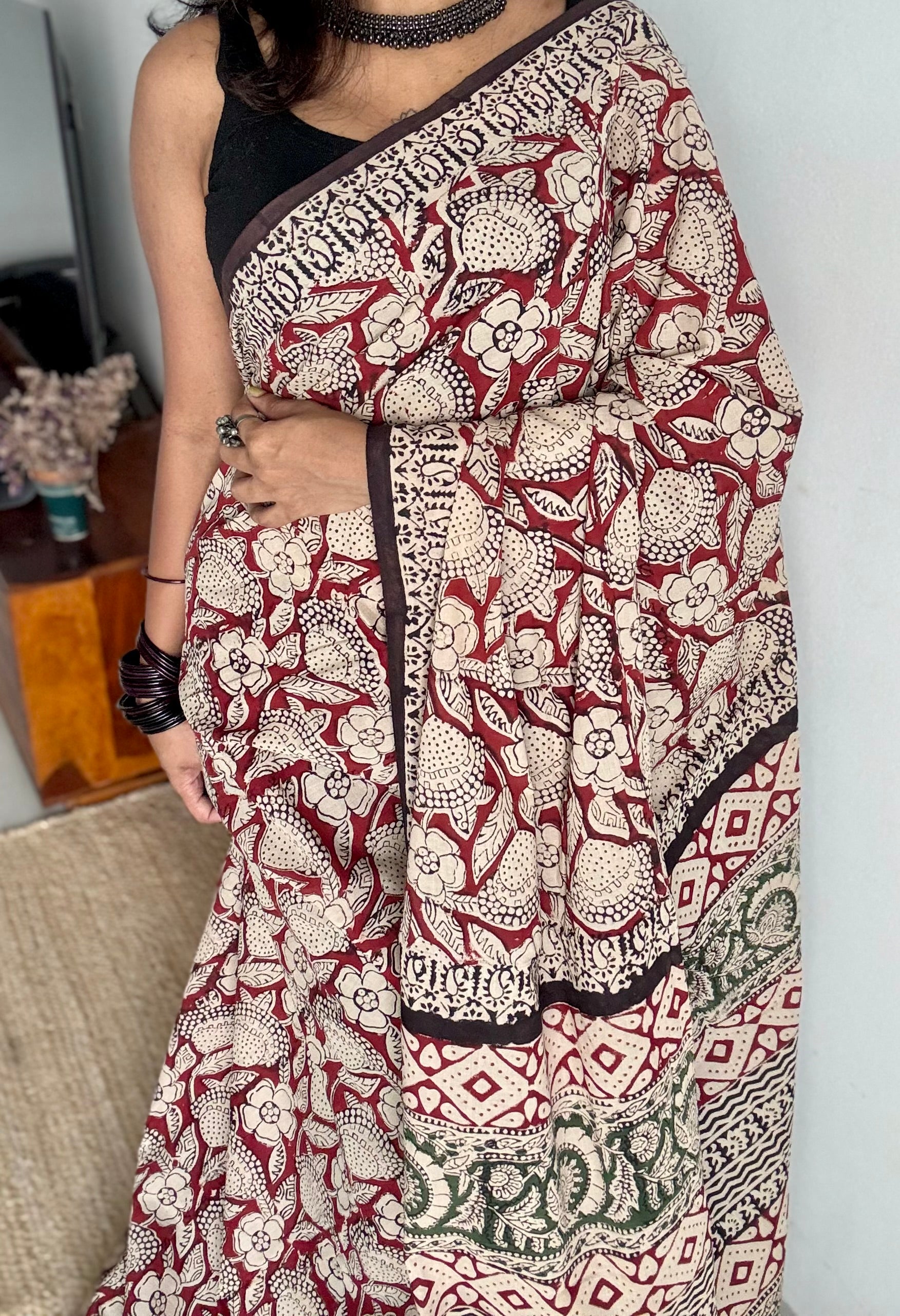 A deep red base with cream floral and paisley motifs, soft, easy to drape, comes with running blouse fabric in a contrast pattern.