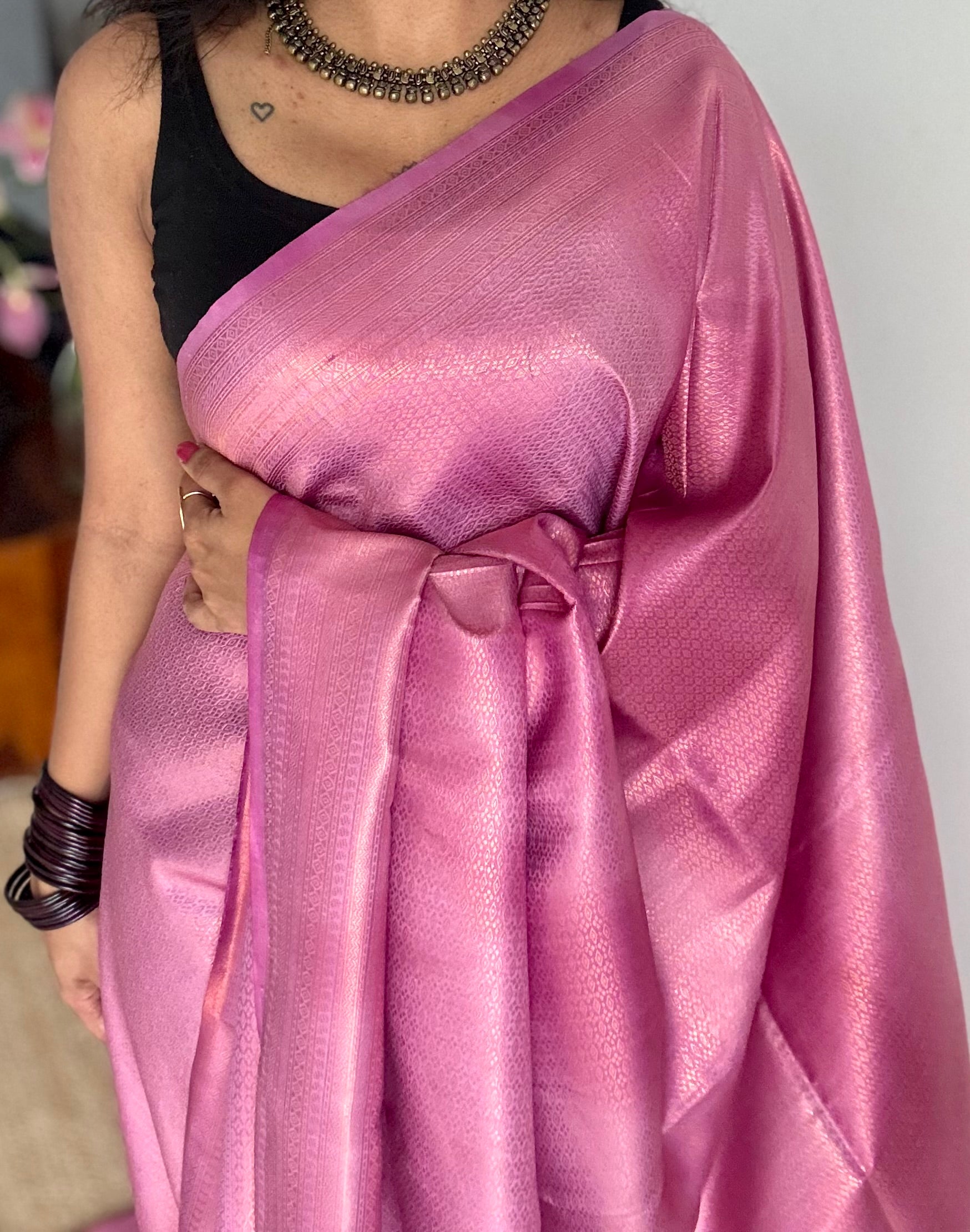 Lavender pink dual tone, semi -silk, antique gold intricate detailing, running blouse.