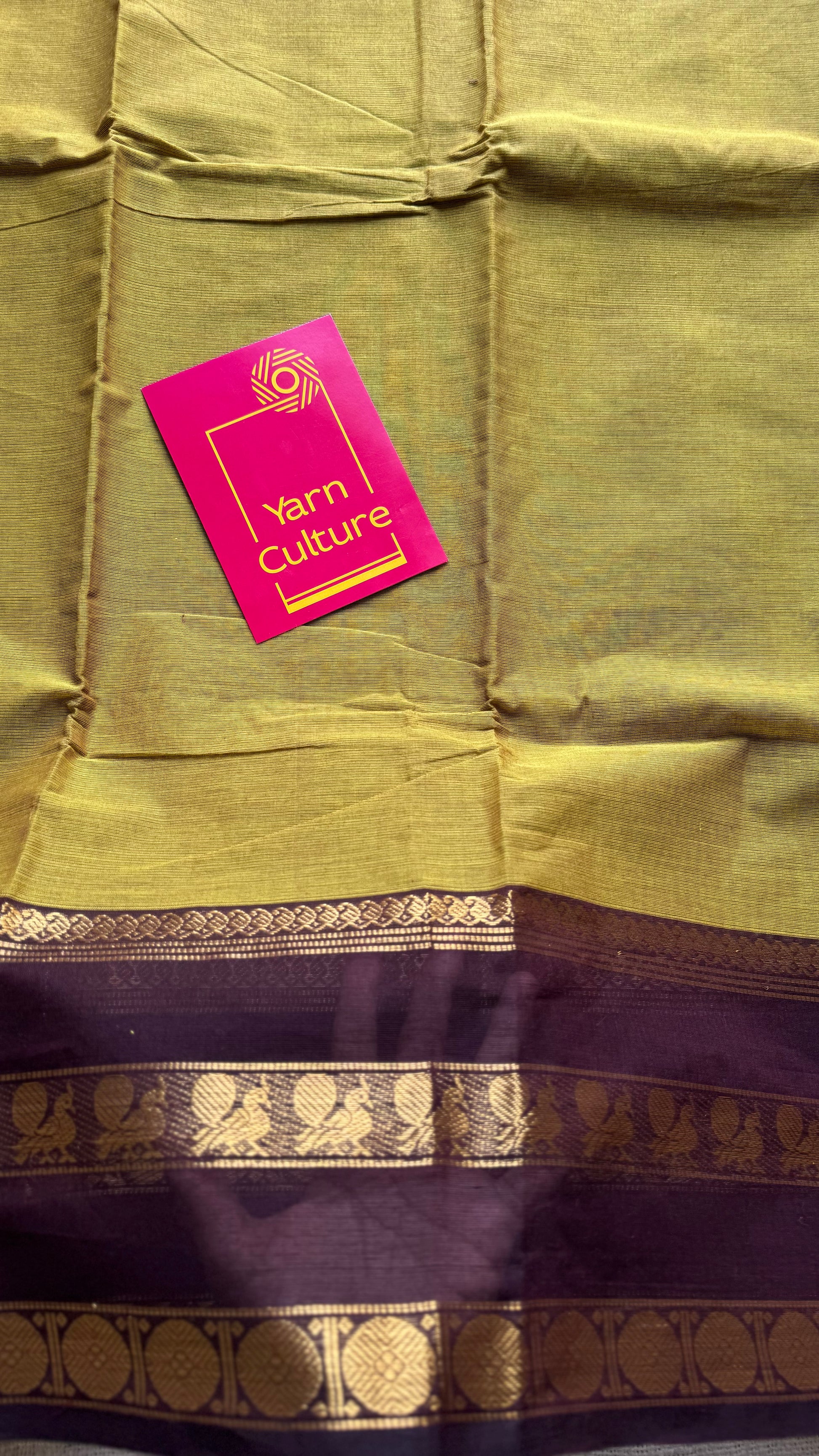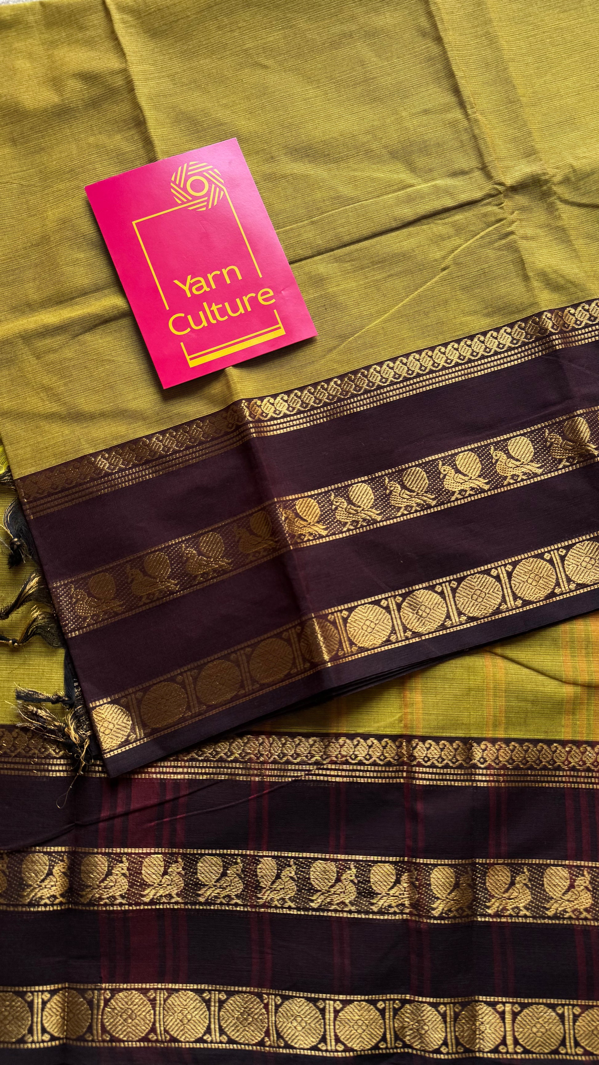 Lemon ginger green with brown contrast border, kanchi cotton - YCCOTNOCCC04