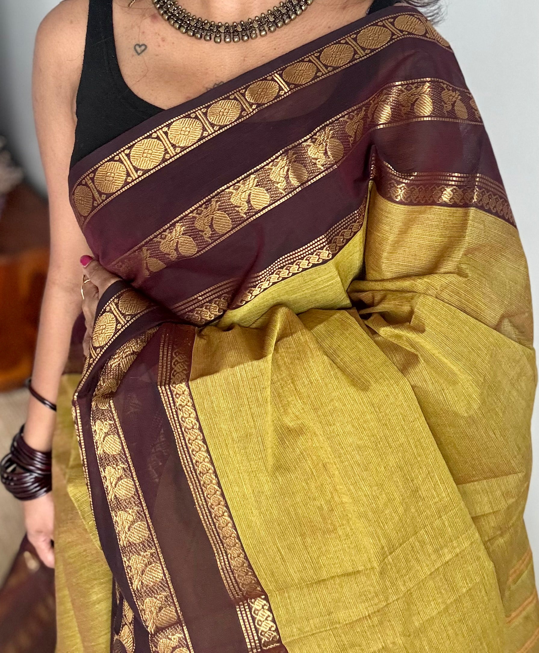 Lemon ginger green with brown contrast border, kanchi cotton.