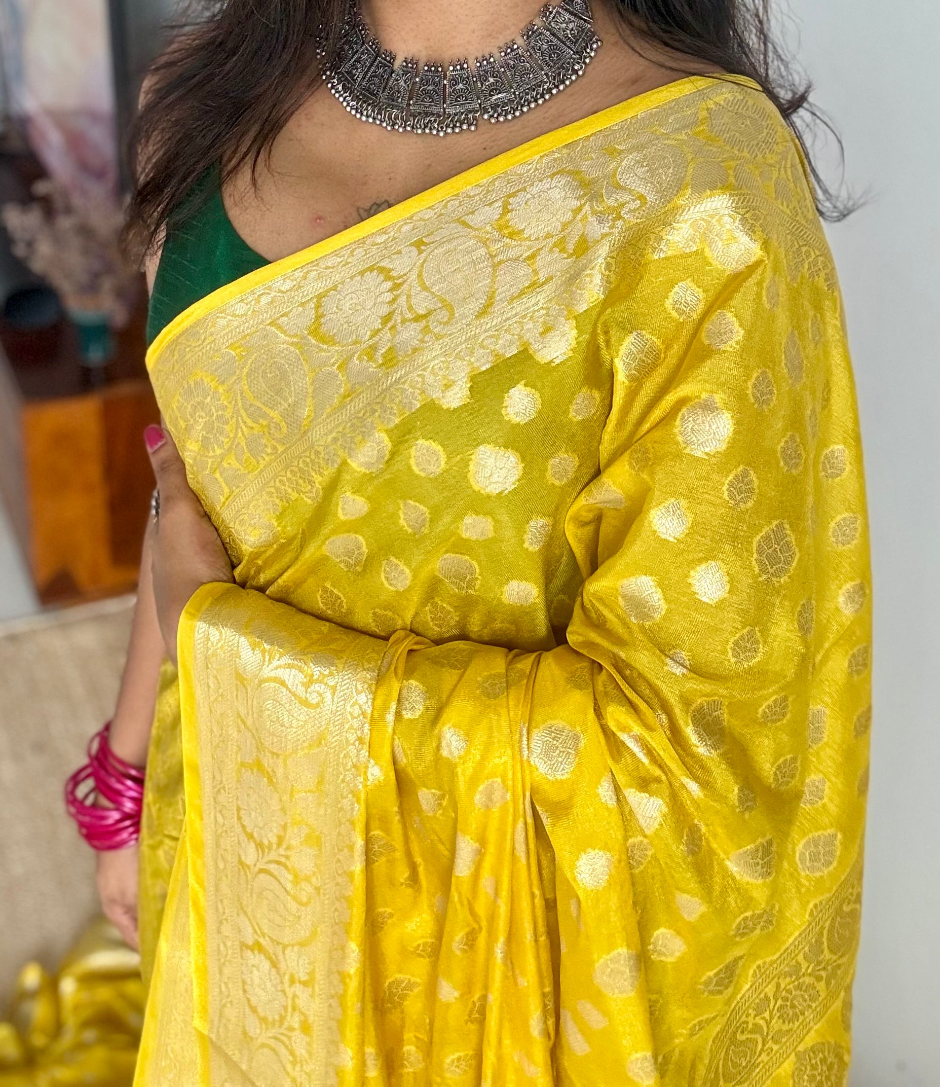 Lemon yellow, silver buttas and zari, Banarasi semi-silk with georgette mix - festive, and perfect for Diwali or any occasion. Intricate pallu and blouse fabric. Effortless to drape, flowy, light to carry, and rich in look, this is a saree made to shine with you this season.