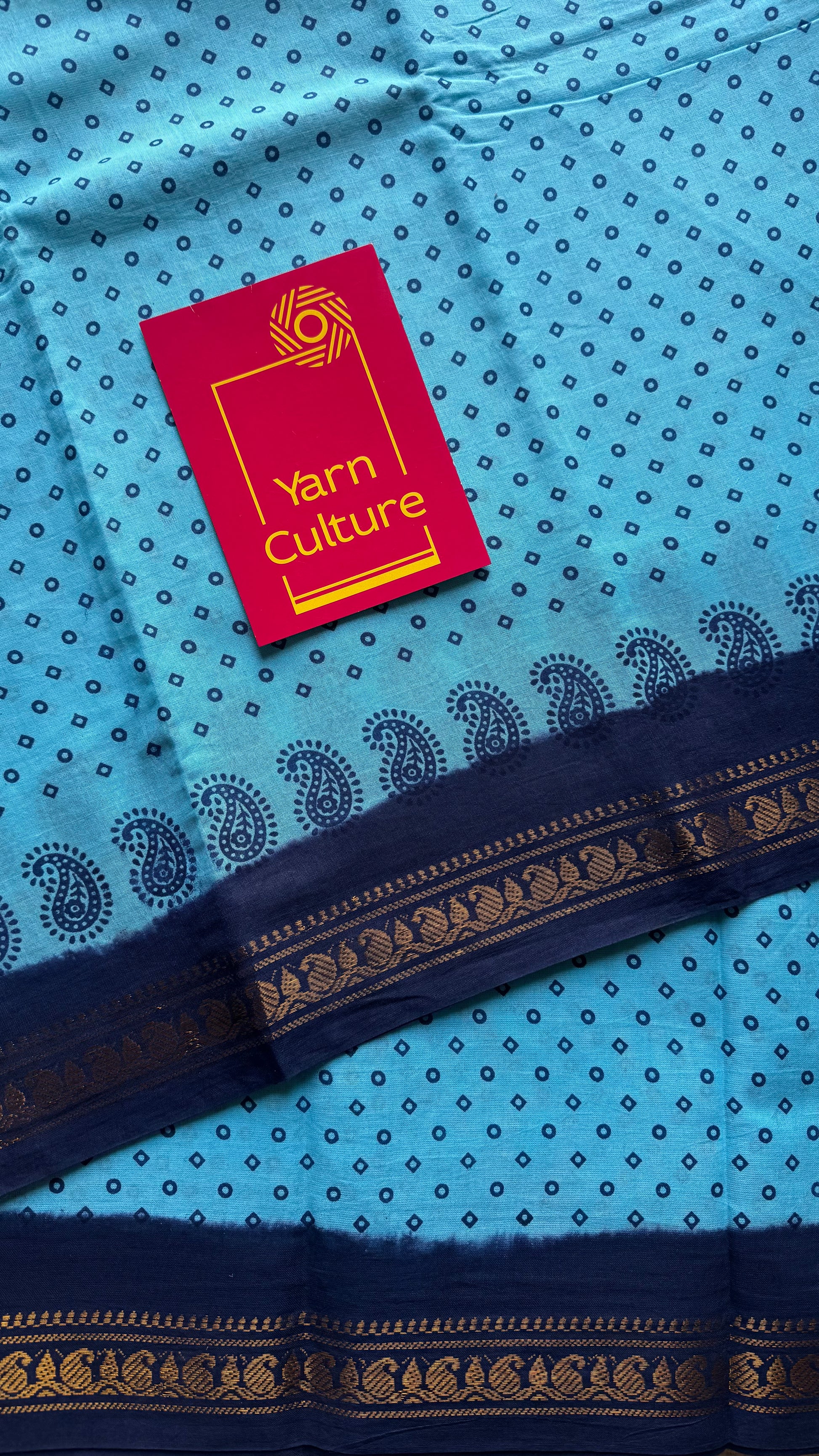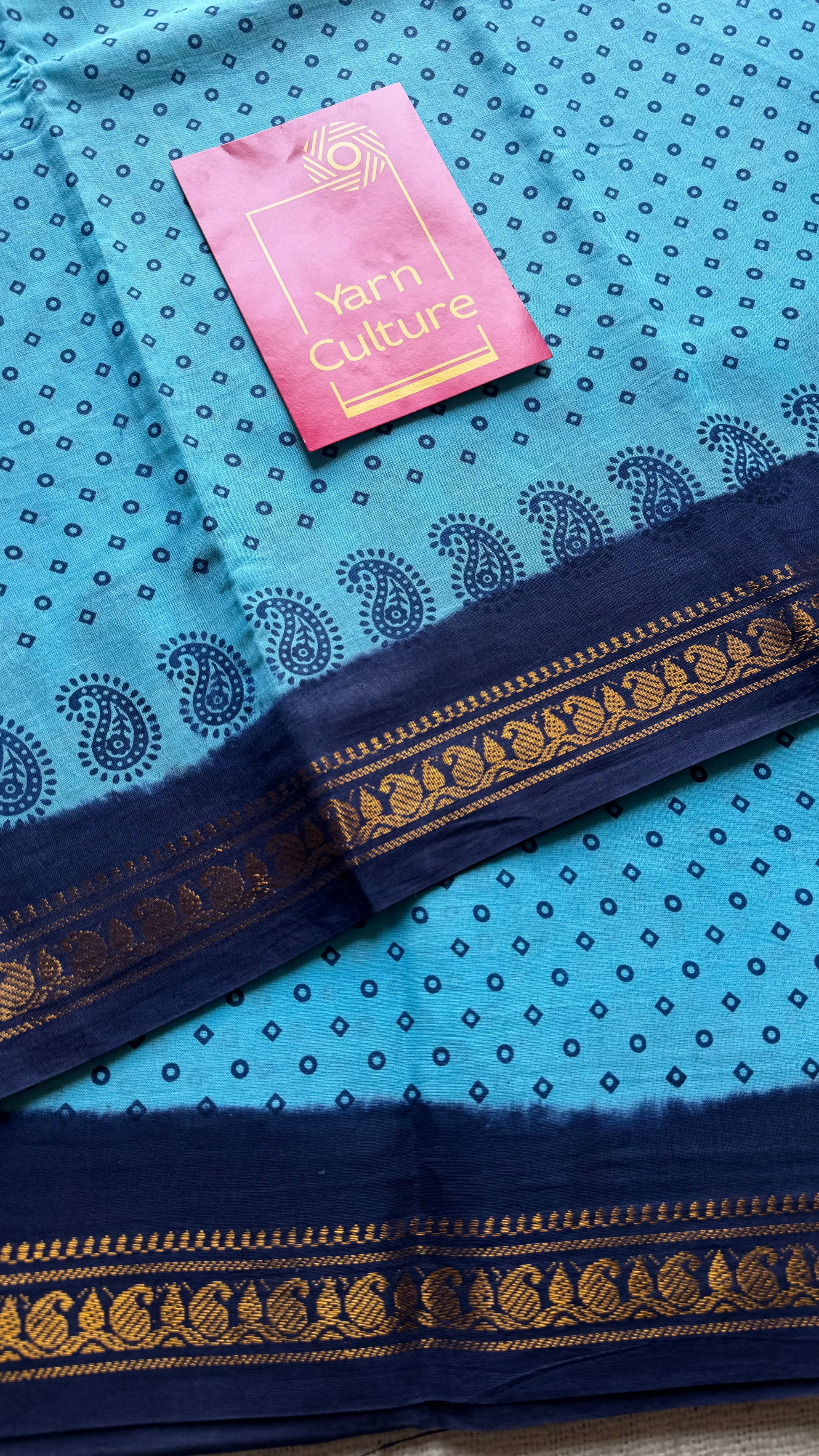 Light blue with dark blue, motif printed, kattuchayam dyed madurai sungudi cotton saree - YCCOTNMSFE76