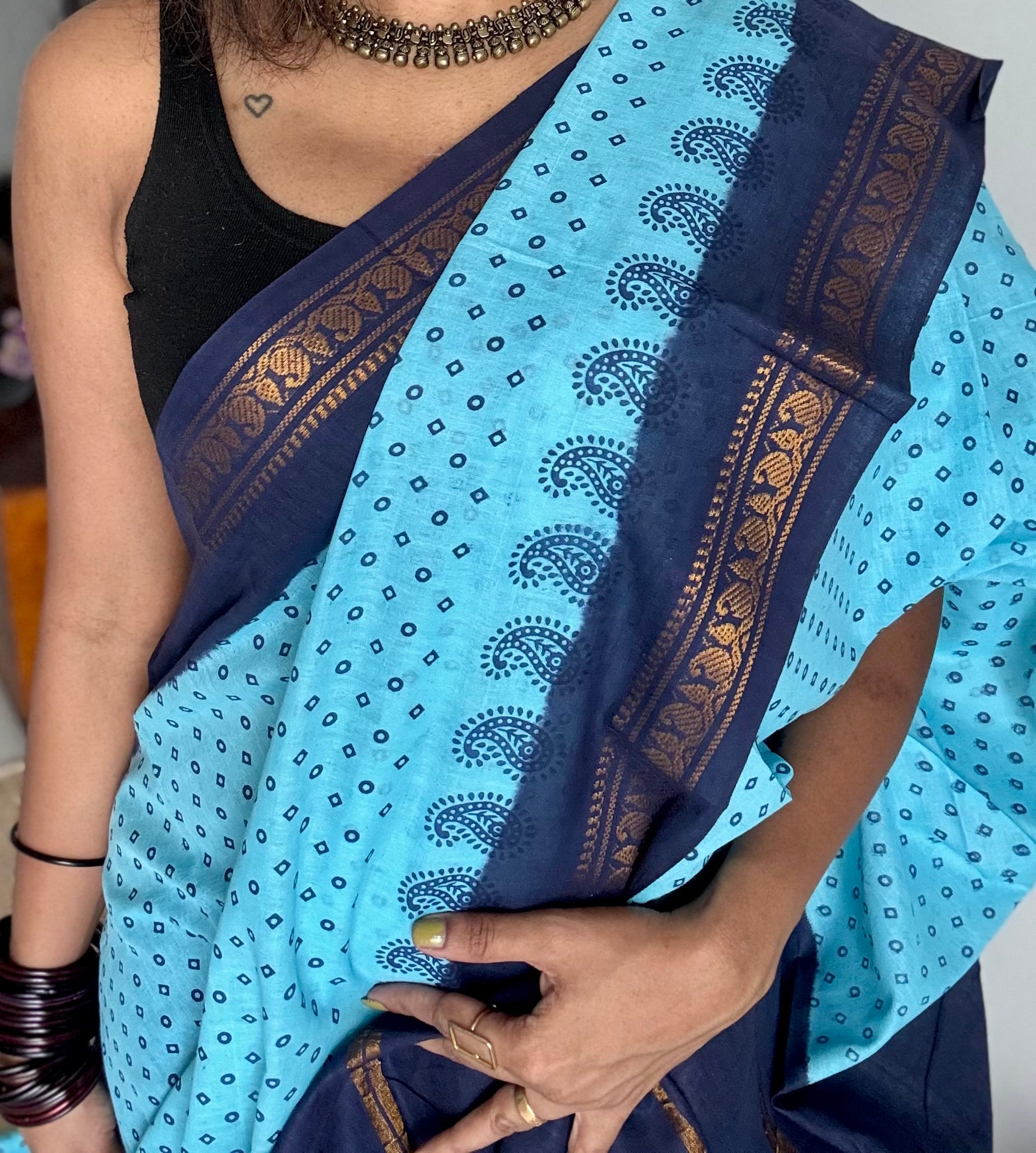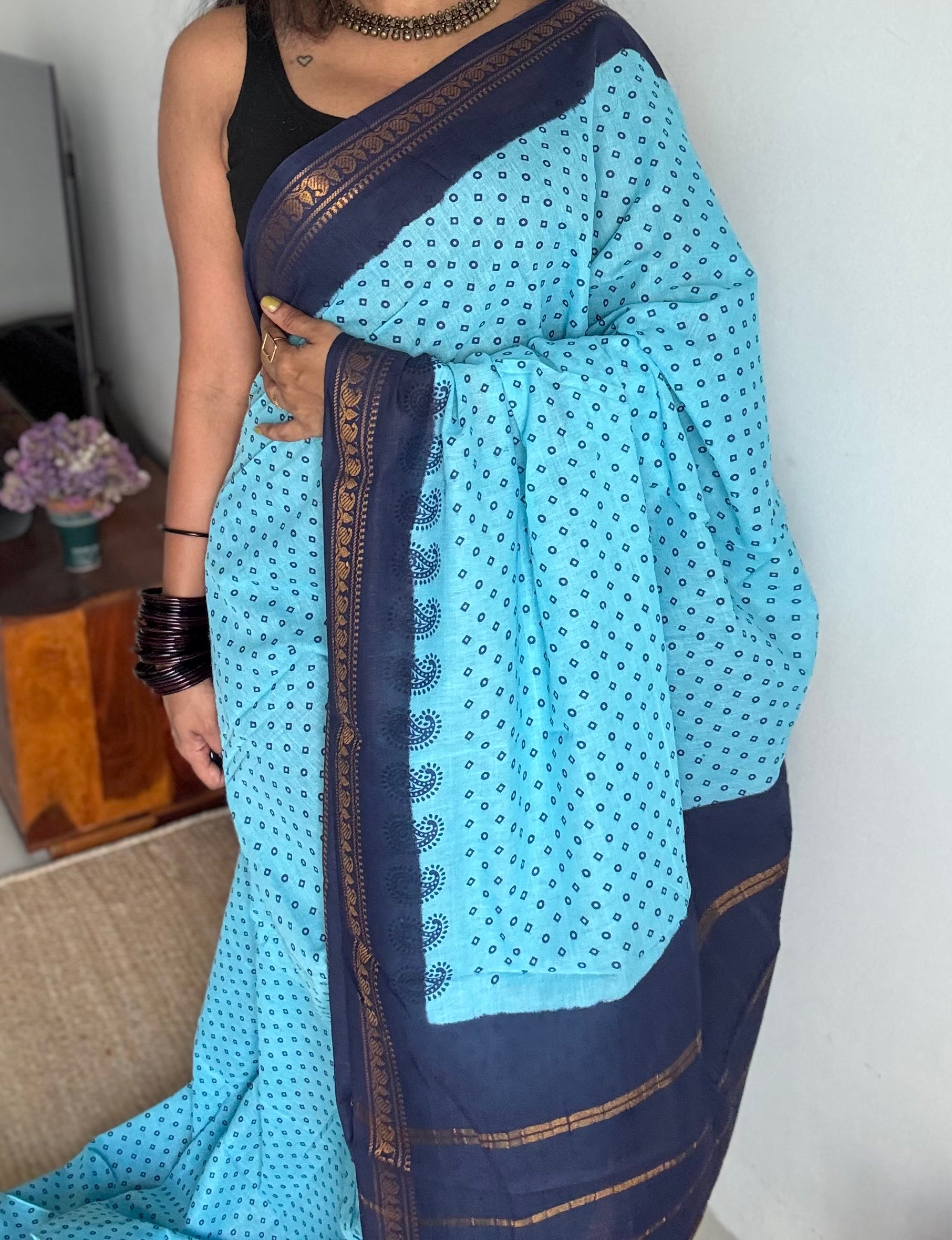 These sarees are dyed and dried in sunlight. Colour smudges are quite common in sungudi sarees.