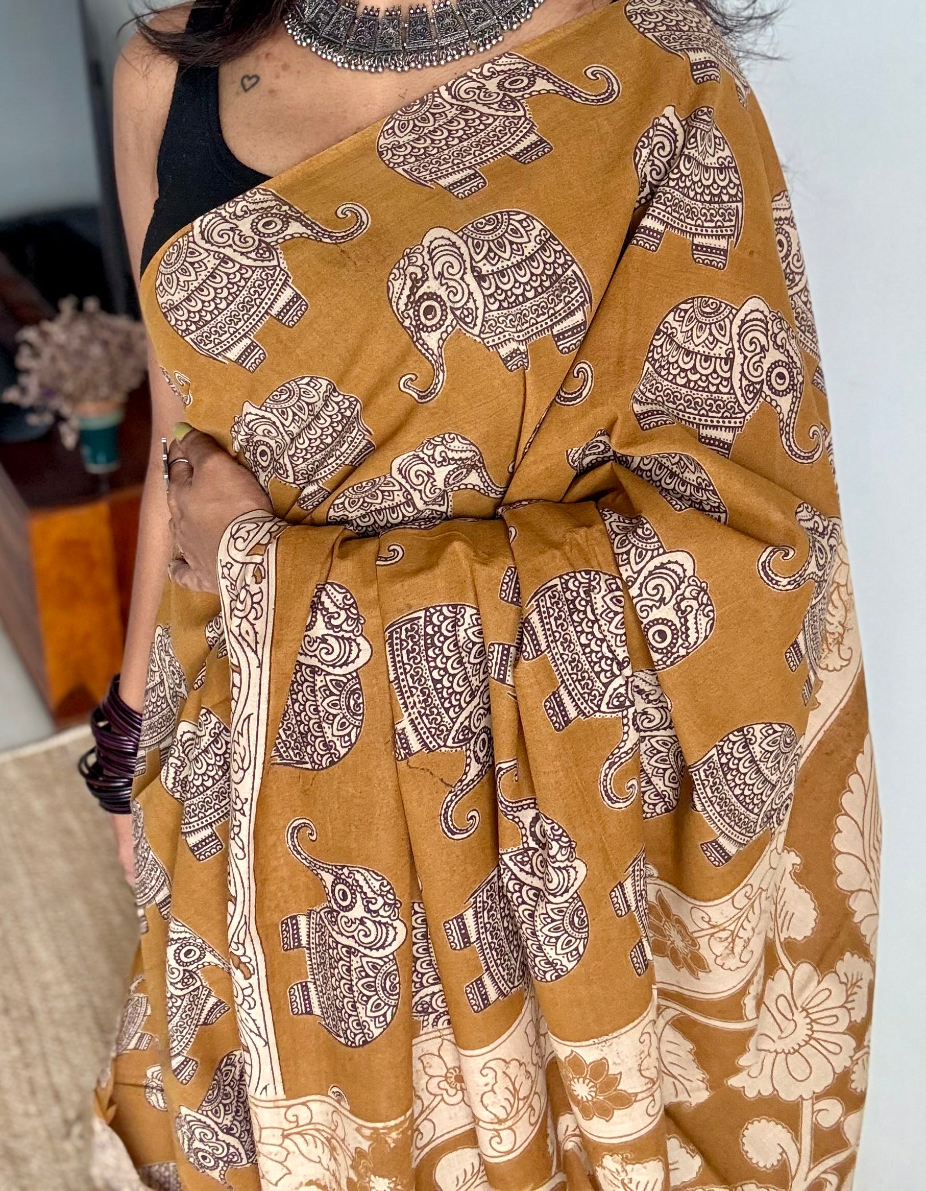 Light brown kalamkari, elephant motifs, soft cotton. Comes with running blouse in a contrast colour.