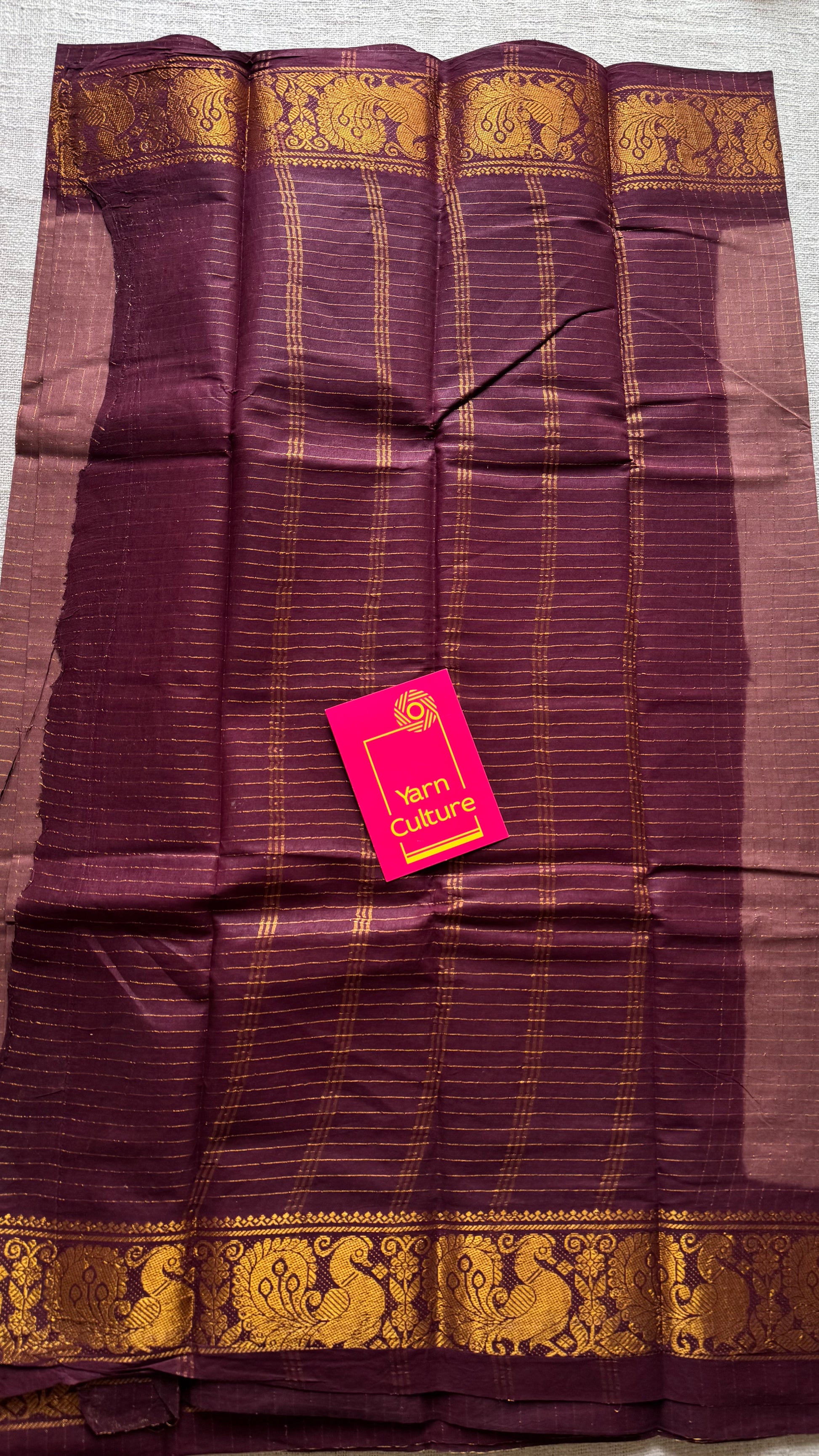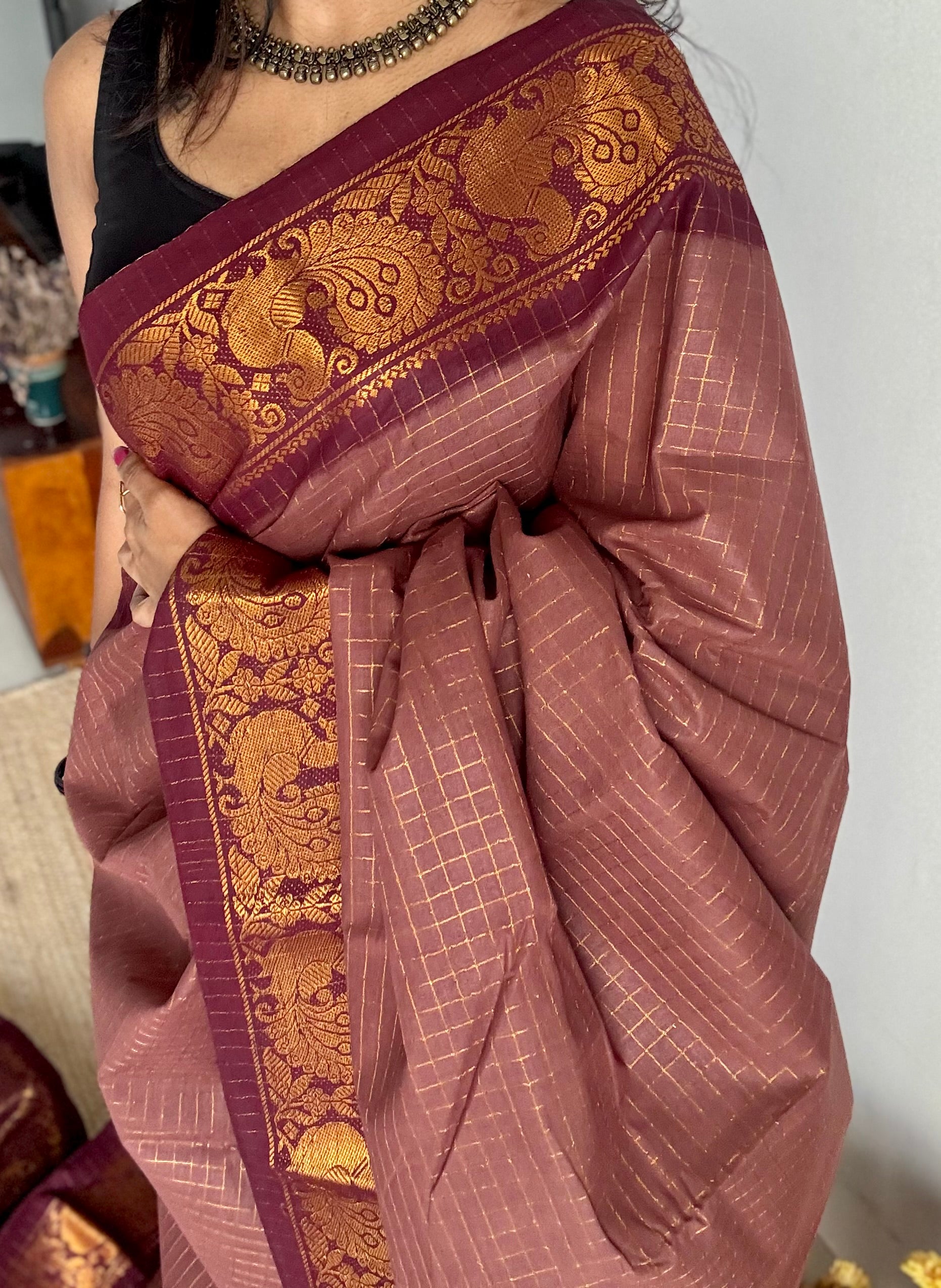 Light brown with maroon sungudi, kattuchayam dyed, soft madurai cotton, no blouse.