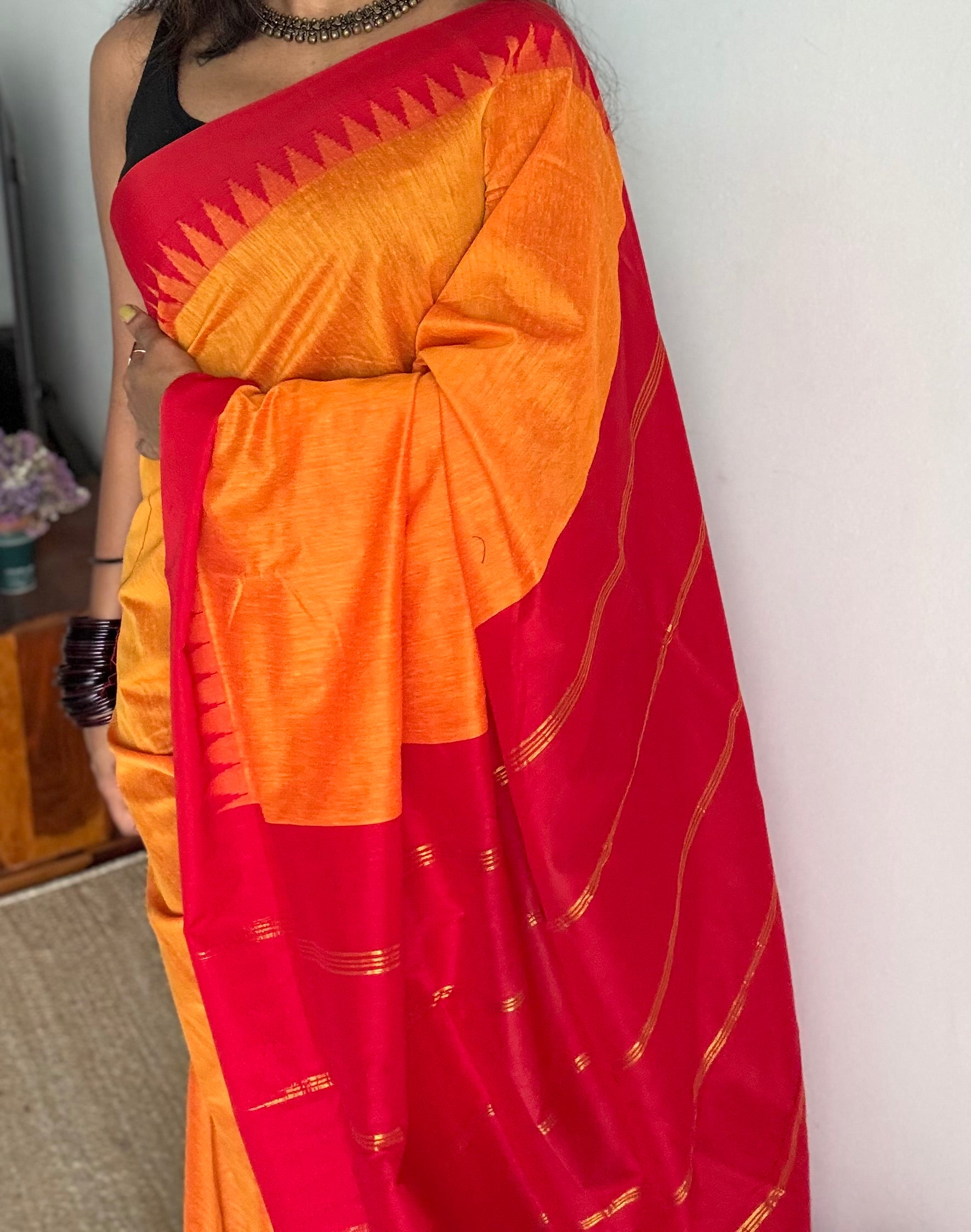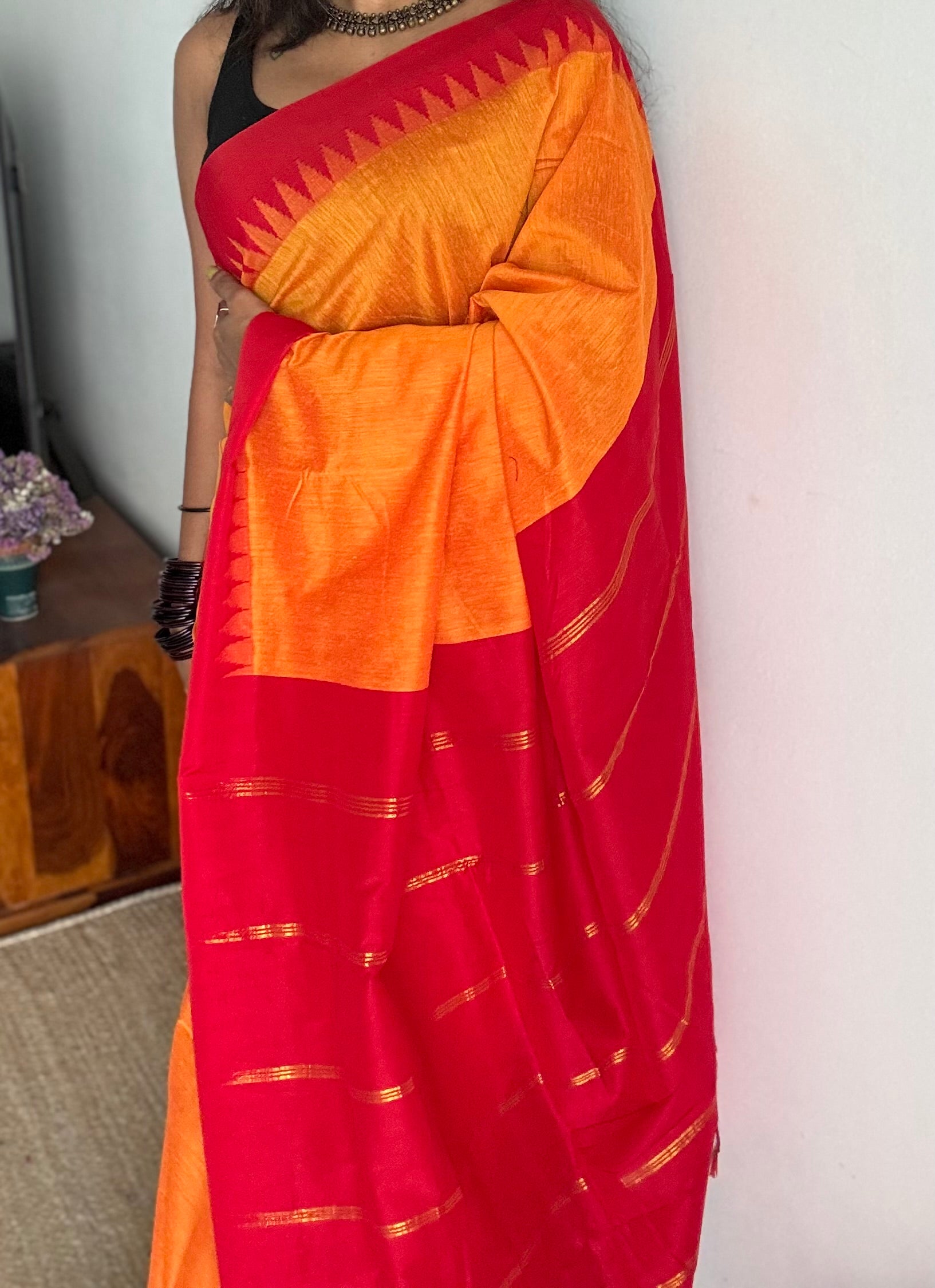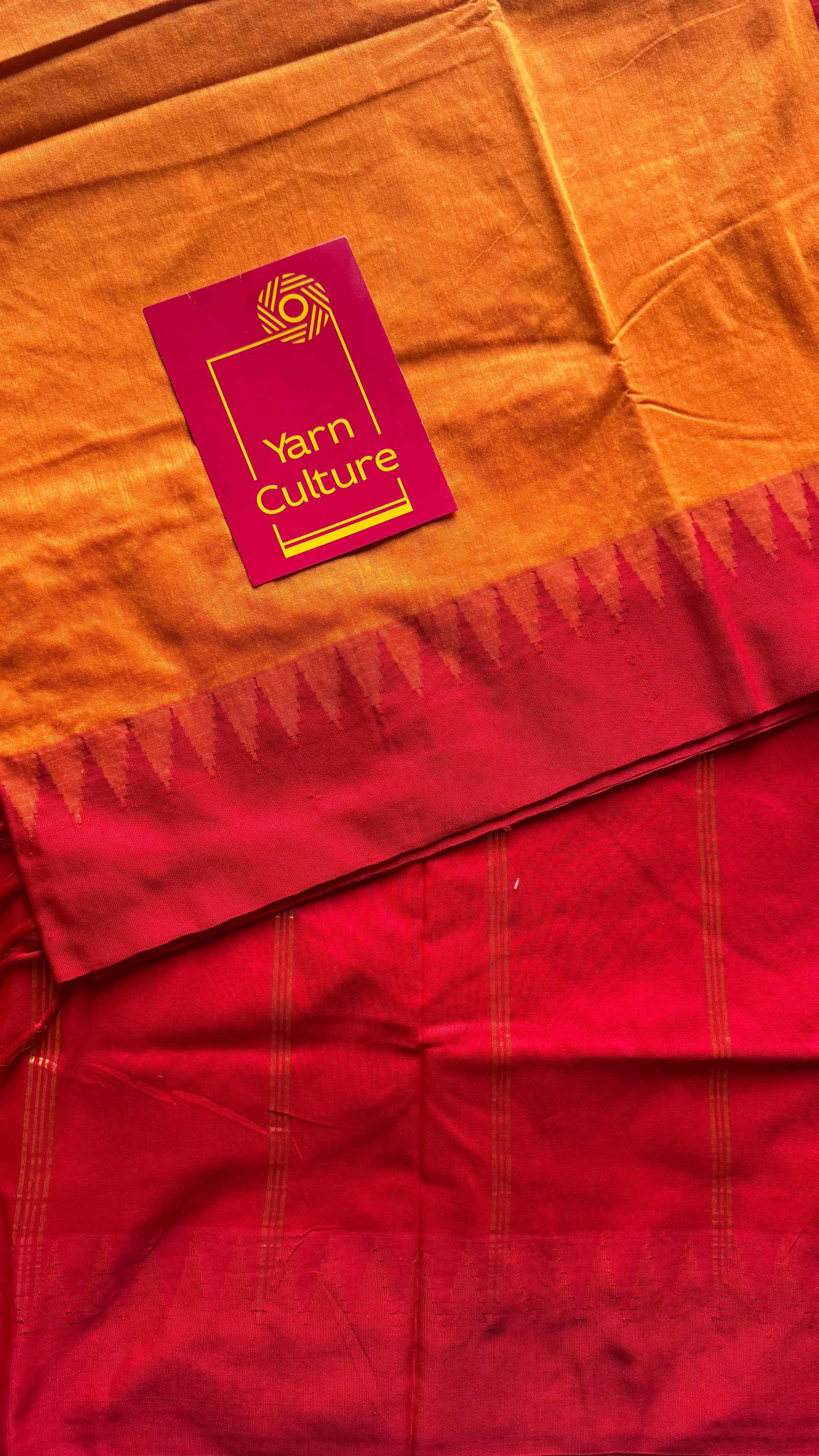 Light orange with red contrast, temple border saree, cotton silk - YCCOTNTBFE55