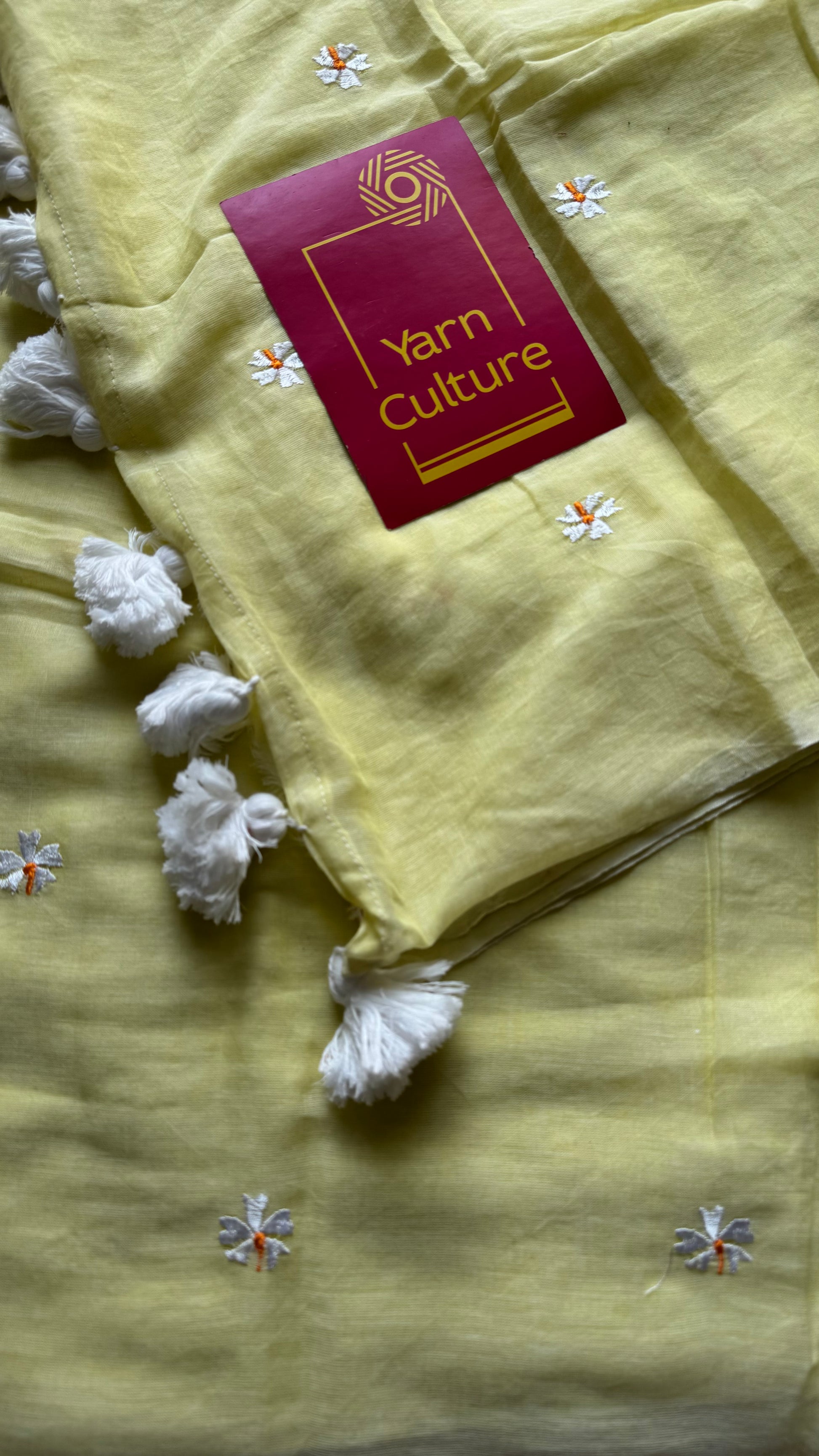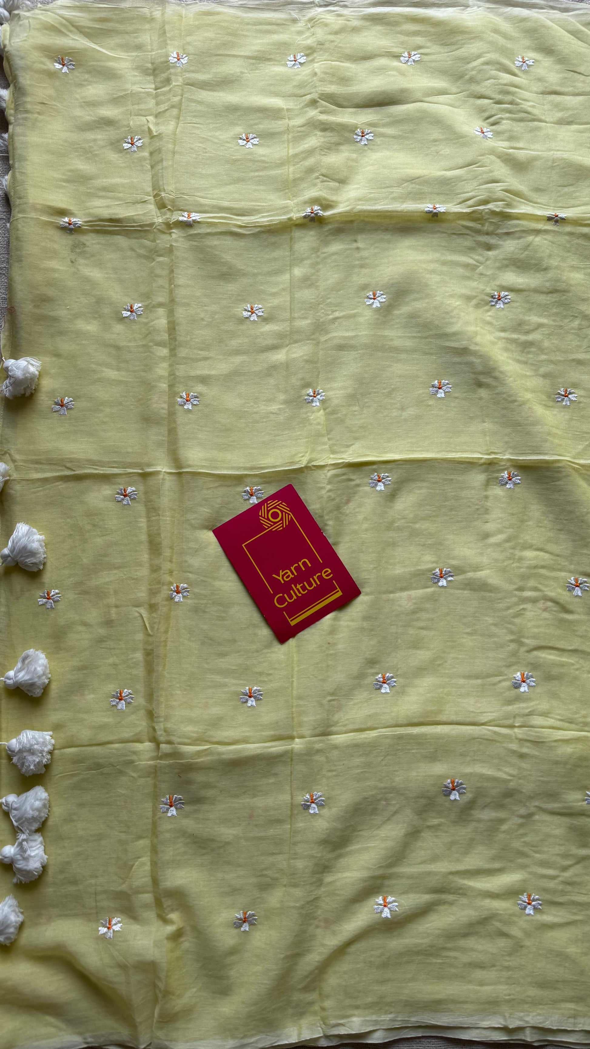 Light yellow parijat floral embroidered soft mul cotton saree - airy, breathable, and made for long summer days. Easy to drape, soft, easy to drape.