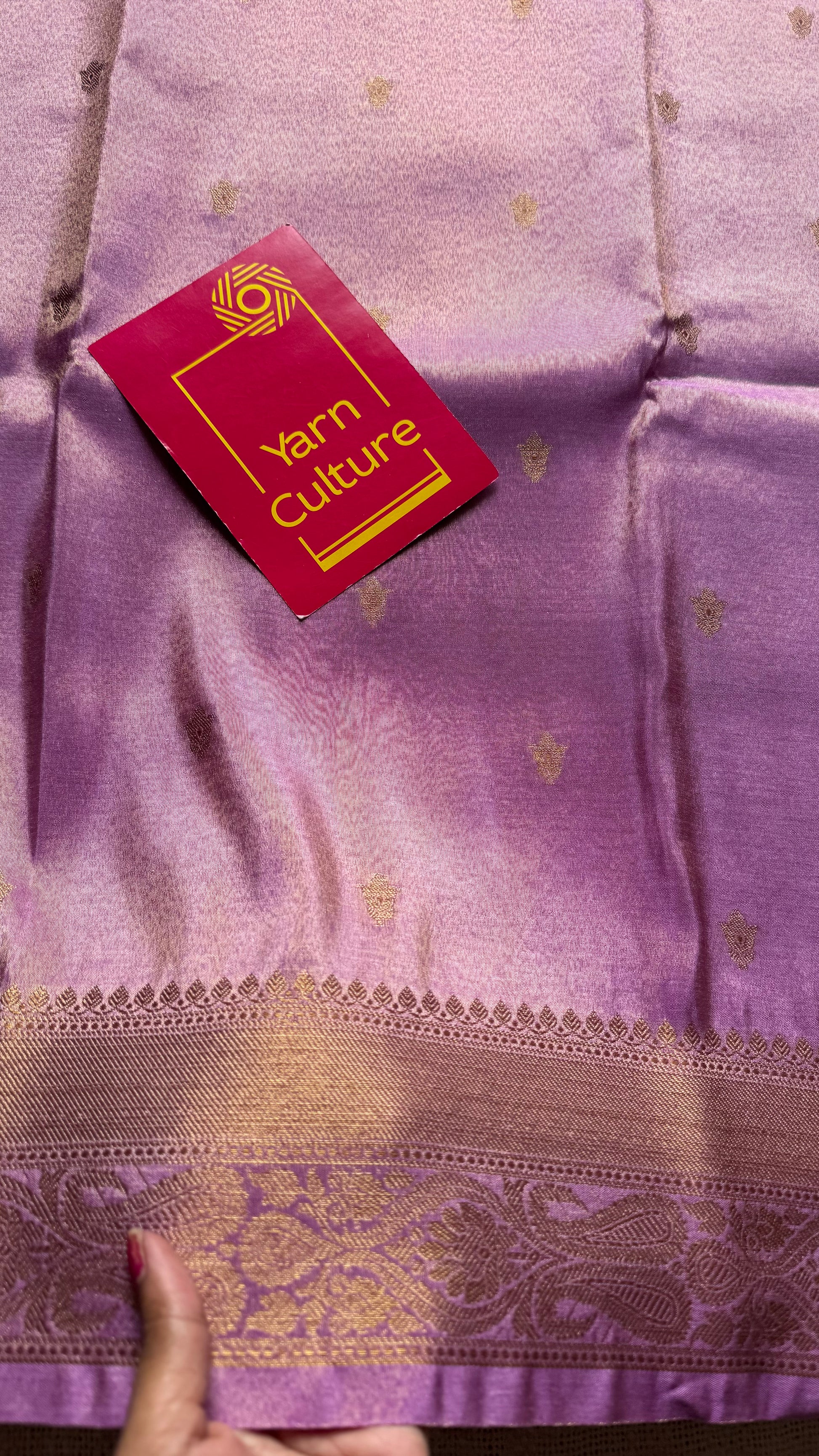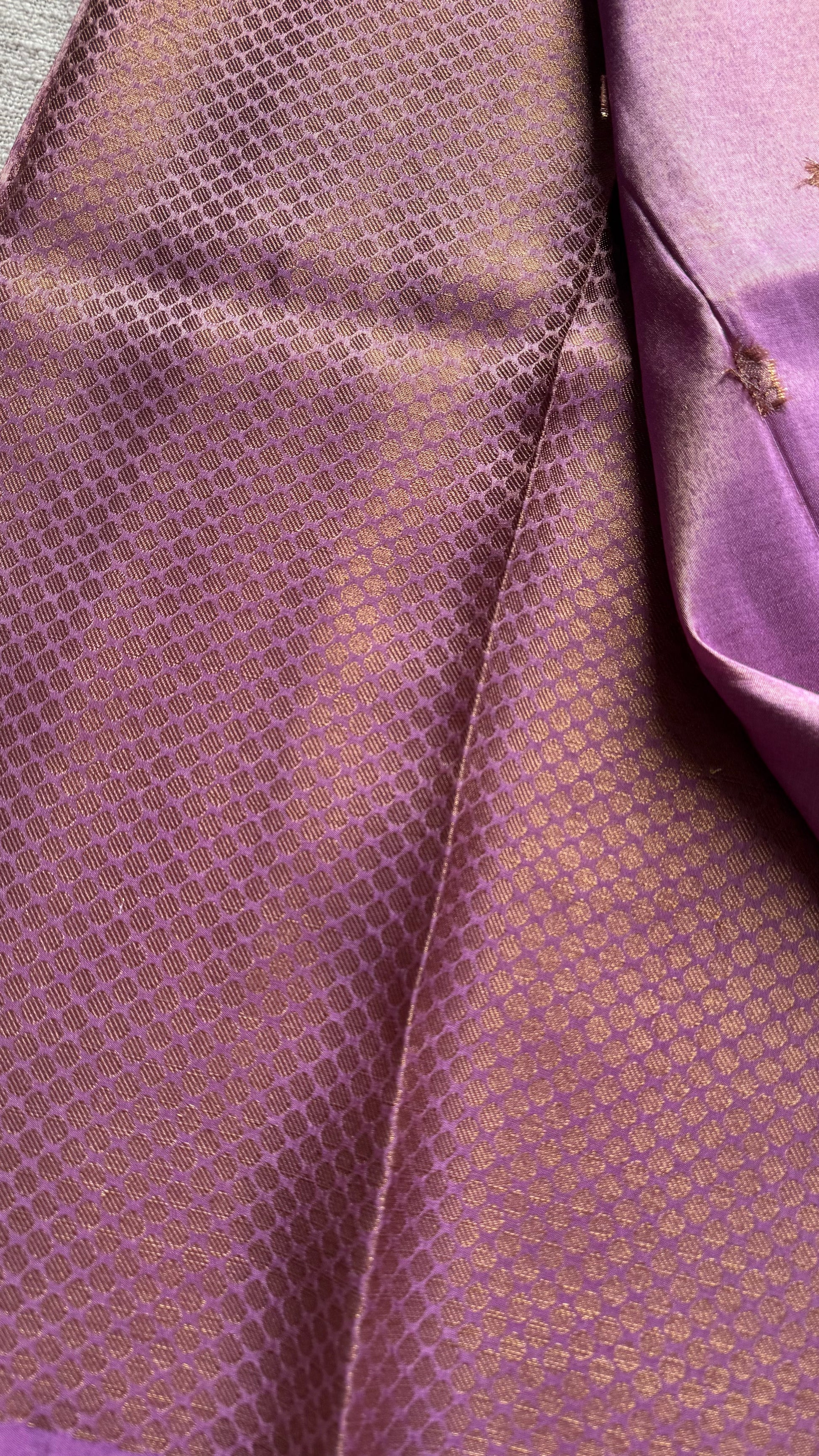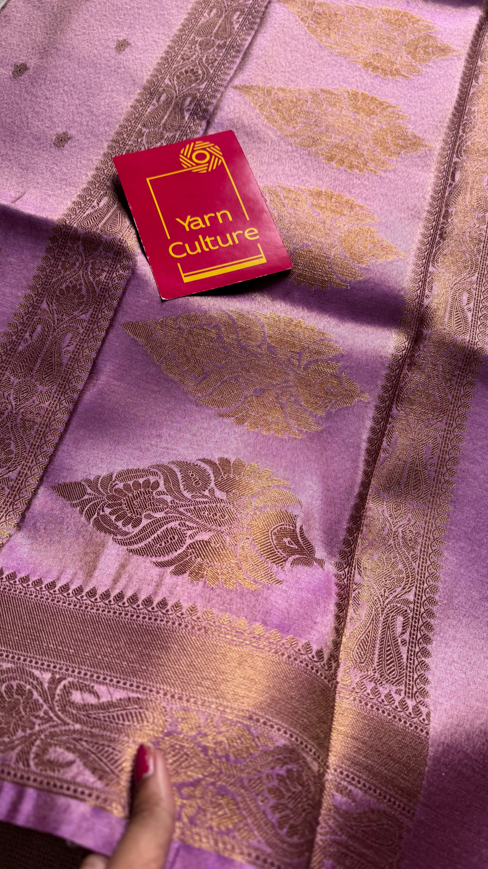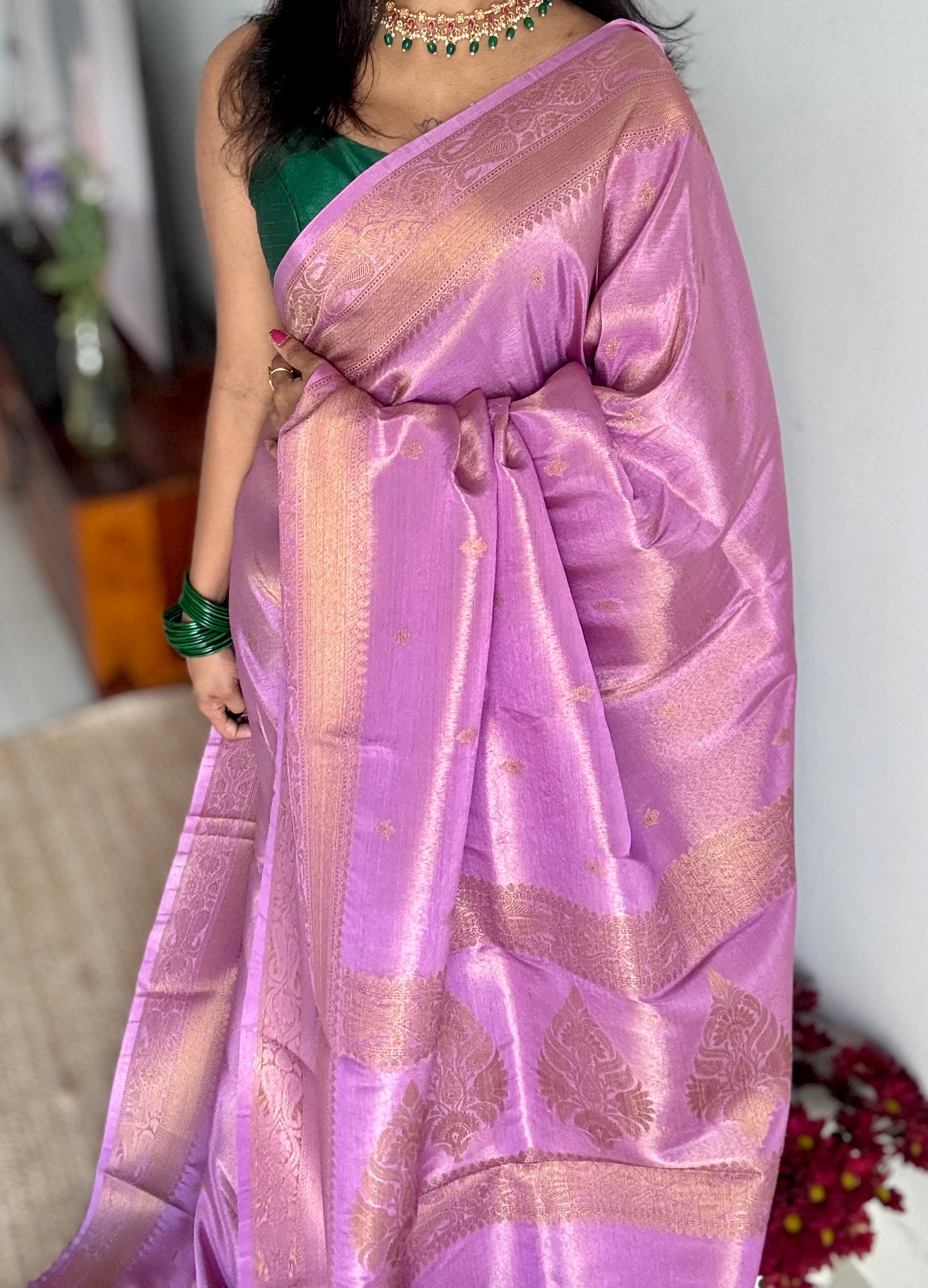 Lilac dual tone with gold in soft tissue silk - festive, timeless, and perfect for Diwali. Intricate pallu and blouse fabric. Effortless to drape, light to carry, and rich in look, this is a saree made to shine with you this season.