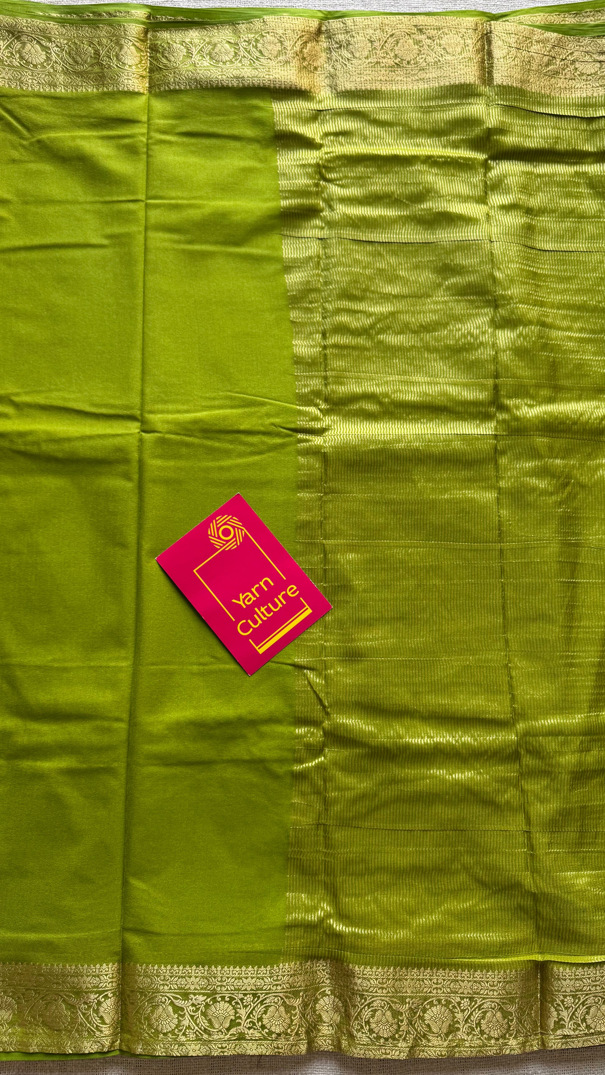 A sweet lime green Mysore semi crepe silk saree featuring elegant floral zari borders and a rich zari pallu. Lightweight, soft, and easy to drape, it is perfect for festive occasions, formal gatherings, and refined everyday elegance.