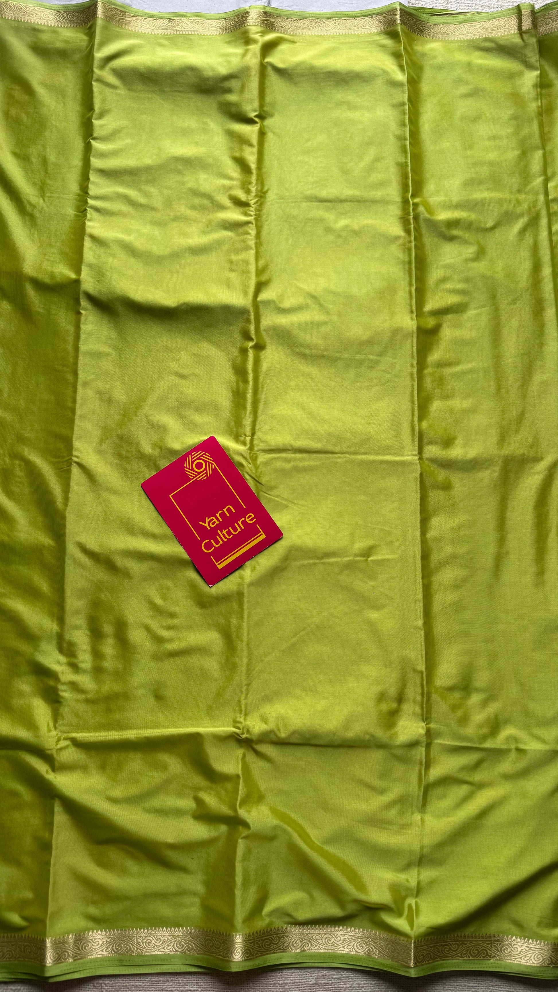 Lime green mysore semi-silk with zari border - festive, timeless, and perfect for Diwali for those who love to keep it minimal. Effortless to drape, light to carry, and rich in look, this is a saree made to shine with you this season.