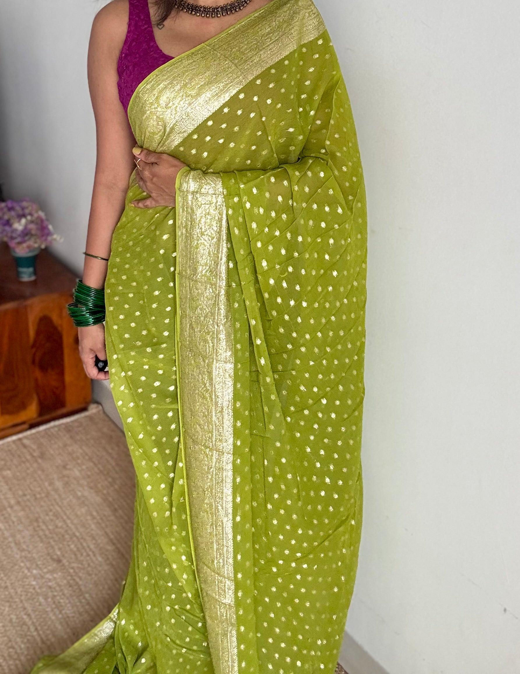 Lime green viscose georgette saree with zari motifs. Comes with a running blouse.