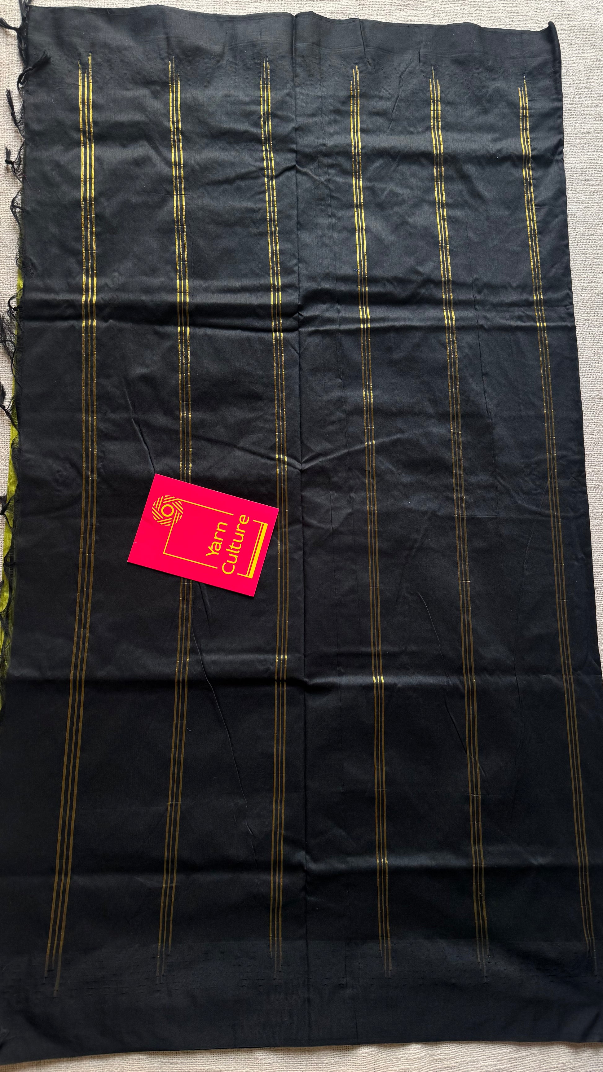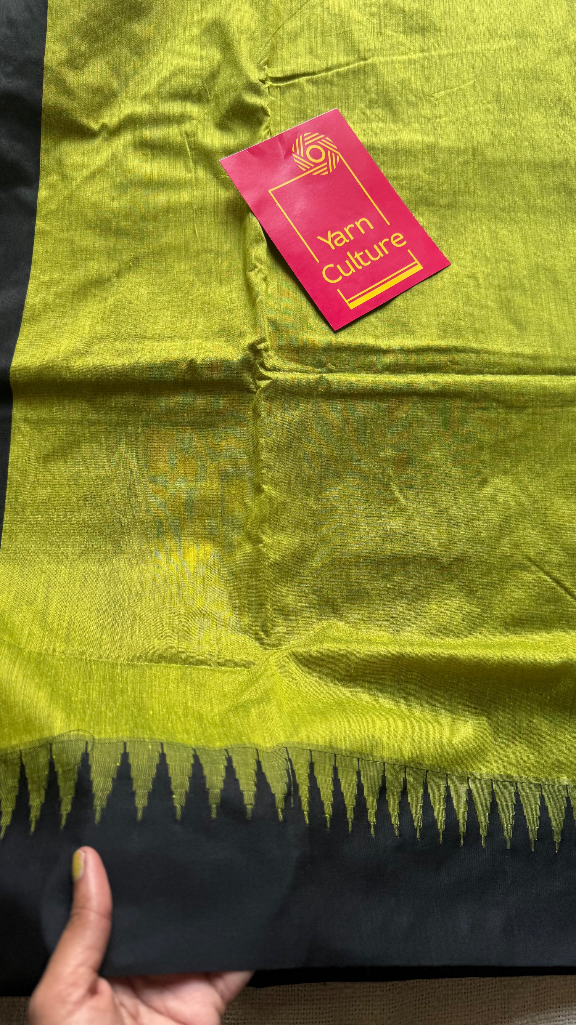 Lime green with black contrast, temple border saree, cotton silk - YCCOTNTBFE60
