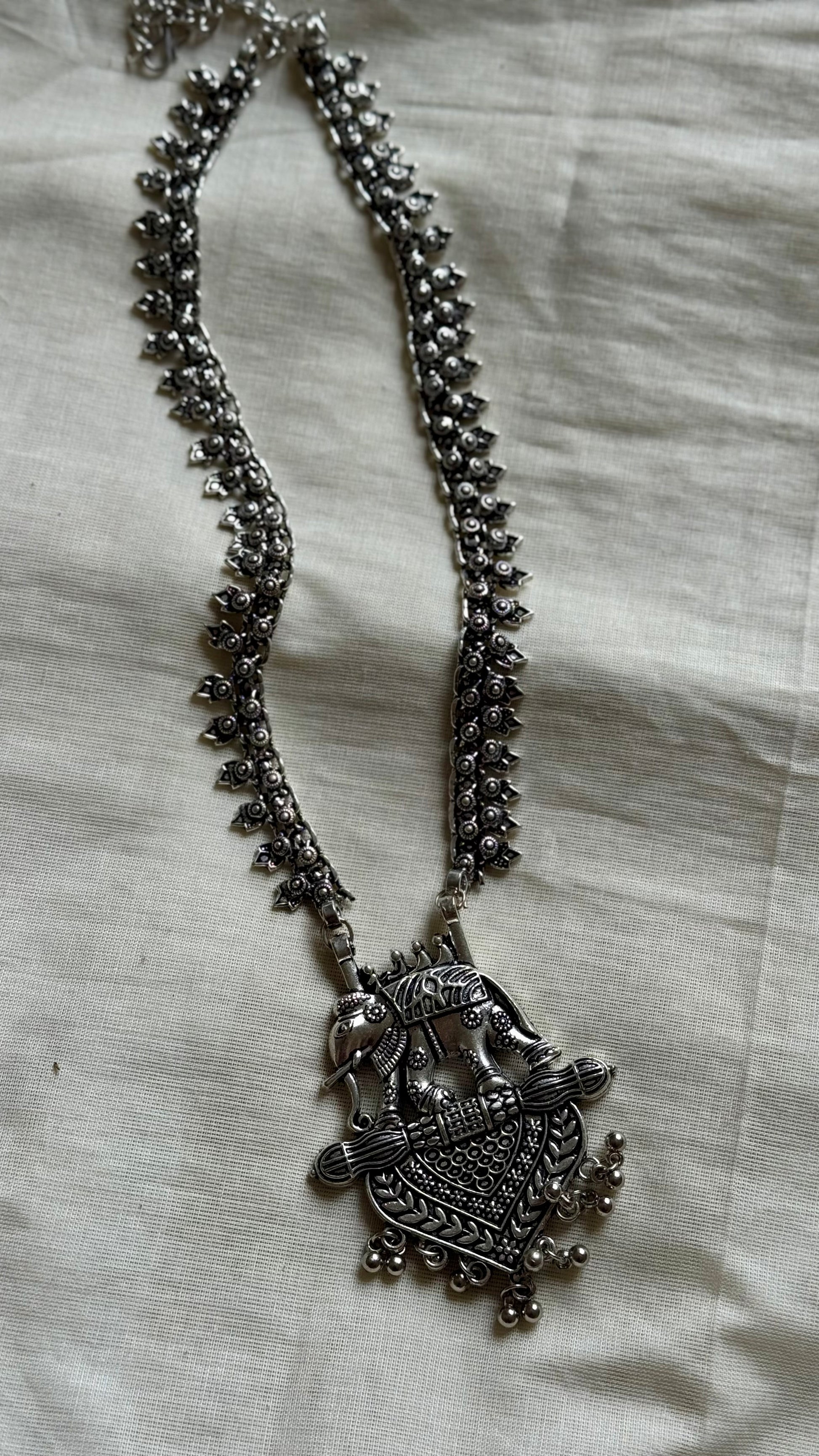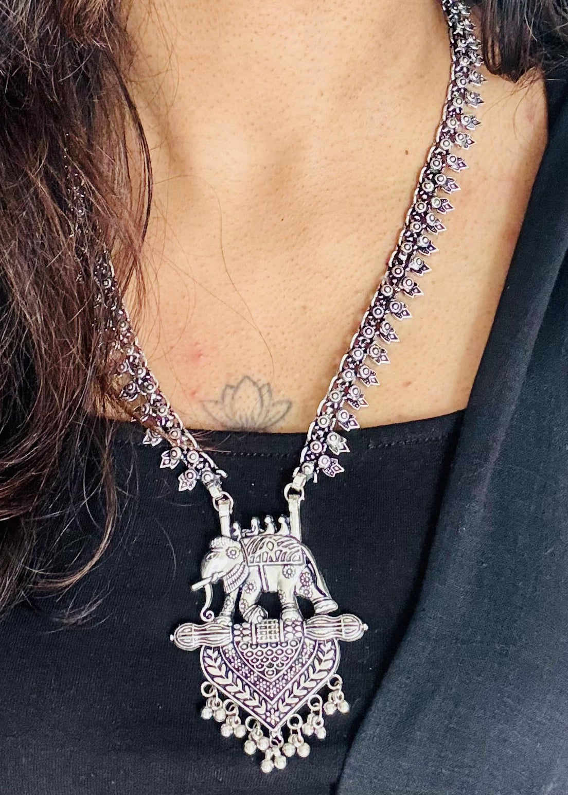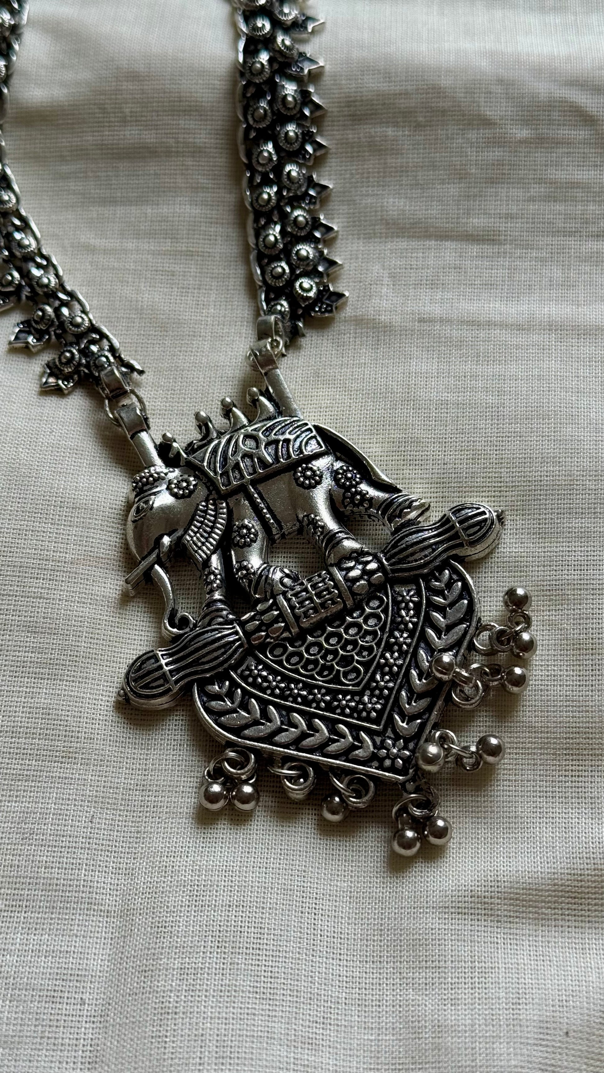 Long neckpiece with elephant pendant, oxidised silver - YCOSNP440a