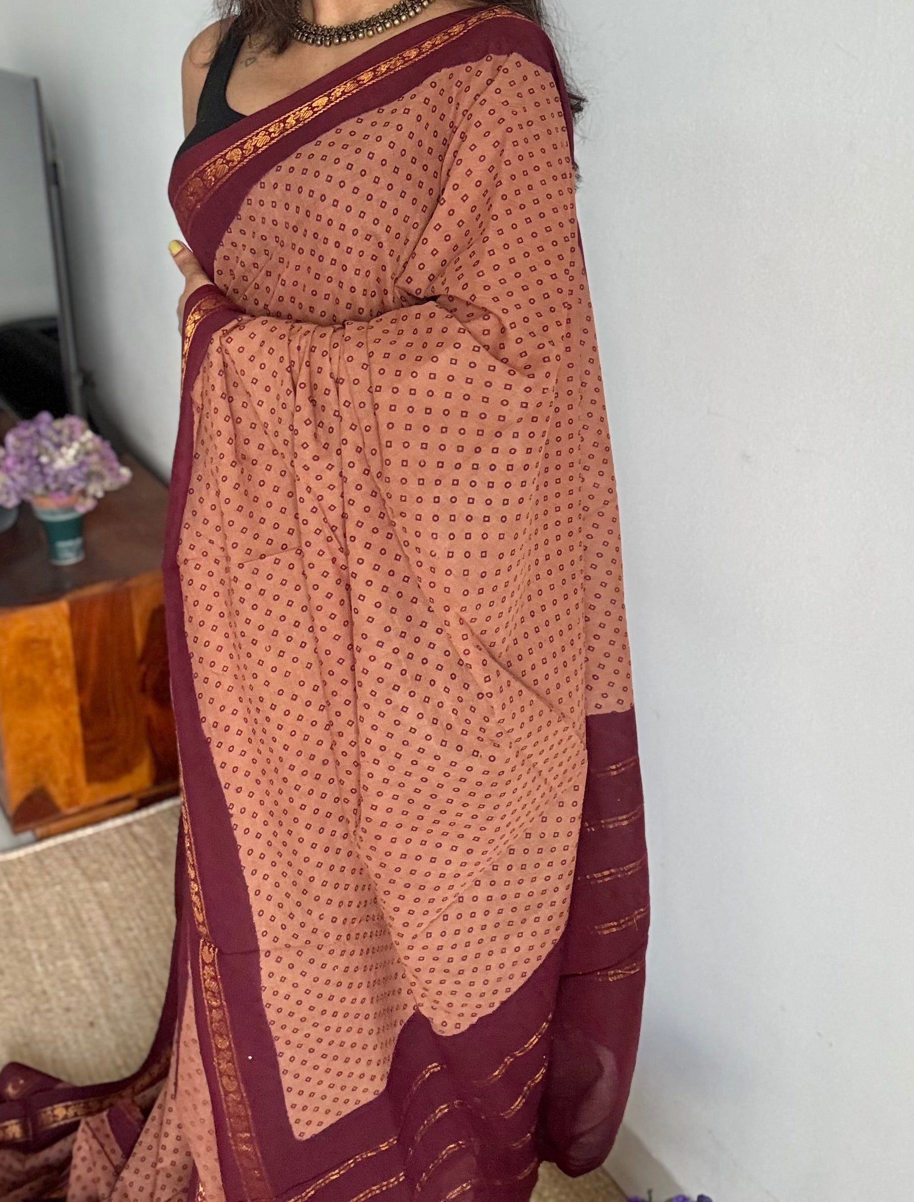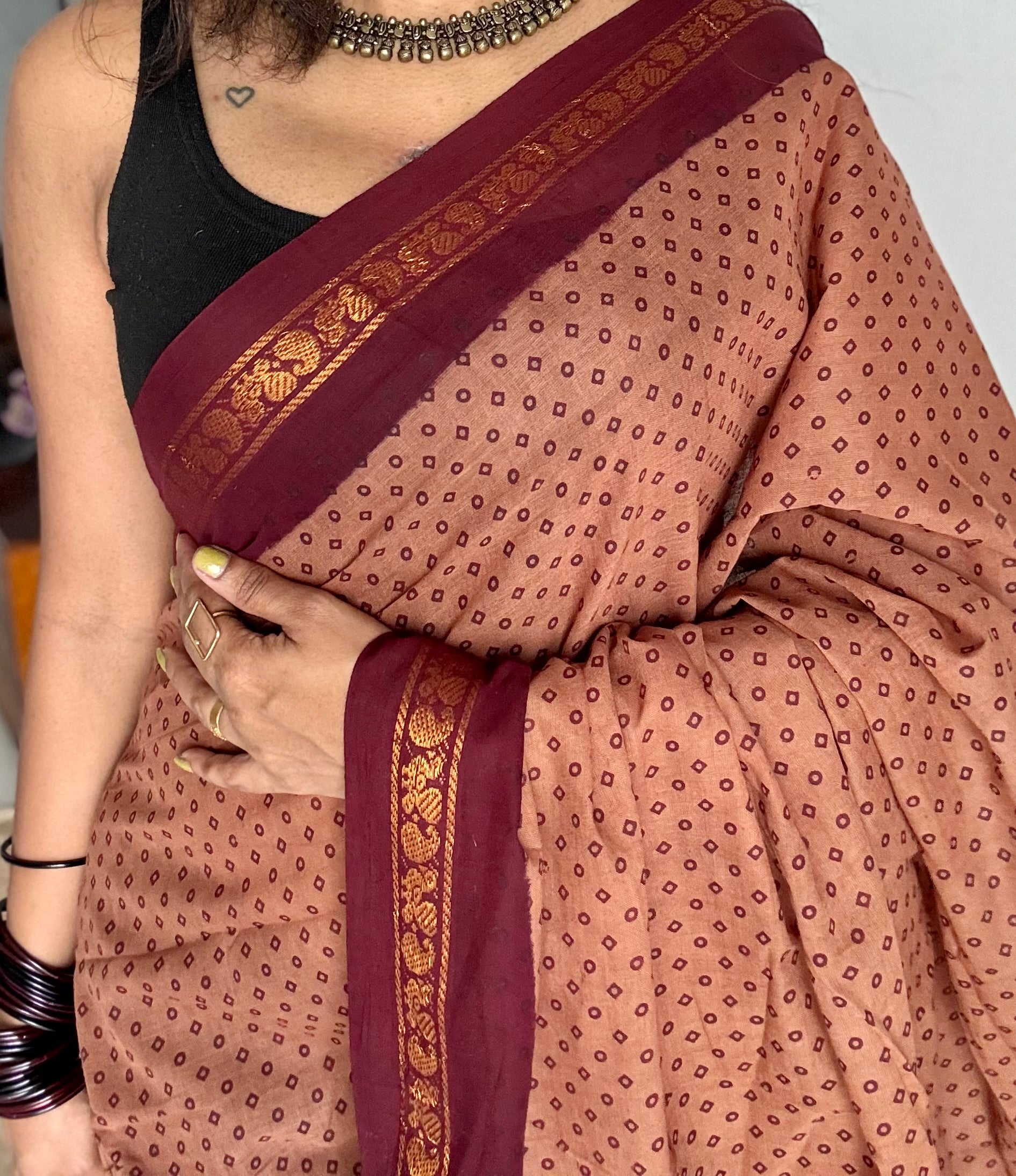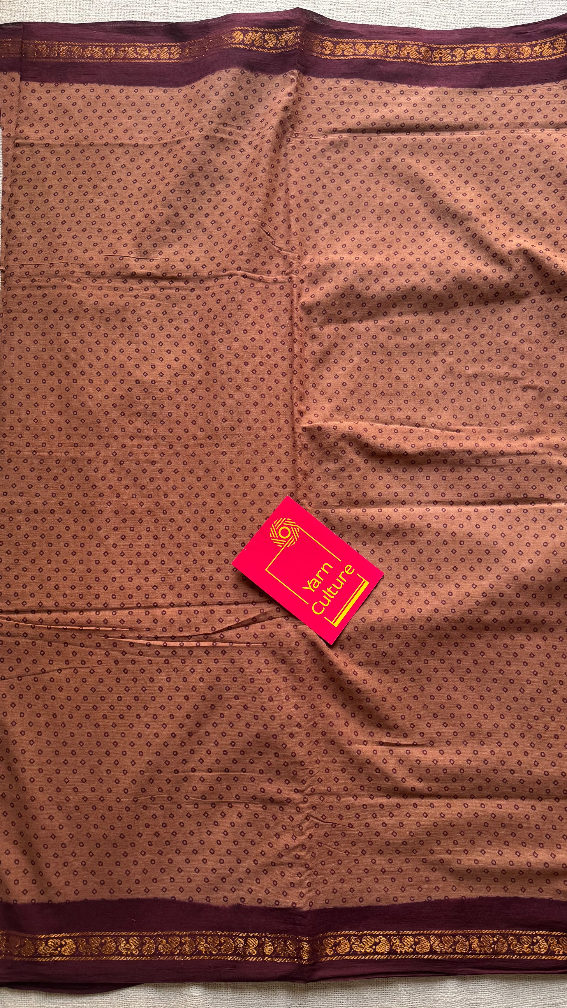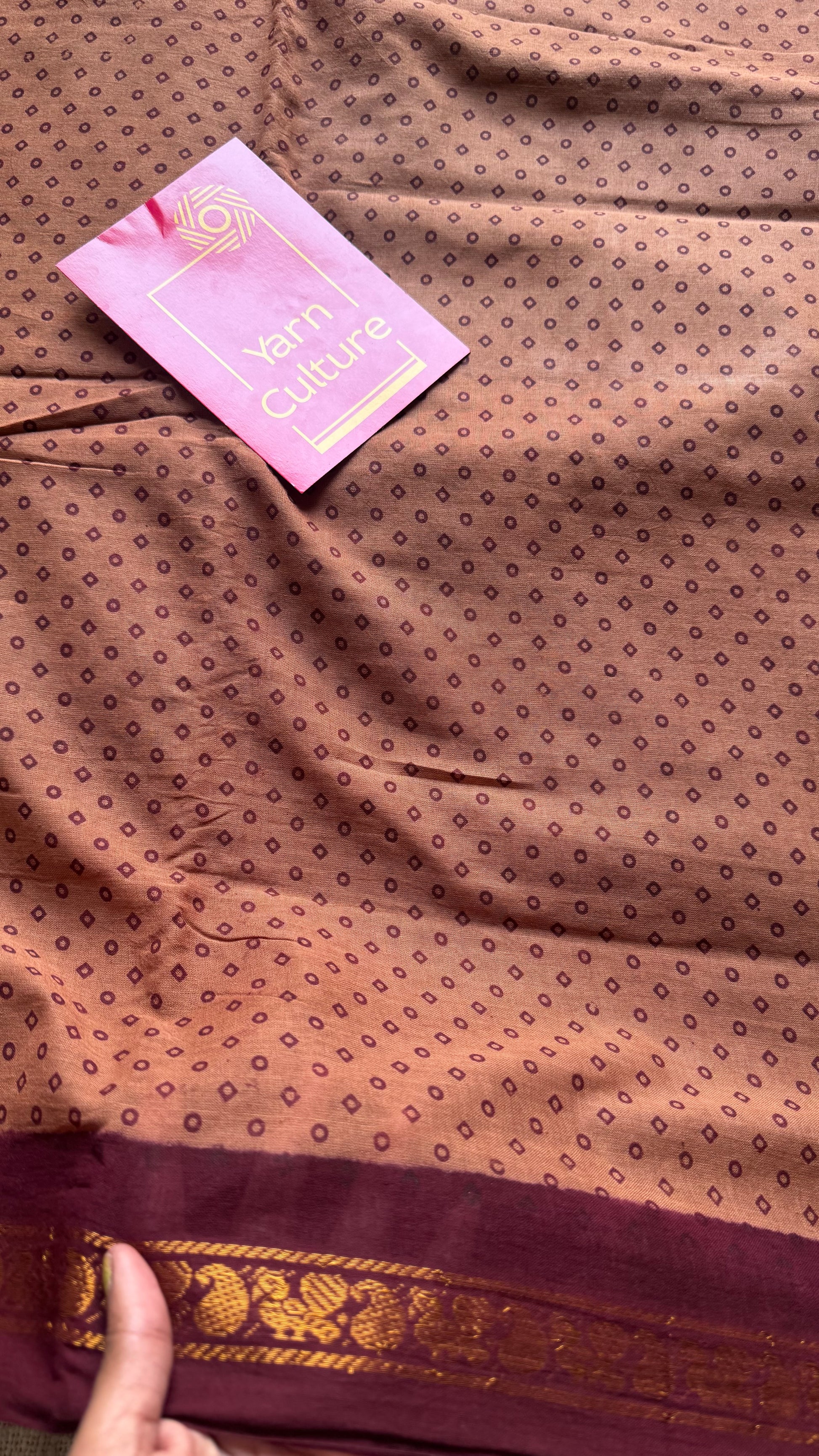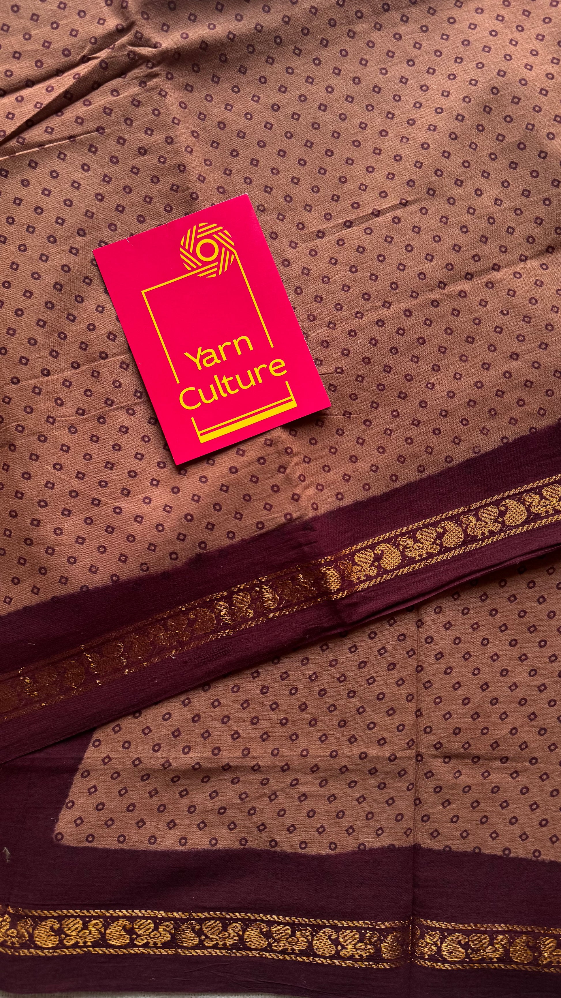 Madisar saree (9 yards) - Light brown with maroon, motif printed, kattuchayam dyed madurai sungudi cotton saree - YCCOTNMSFE79